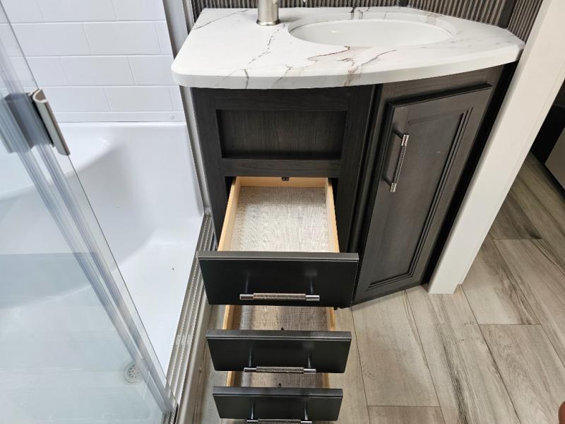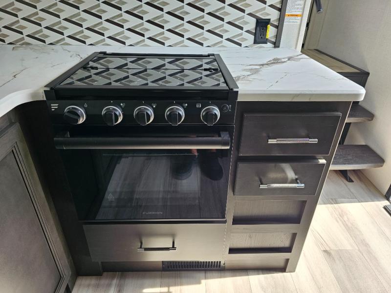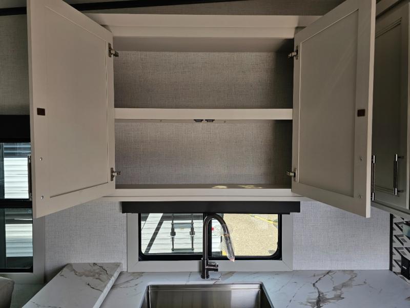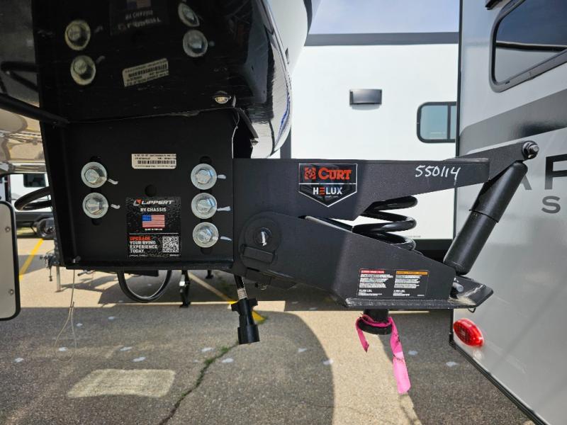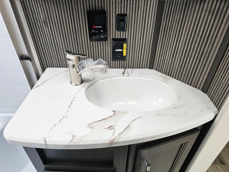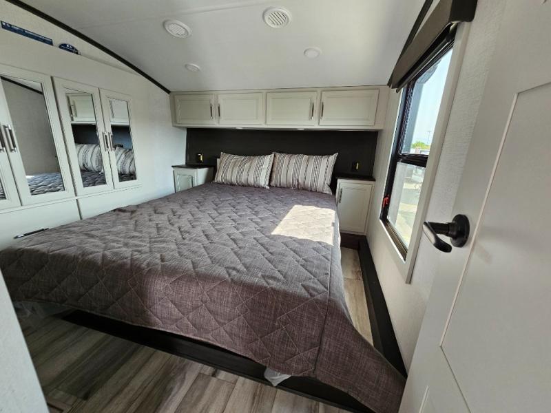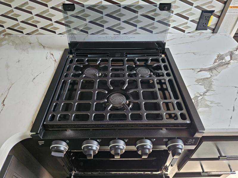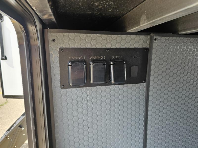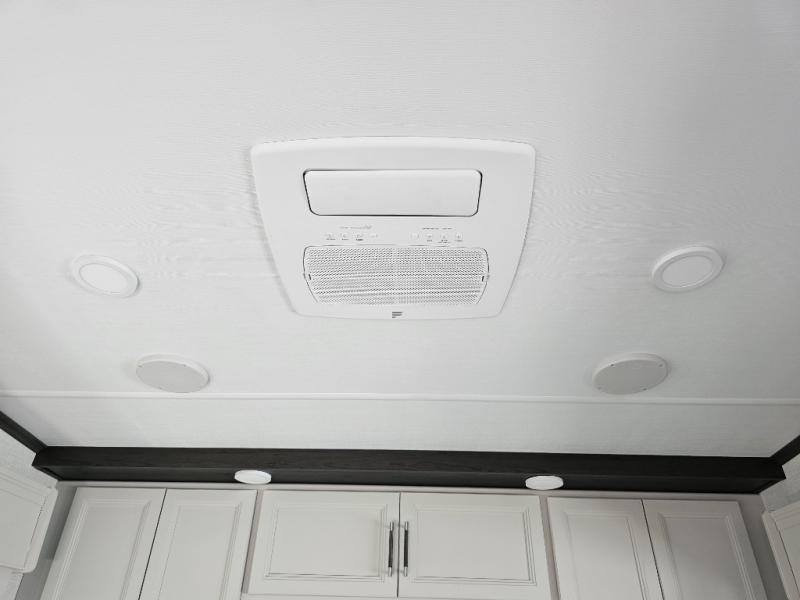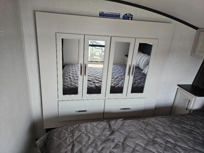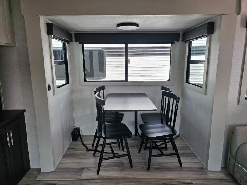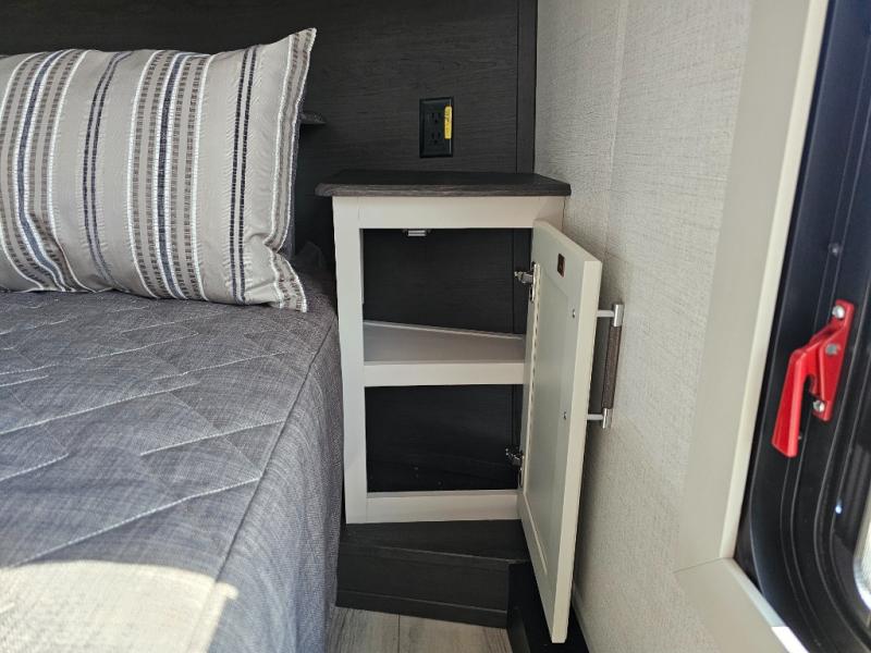 Camping is made easy in this fifth wheel! Once you arrive at the campground, you can enter in through the Composite Stow Away steps and start cooking a delicious meal in the middle kitchen with the 21" Furrion range with Piezo ignition,12V "Solar Friendly" refrigerator, and 0.9 cu. ft. microwave to pop a bag of popcorn for movie night. The rear living area offers a more at-home feel with a rear entertainment center with a fireplace, theater seating, and plenty of space to move about thanks to the opposing slide outs. There is also a free-standing dinette to play card games and enjoy meals and an XL sofa sleeper that extends to a king-size sleeping space. The full bath includes a 48" x 30" shower with a glass door and a skylight for more standing space, and the front private bedroom includes a queen bed for a great night's rest. You'll also find a wardrobe slide here and two two nightstands with an outlet to charge your electronics.