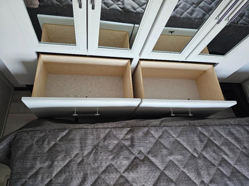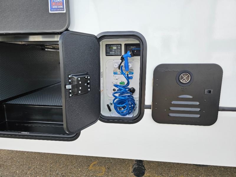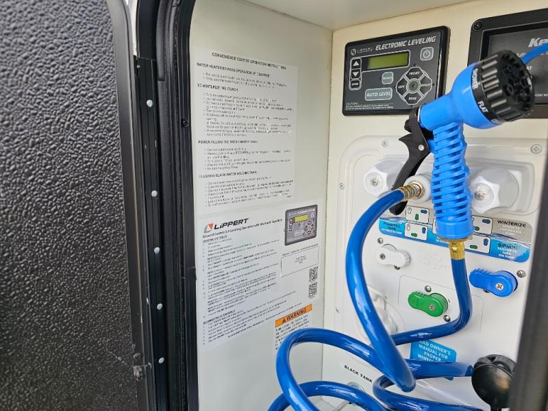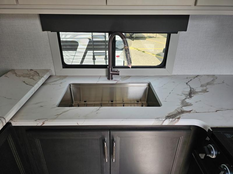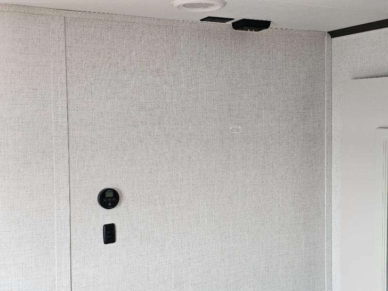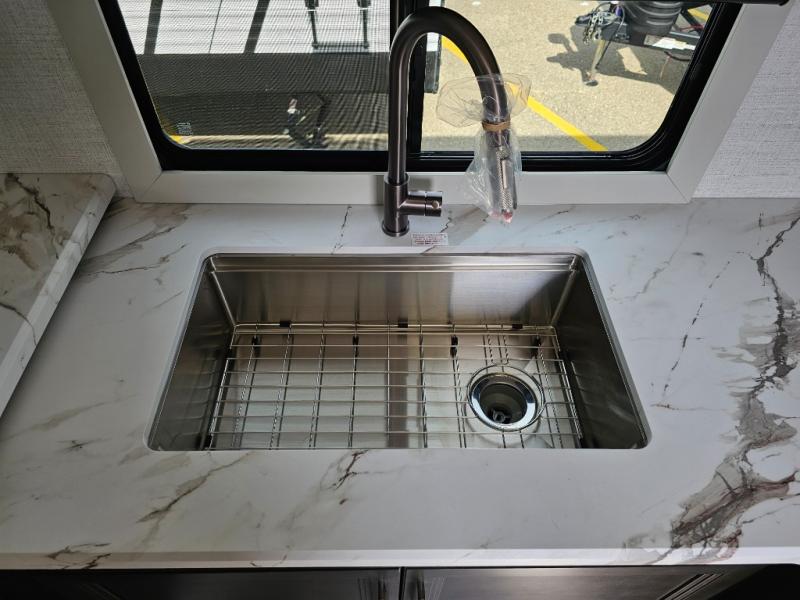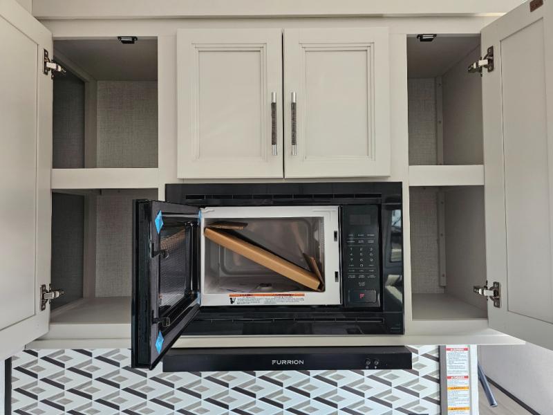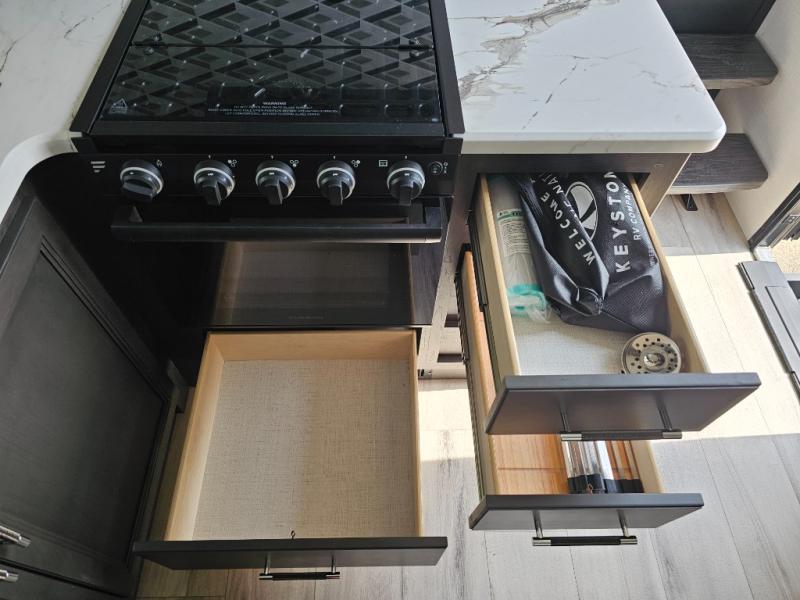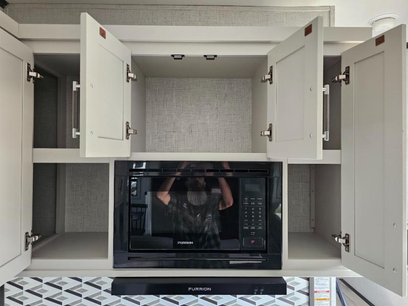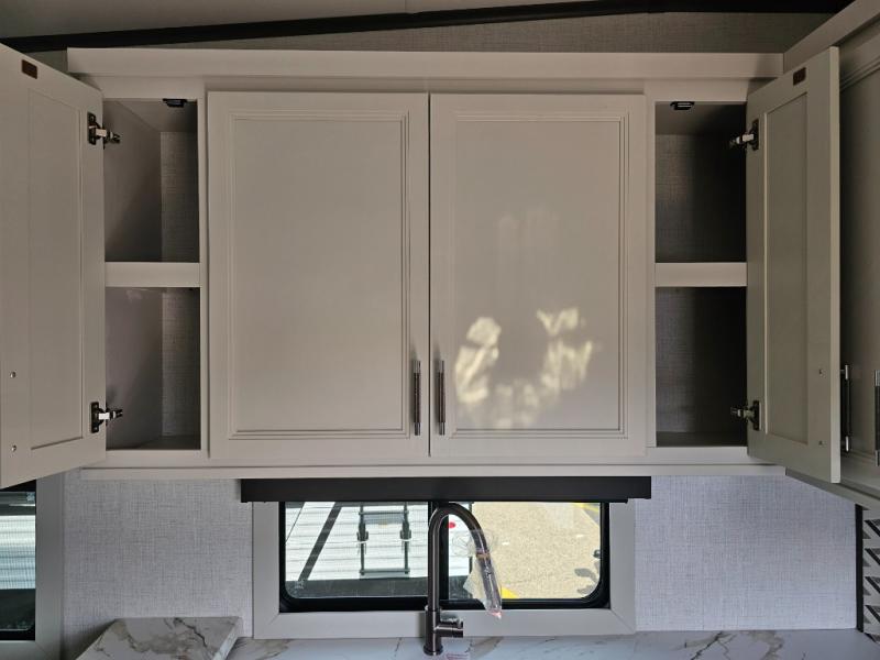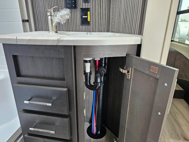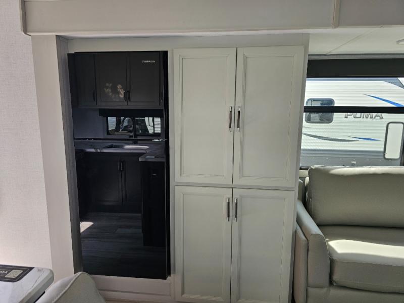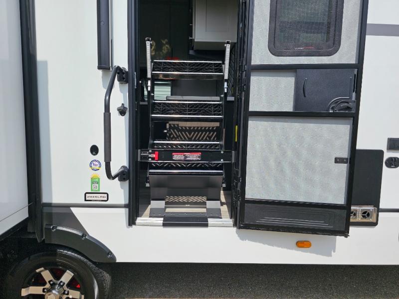 Camping is made easy in this fifth wheel! Once you arrive at the campground, you can enter in through the Composite Stow Away steps and start cooking a delicious meal in the middle kitchen with the 21" Furrion range with Piezo ignition,12V "Solar Friendly" refrigerator, and 0.9 cu. ft. microwave to pop a bag of popcorn for movie night. The rear living area offers a more at-home feel with a rear entertainment center with a fireplace, theater seating, and plenty of space to move about thanks to the opposing slide outs. There is also a free-standing dinette to play card games and enjoy meals and an XL sofa sleeper that extends to a king-size sleeping space. The full bath includes a 48" x 30" shower with a glass door and a skylight for more standing space, and the front private bedroom includes a queen bed for a great night's rest. You'll also find a wardrobe slide here and two two nightstands with an outlet to charge your electronics.