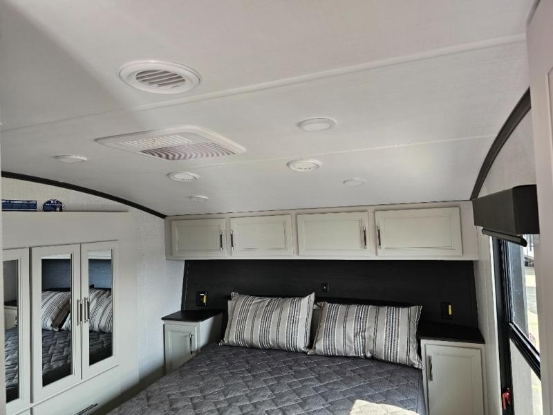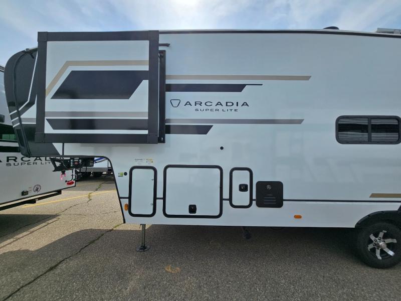 With any Arcadia Super Lite fifth wheel by Keystone, you will enjoy easy-to-tow lengths, unmatched storage, and plenty of windows to let the outdoor views in. The structural I-beam frame will provide a strong foundation to your RV, and the Full pass-through storage for all your equipment and camping gear. You will be able to camp in cold and hot climates thanks to the Peak Weather Package that includes a heated and enclosed underbelly, two Furrion A/C for cool temperatures in the summer, and Keystone's exclusive HyperDeck floor that adds an additional layer of insulation to your floor. The interior will make you feel at home with residential hardware, seamless pressed countertops, black roller shades, and ample storage space. Sometimes the best things come in smaller packages; choose a Arcadia Super Lite today!