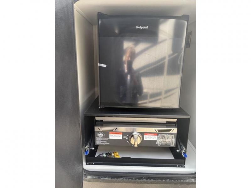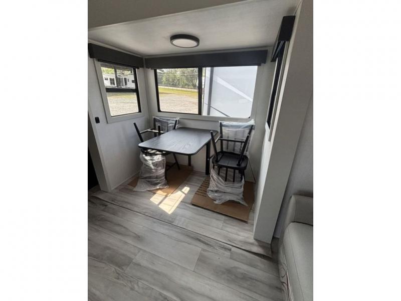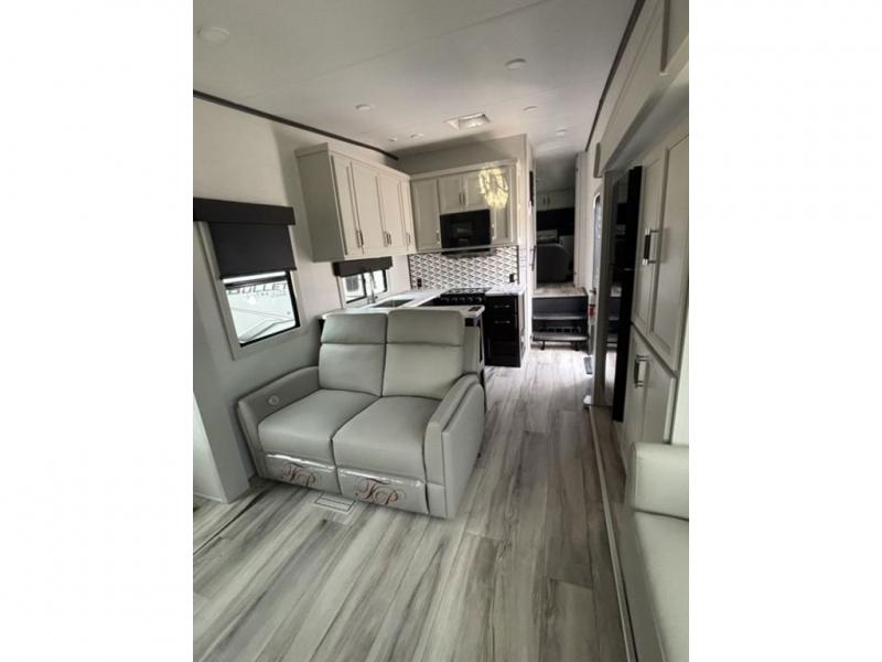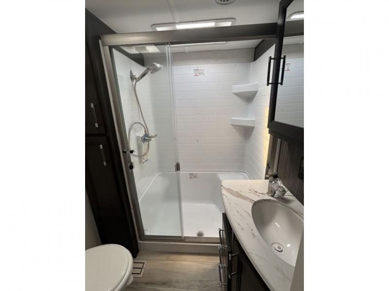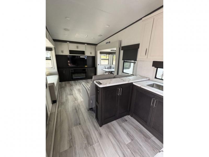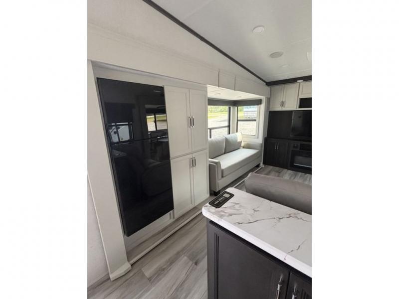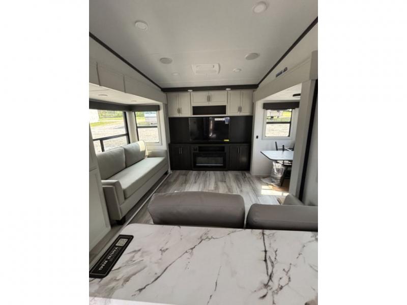 Camping is made easy in this fifth wheel! Once you arrive at the campground, you can enter in through the Composite Stow Away steps and start cooking a delicious meal in the middle kitchen with the 21" Furrion range with Piezo ignition,12V "Solar Friendly" refrigerator, and 0.9 cu. ft. microwave to pop a bag of popcorn for movie night. The rear living area offers a more at-home feel with a rear entertainment center with a fireplace, theater seating, and plenty of space to move about thanks to the opposing slide outs. There is also a free-standing dinette to play card games and enjoy meals and an XL sofa sleeper that extends to a king-size sleeping space. The full bath includes a 48" x 30" shower with a glass door and a skylight for more standing space, and the front private bedroom includes a queen bed for a great night's rest. You'll also find a wardrobe slide here and two two nightstands with an outlet to charge your electronics.