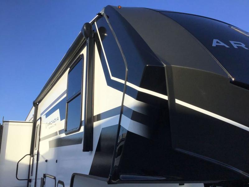 With any Arcadia Super Lite fifth wheel by Keystone, you will enjoy easy-to-tow lengths, unmatched storage, and plenty of windows to let the outdoor views in. The structural I-beam frame will provide a strong foundation to your RV, and the Full pass-through storage for all your equipment and camping gear. You will be able to camp in cold and hot climates thanks to the Peak Weather Package that includes a heated and enclosed underbelly, two Furrion A/C for cool temperatures in the summer, and Keystone's exclusive HyperDeck floor that adds an additional layer of insulation to your floor. The interior will make you feel at home with residential hardware, seamless pressed countertops, black roller shades, and ample storage space. Sometimes the best things come in smaller packages; choose a Arcadia Super Lite today!