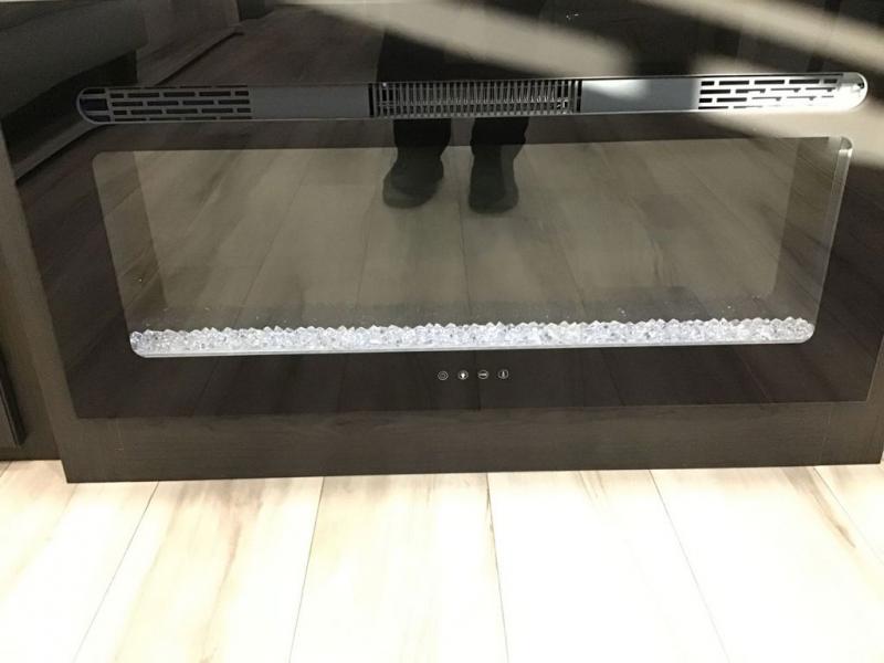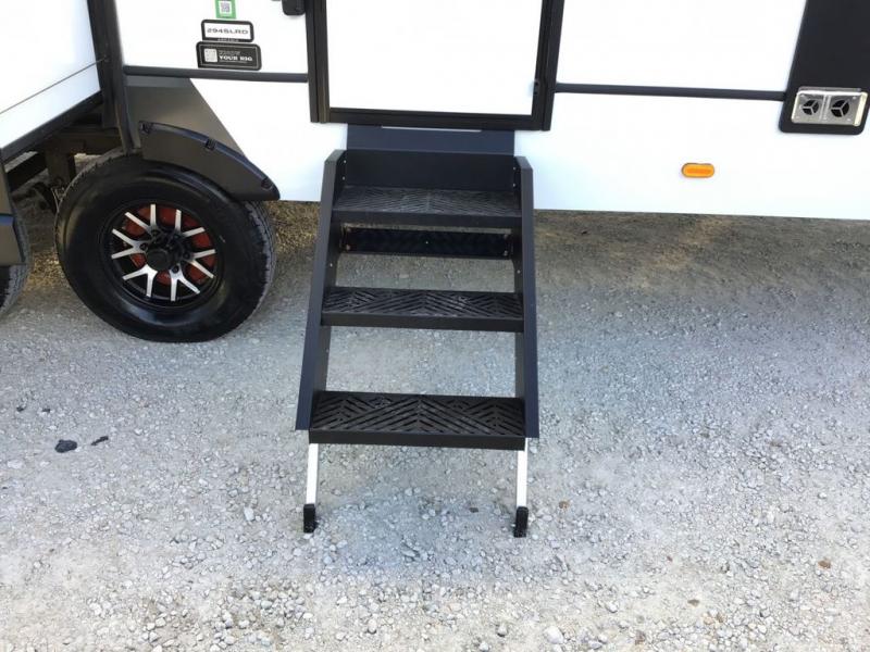 Camping is made easy in this fifth wheel! Once you arrive at the campground, you can enter in through the Composite Stow Away steps and start cooking a delicious meal in the middle kitchen with the 21" Furrion range with Piezo ignition,12V "Solar Friendly" refrigerator, and 0.9 cu. ft. microwave to pop a bag of popcorn for movie night. The rear living area offers a more at-home feel with a rear entertainment center with a fireplace, theater seating, and plenty of space to move about thanks to the opposing slide outs. There is also a free-standing dinette to play card games and enjoy meals and an XL sofa sleeper that extends to a king-size sleeping space. The full bath includes a 48" x 30" shower with a glass door and a skylight for more standing space, and the front private bedroom includes a queen bed for a great night's rest. You'll also find a wardrobe slide here and two two nightstands with an outlet to charge your electronics.