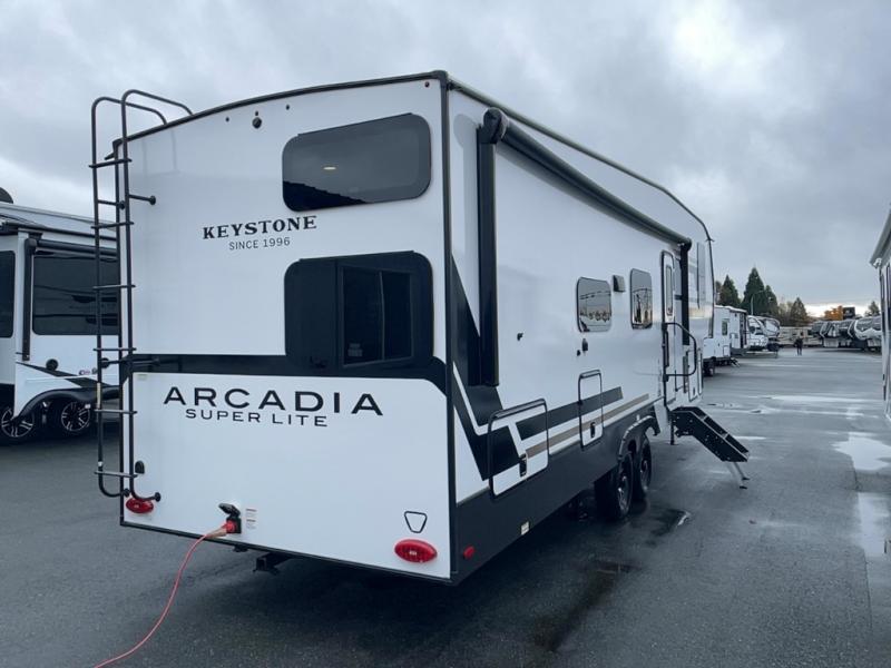 With any Arcadia Super Lite fifth wheel by Keystone, you will enjoy easy-to-tow lengths, unmatched storage, and plenty of windows to let the outdoor views in. The structural I-beam frame will provide a strong foundation to your RV, and the Full pass-through storage for all your equipment and camping gear. You will be able to camp in cold and hot climates thanks to the Peak Weather Package that includes a heated and enclosed underbelly, two Furrion A/C for cool temperatures in the summer, and Keystone's exclusive HyperDeck floor that adds an additional layer of insulation to your floor. The interior will make you feel at home with residential hardware, seamless pressed countertops, black roller shades, and ample storage space. Sometimes the best things come in smaller packages; choose a Arcadia Super Lite today!