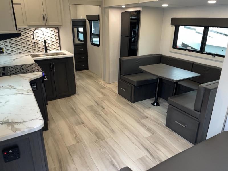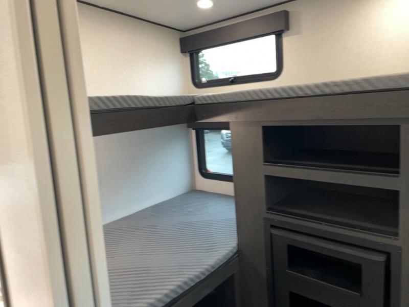 This Arcadia Super Lite model is thoughtfully designed to accommodate both comfort and functionality for the whole gang. In the back, the spacious bunkhouse features three bunks, a built-in dresser, and a convenient pull-out counter/desk, perfect for activities for the little ones or extra workspace. At the heart of the unit, the cozy middle living area includes a large U-shaped dinette, creating the ideal space for shared meals, game nights, or relaxing together. The full bathroom offers enhanced accessibility with a built-in seat in the shower, making it comfortable for everyone. Up front, the private bedroom provides a restful retreat with a queen bed and a wardrobe slide-out, offering plenty of room to store clothes and belongings.