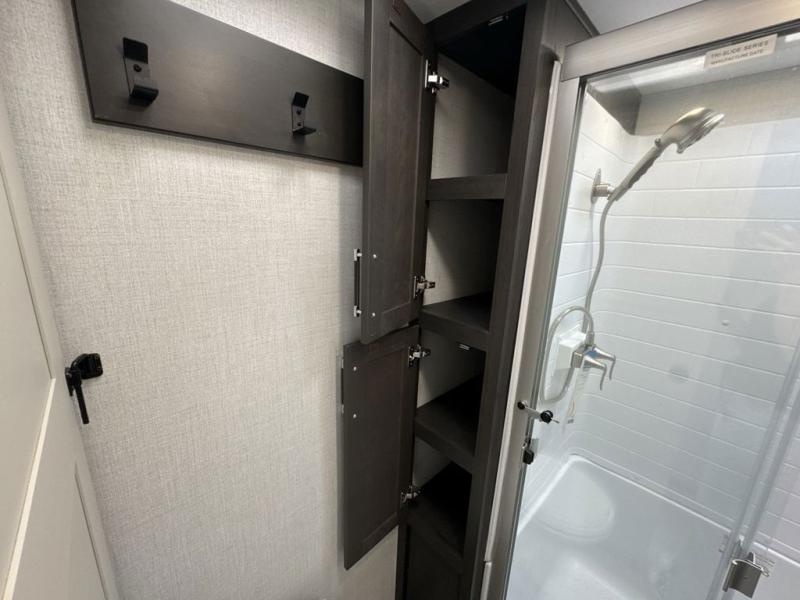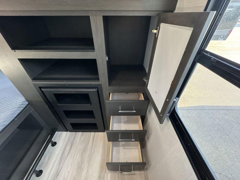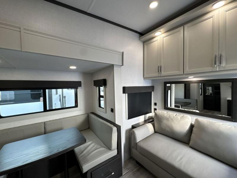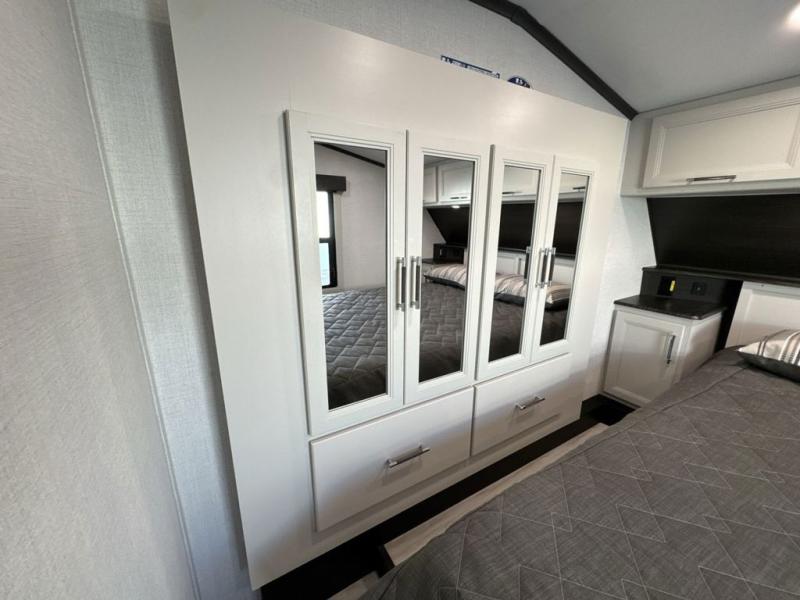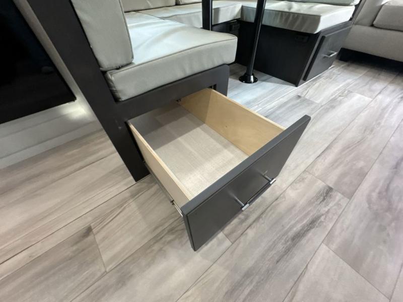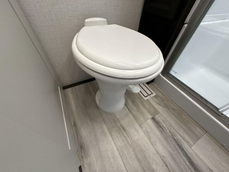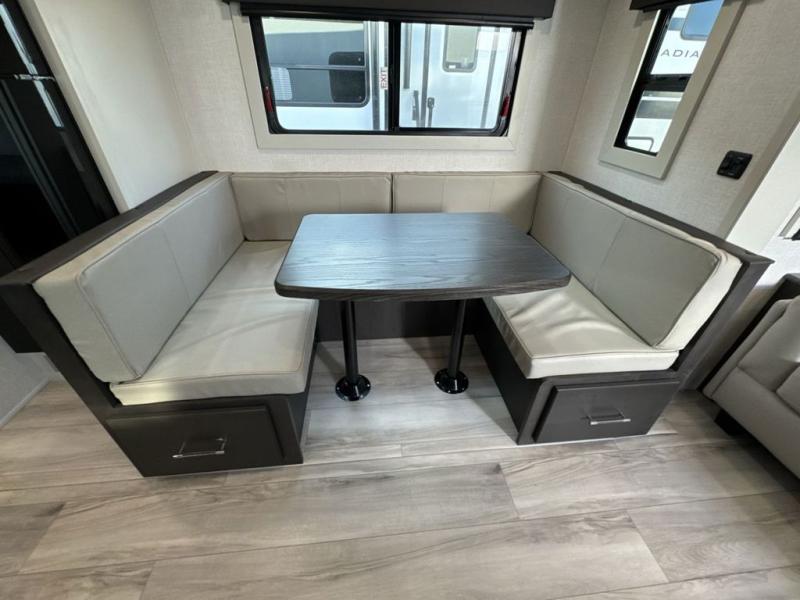 This Arcadia Super Lite model is thoughtfully designed to accommodate both comfort and functionality for the whole gang. In the back, the spacious bunkhouse features three bunks, a built-in dresser, and a convenient pull-out counter/desk, perfect for activities for the little ones or extra workspace. At the heart of the unit, the cozy middle living area includes a large U-shaped dinette, creating the ideal space for shared meals, game nights, or relaxing together. The full bathroom offers enhanced accessibility with a built-in seat in the shower, making it comfortable for everyone. Up front, the private bedroom provides a restful retreat with a queen bed and a wardrobe slide-out, offering plenty of room to store clothes and belongings.