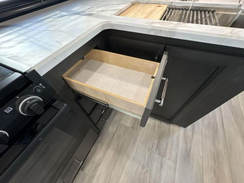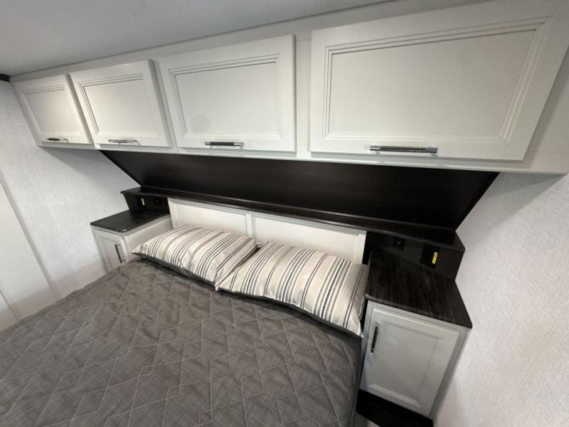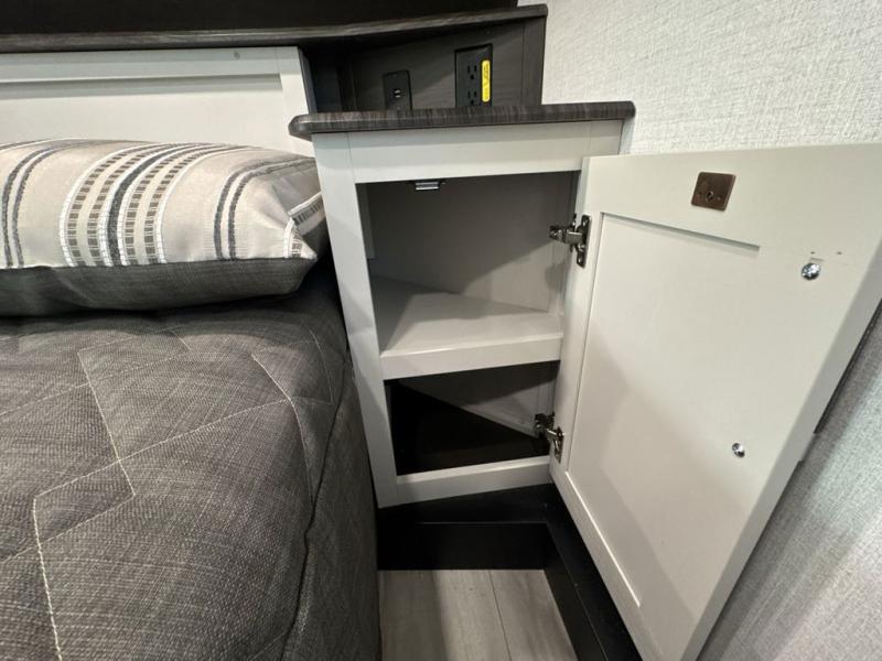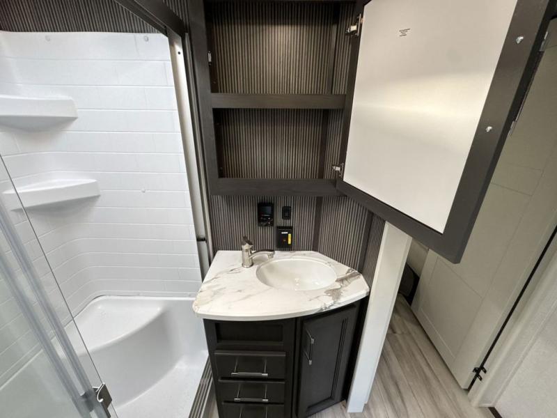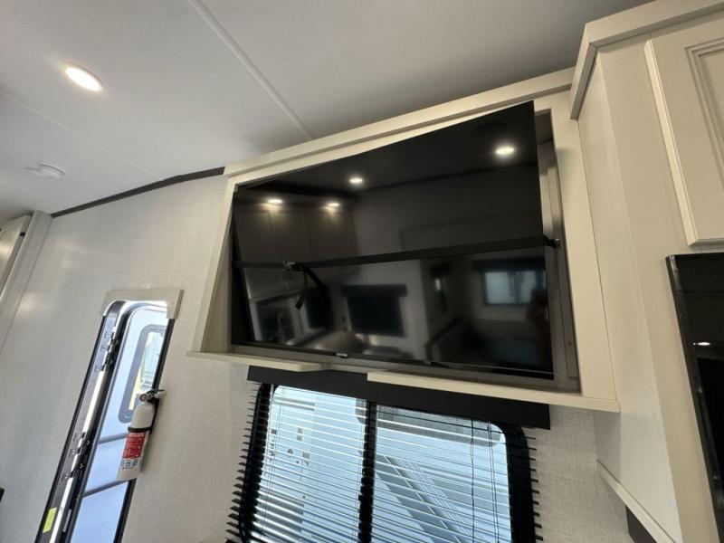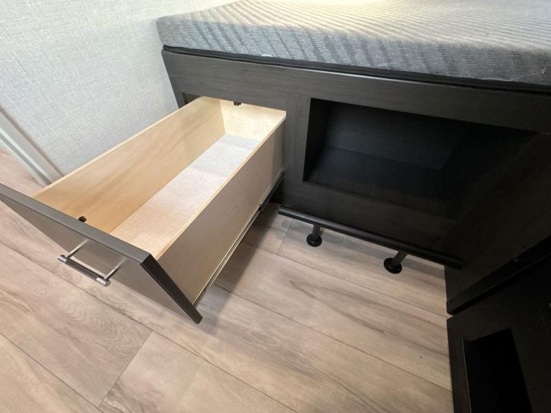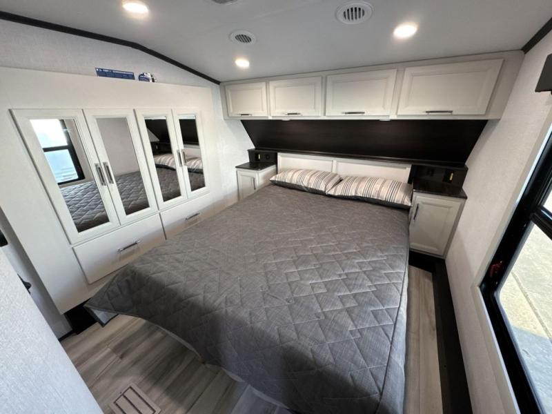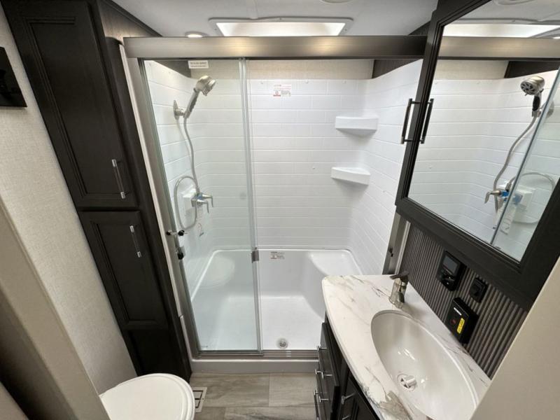 This Arcadia Super Lite model is thoughtfully designed to accommodate both comfort and functionality for the whole gang. In the back, the spacious bunkhouse features three bunks, a built-in dresser, and a convenient pull-out counter/desk, perfect for activities for the little ones or extra workspace. At the heart of the unit, the cozy middle living area includes a large U-shaped dinette, creating the ideal space for shared meals, game nights, or relaxing together. The full bathroom offers enhanced accessibility with a built-in seat in the shower, making it comfortable for everyone. Up front, the private bedroom provides a restful retreat with a queen bed and a wardrobe slide-out, offering plenty of room to store clothes and belongings.