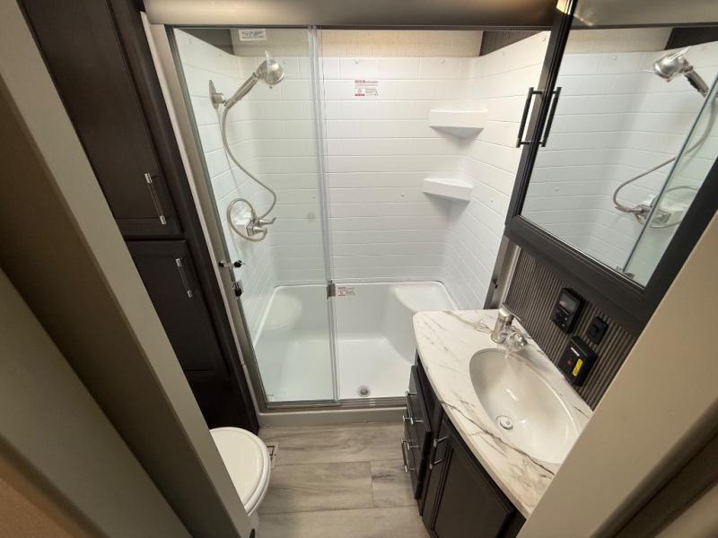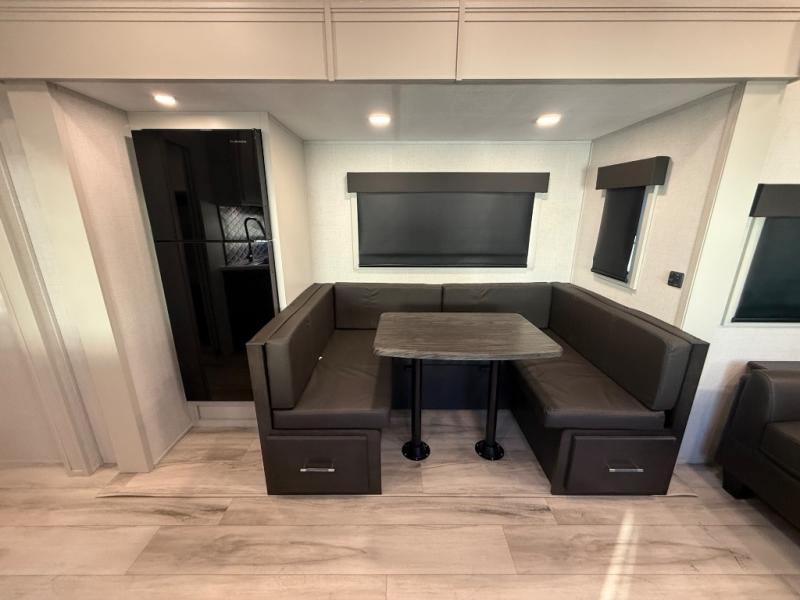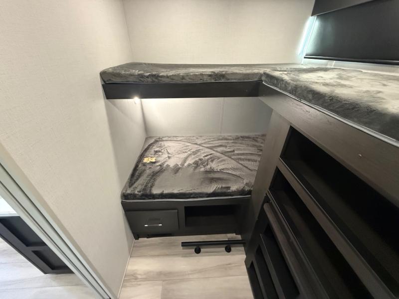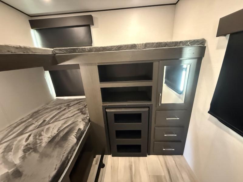This Arcadia Super Lite model is thoughtfully designed to accommodate both comfort and functionality for the whole gang. In the back, the spacious bunkhouse features three bunks, a built-in dresser, and a convenient pull-out counter/desk, perfect for activities for the little ones or extra workspace. At the heart of the unit, the cozy middle living area includes a large U-shaped dinette, creating the ideal space for shared meals, game nights, or relaxing together. The full bathroom offers enhanced accessibility with a built-in seat in the shower, making it comfortable for everyone. Up front, the private bedroom provides a restful retreat with a queen bed and a wardrobe slide-out, offering plenty of room to store clothes and belongings.