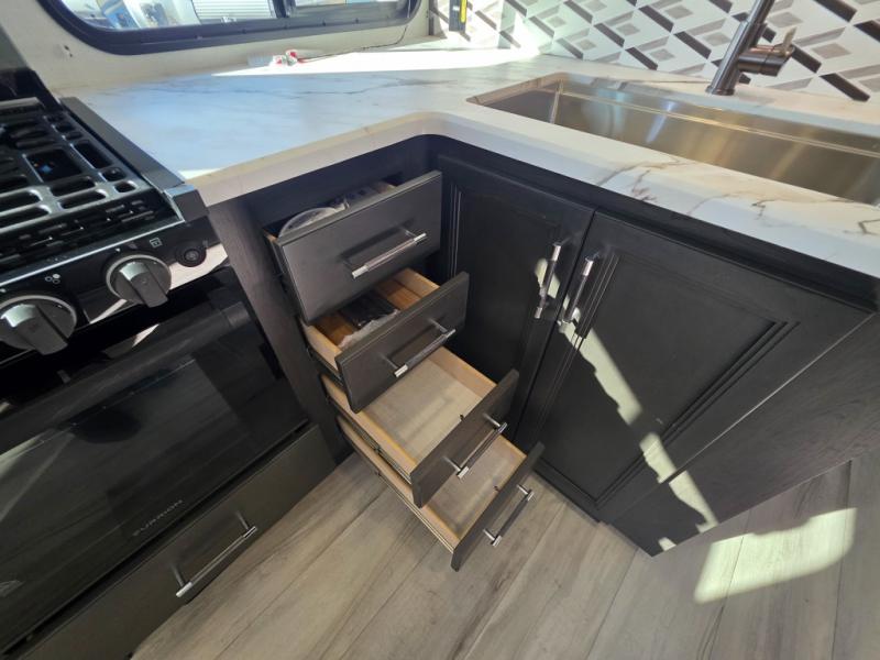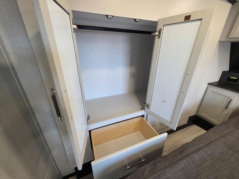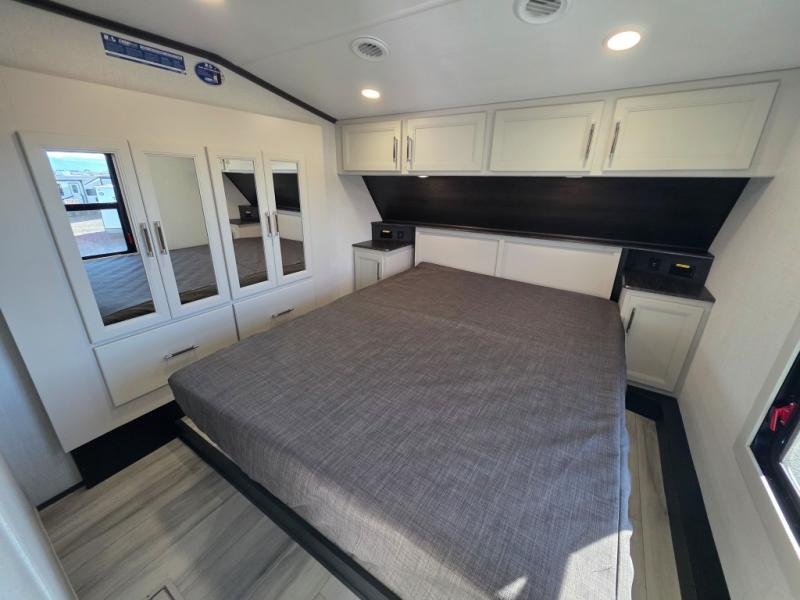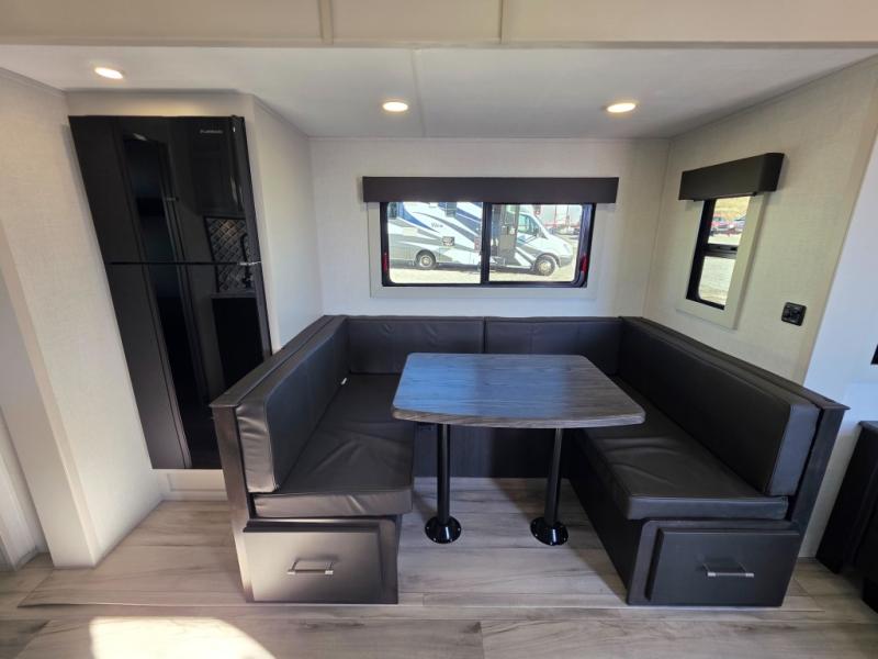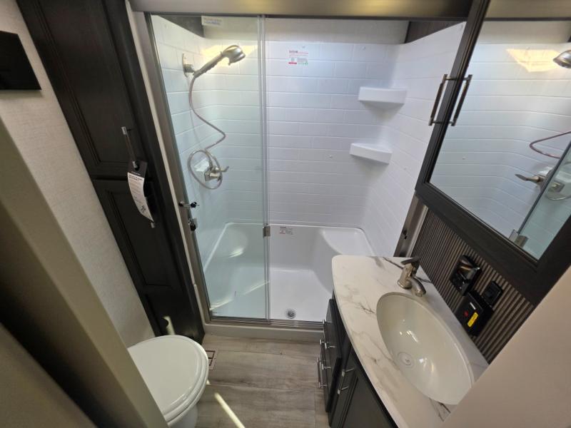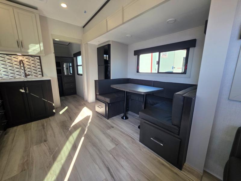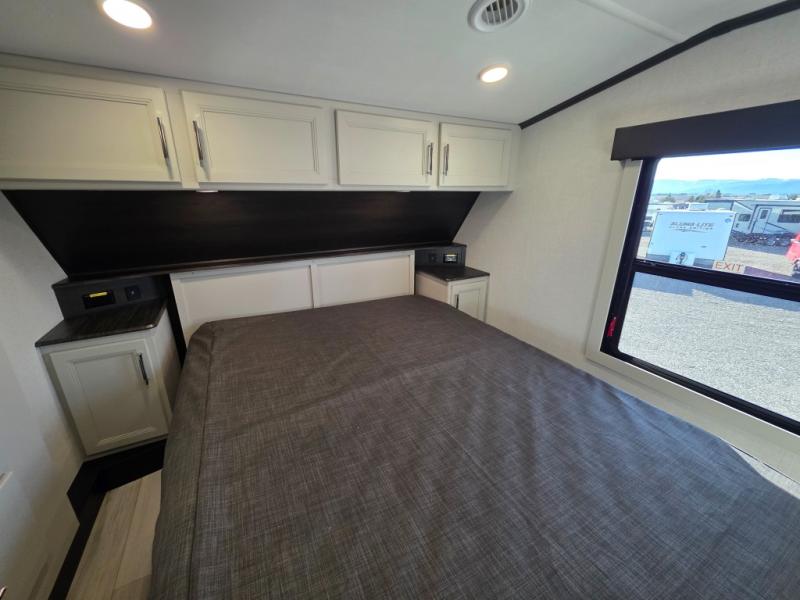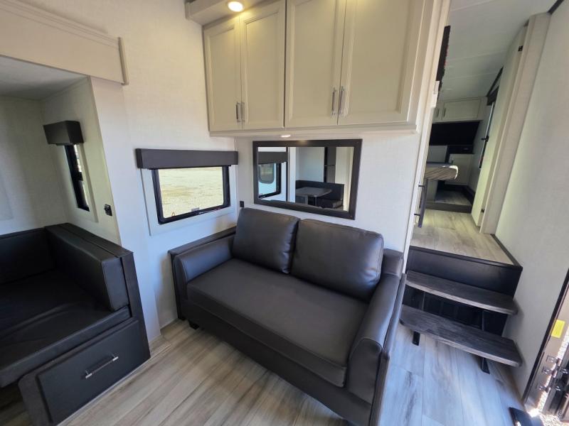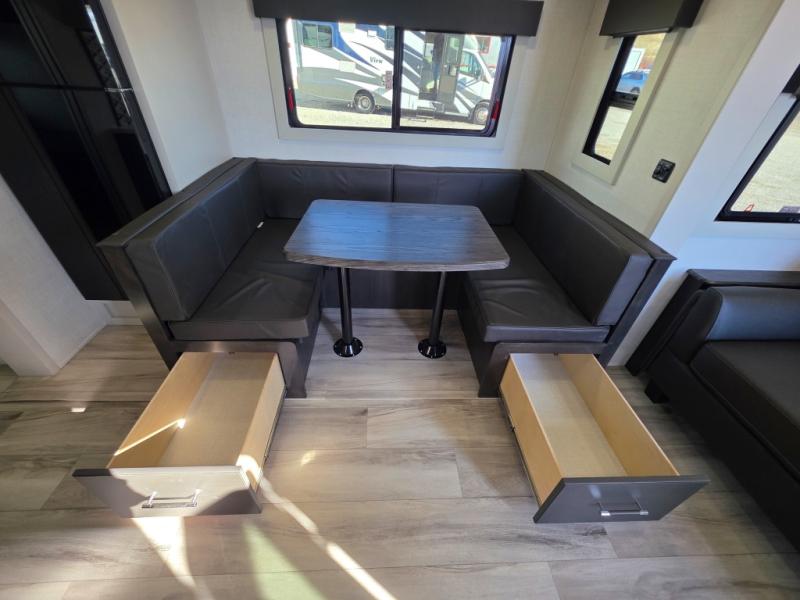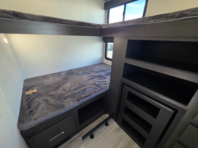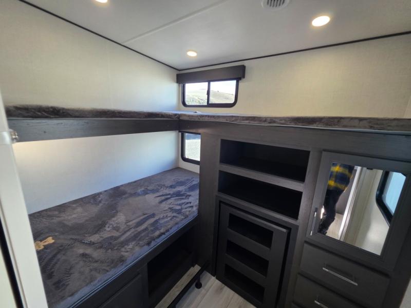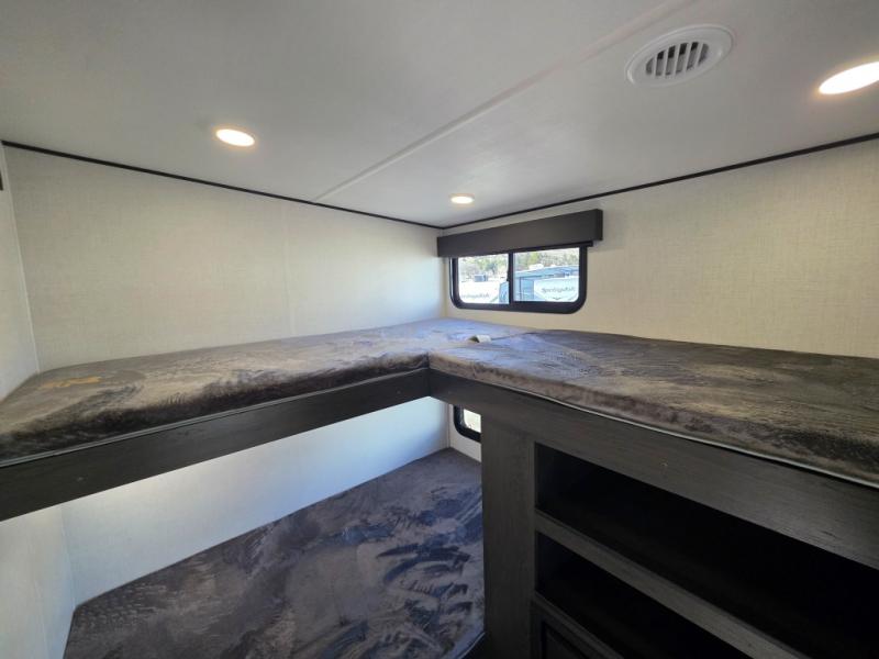 This Arcadia Super Lite model is thoughtfully designed to accommodate both comfort and functionality for the whole gang. In the back, the spacious bunkhouse features three bunks, a built-in dresser, and a convenient pull-out counter/desk, perfect for activities for the little ones or extra workspace. At the heart of the unit, the cozy middle living area includes a large U-shaped dinette, creating the ideal space for shared meals, game nights, or relaxing together. The full bathroom offers enhanced accessibility with a built-in seat in the shower, making it comfortable for everyone. Up front, the private bedroom provides a restful retreat with a queen bed and a wardrobe slide-out, offering plenty of room to store clothes and belongings.
