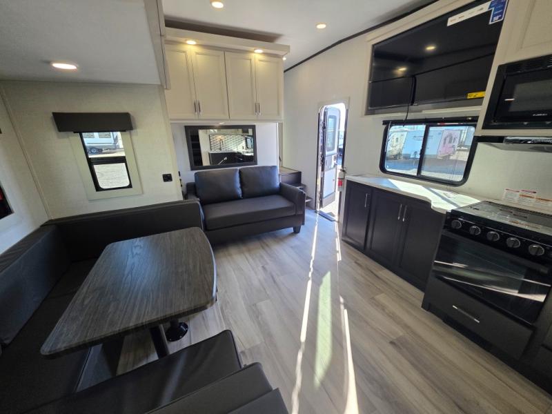 With any Arcadia Super Lite fifth wheel by Keystone, you will enjoy easy-to-tow lengths, unmatched storage, and plenty of windows to let the outdoor views in. The structural I-beam frame will provide a strong foundation to your RV, and the Full pass-through storage for all your equipment and camping gear. You will be able to camp in cold and hot climates thanks to the Peak Weather Package that includes a heated and enclosed underbelly, two Furrion A/C for cool temperatures in the summer, and Keystone's exclusive HyperDeck floor that adds an additional layer of insulation to your floor. The interior will make you feel at home with residential hardware, seamless pressed countertops, black roller shades, and ample storage space. Sometimes the best things come in smaller packages; choose a Arcadia Super Lite today!