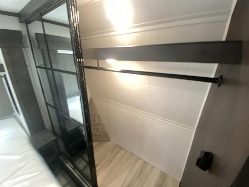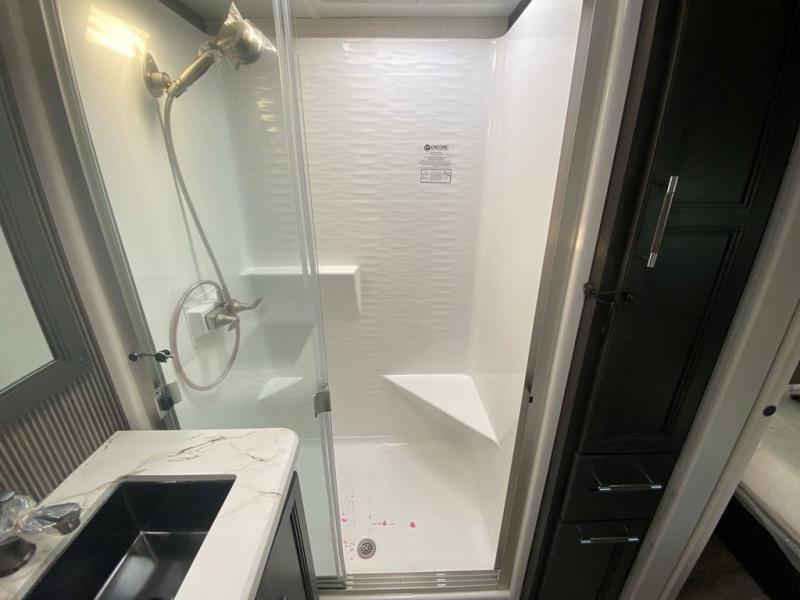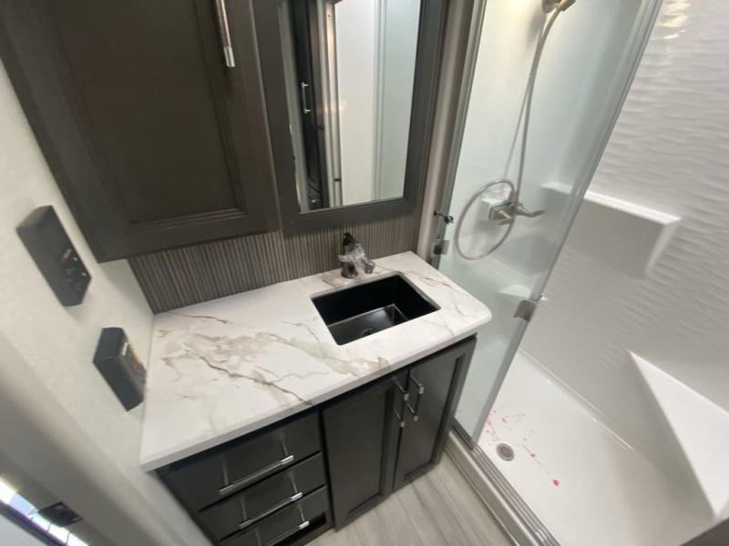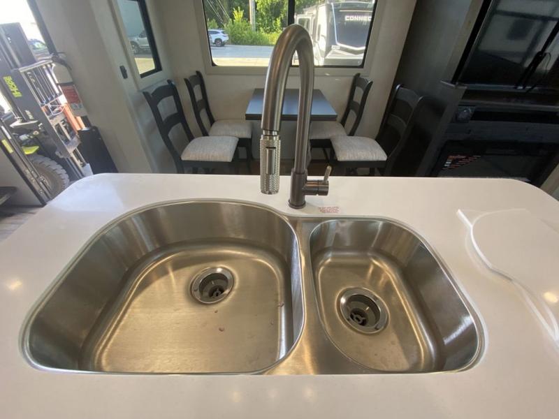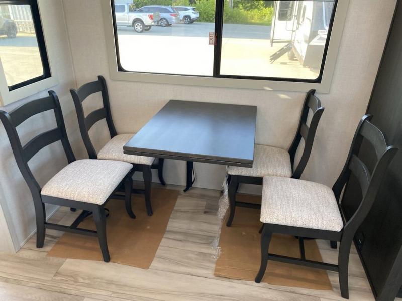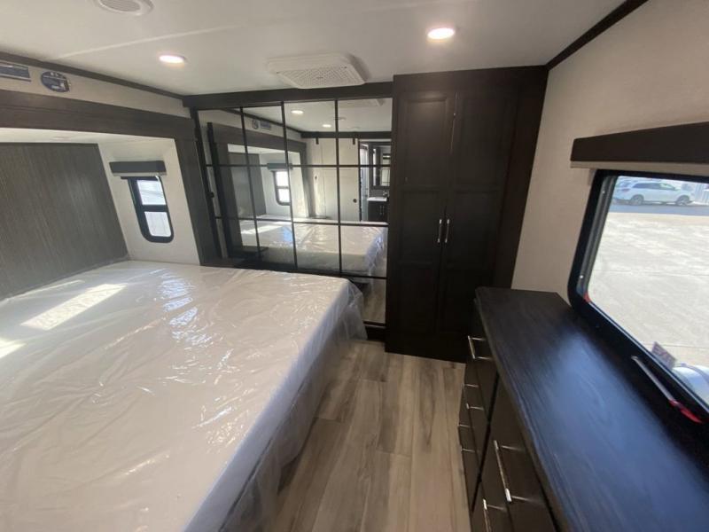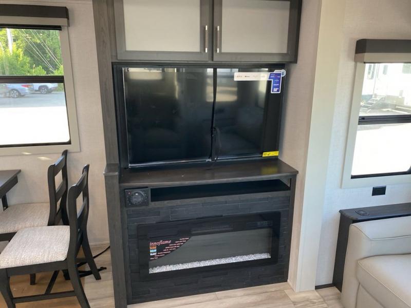 For the couple that enjoys entertaining, this fifth wheel is sure to catch your eye! Triple slides open up the interior to create an inviting place to call home while on the road. You will enjoy entertaining friends in the RV park, or even friends that come and stay a night or two since you have a hide-a-bed sofa sleeper for two! Theater seating opposite the entertainment center with 50" LED TV and fireplace makes it a cozy evening inside. The kitchen island with prep space and double sink makes it easy to be part of the conversation when prepping dinner with your guests, and you will love the refrigerator to keep your perishables fresh, along with a curio cabinet for storage and a pantry for your dry goods and snacks. You can even cook outside under the 11' Carefree awning protected from the elements at the Grill-N-Chill outside kitchen. Back inside and up the steps, you will find a front private bedroom and bath with dual entry. A king bed slide with storage beneath offers ample room for sleeping and a place to store extra blankets and things when not in use.