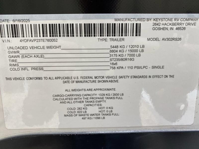 New 2026 Keystone RV Avalanche 302RS Fifth Wheel
