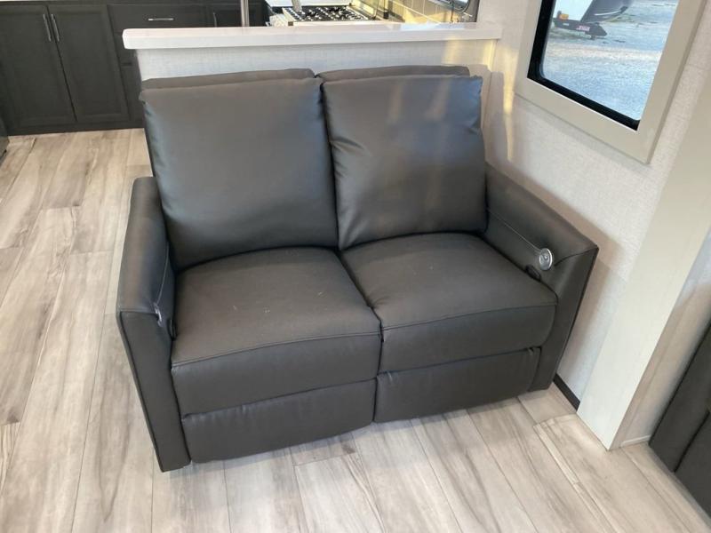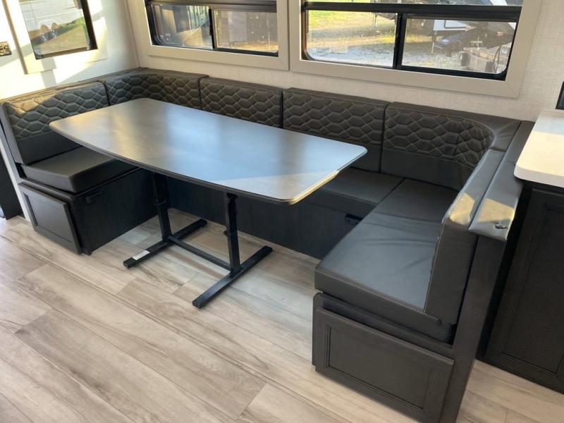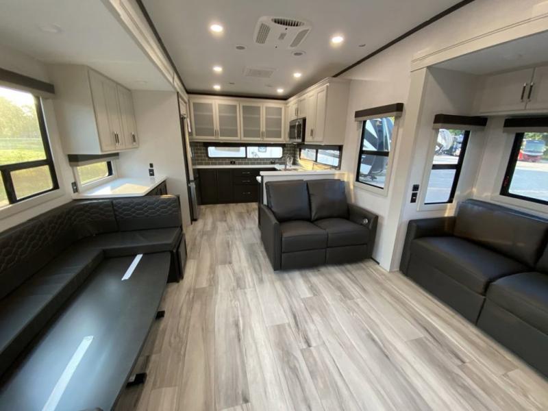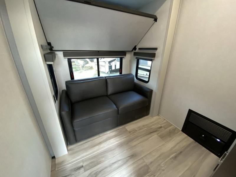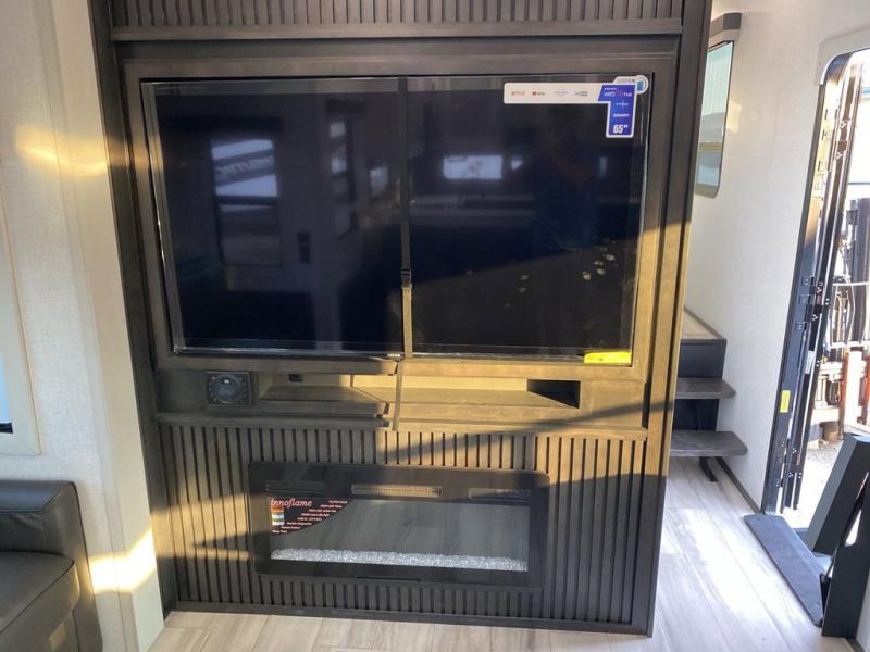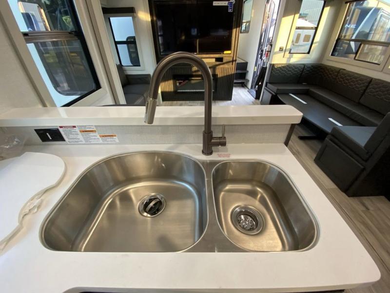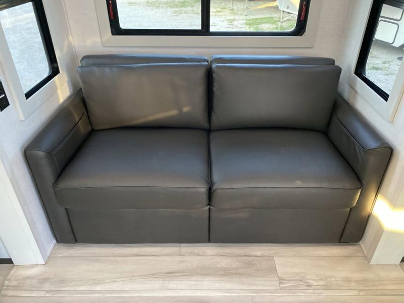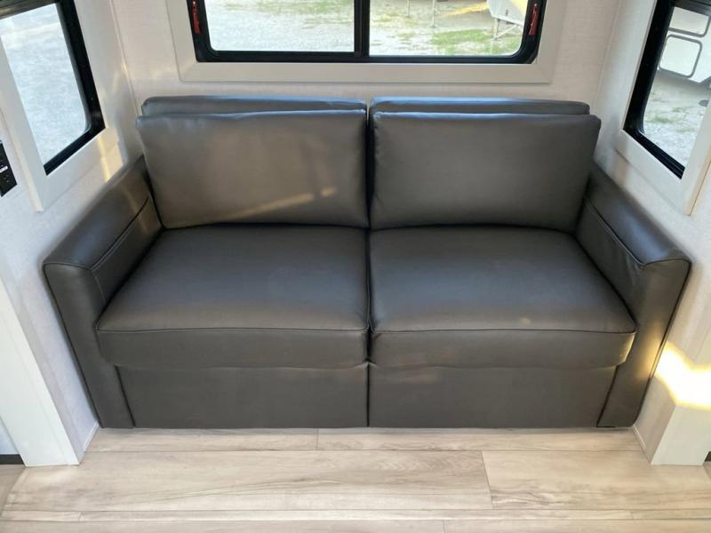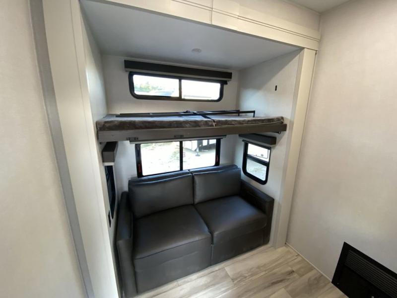 The whole gang will love camping in this fifth wheel since there is space for everyone! A front master bedroom includes a king bed slide out, master closet, and stackable washer and dryer prep if you choose to go full-time. Your guests or little ones will love the middle bunkhouse with a flip bunk above a hide-a-bed sofa, along with a pull-out table and storage space. Everyone can meet in the living area which features dual opposing slides for more space, theater seating, a sleeper sofa, and a U-shaped dinette, providing even more sleeping space. And check out the rear kitchen with its wrap-around counter space, Furrion appliances, and large pantry to keep snacks stocked!