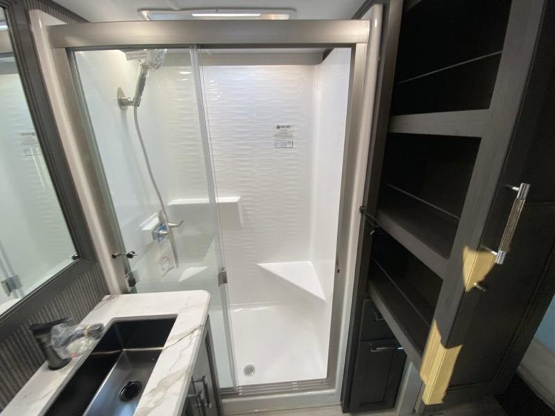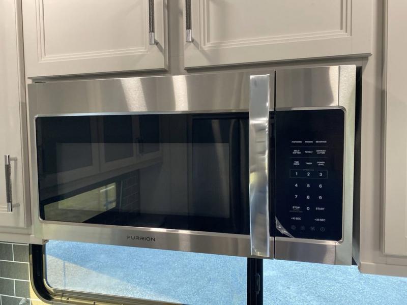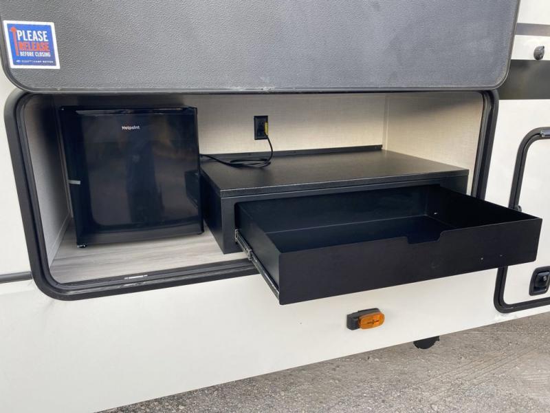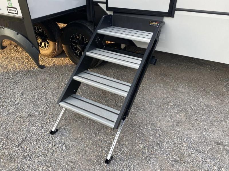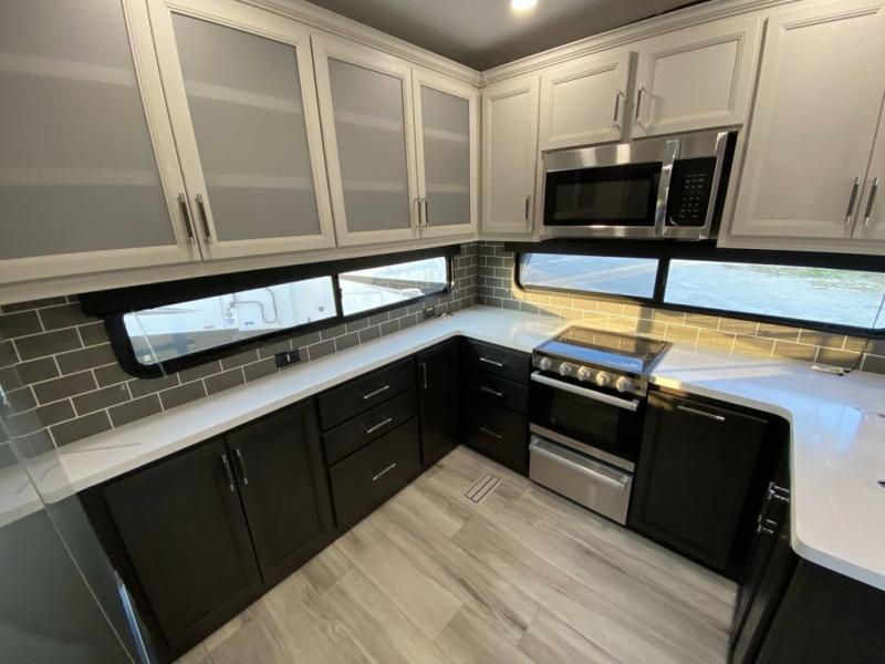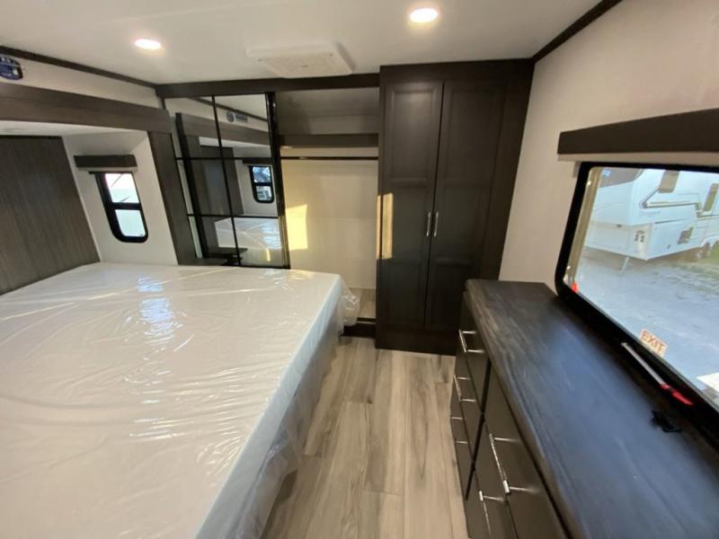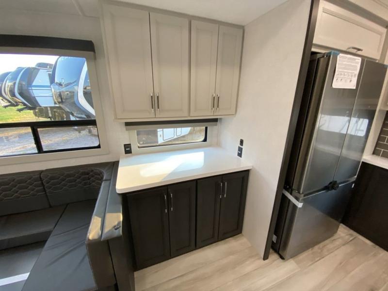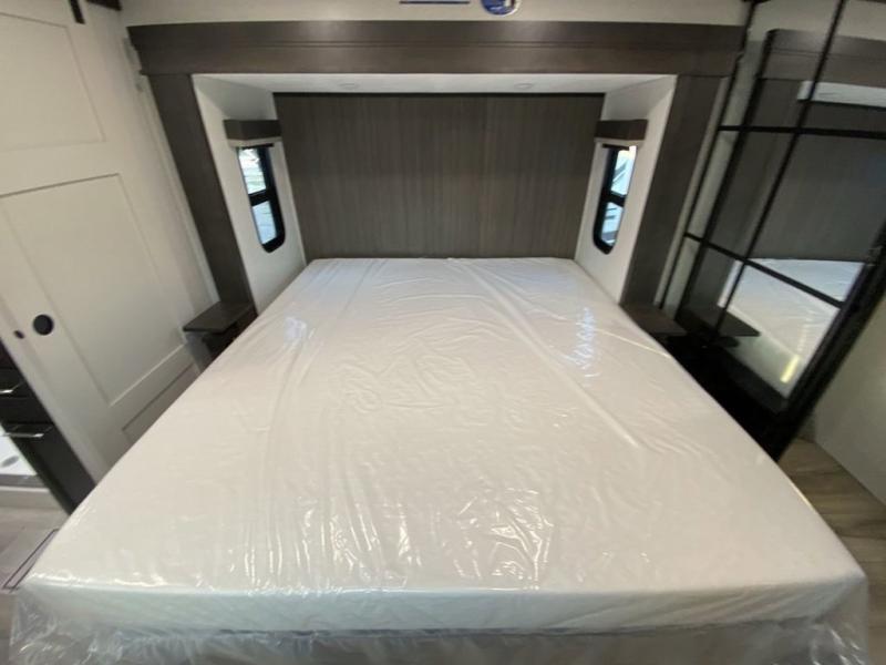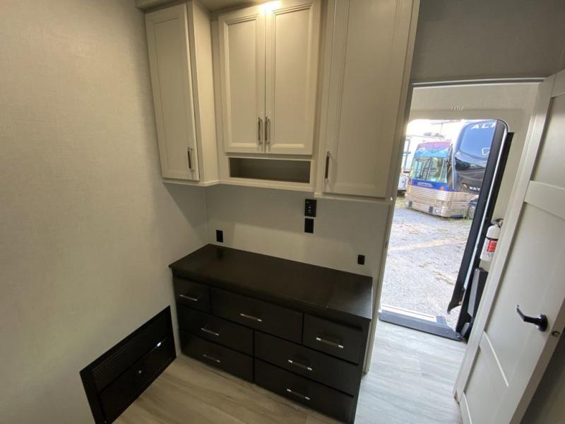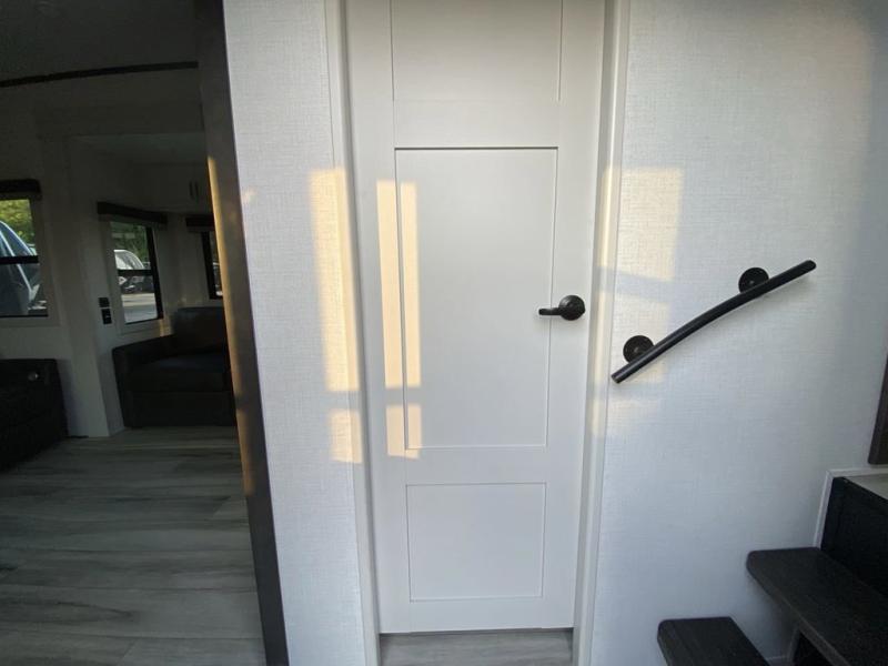 The whole gang will love camping in this fifth wheel since there is space for everyone! A front master bedroom includes a king bed slide out, master closet, and stackable washer and dryer prep if you choose to go full-time. Your guests or little ones will love the middle bunkhouse with a flip bunk above a hide-a-bed sofa, along with a pull-out table and storage space. Everyone can meet in the living area which features dual opposing slides for more space, theater seating, a sleeper sofa, and a U-shaped dinette, providing even more sleeping space. And check out the rear kitchen with its wrap-around counter space, Furrion appliances, and large pantry to keep snacks stocked!