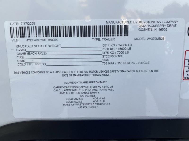 New 2026 Keystone RV Avalanche 379MB Fifth Wheel