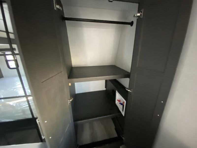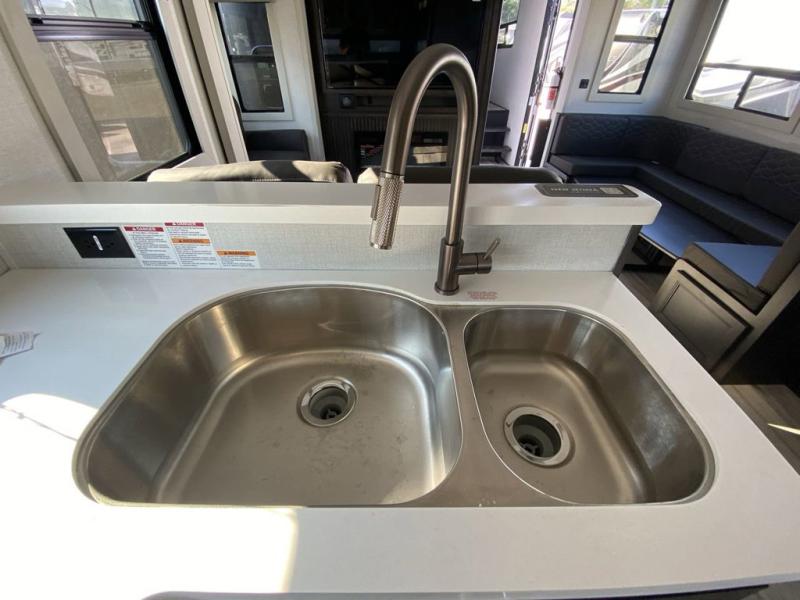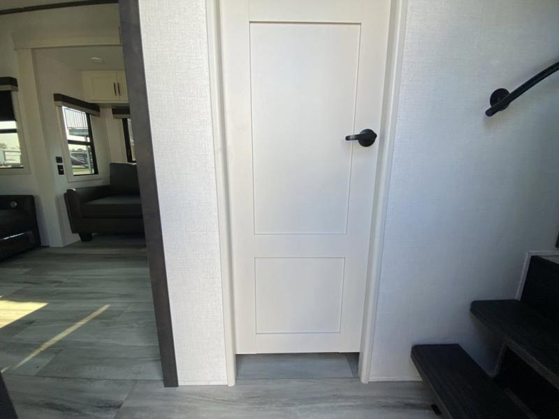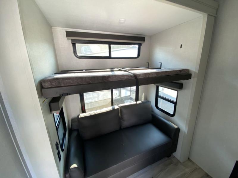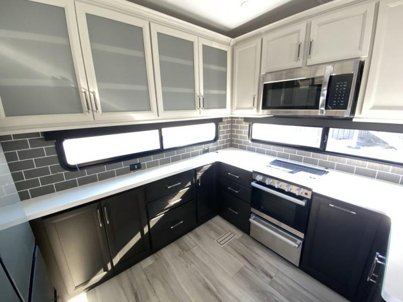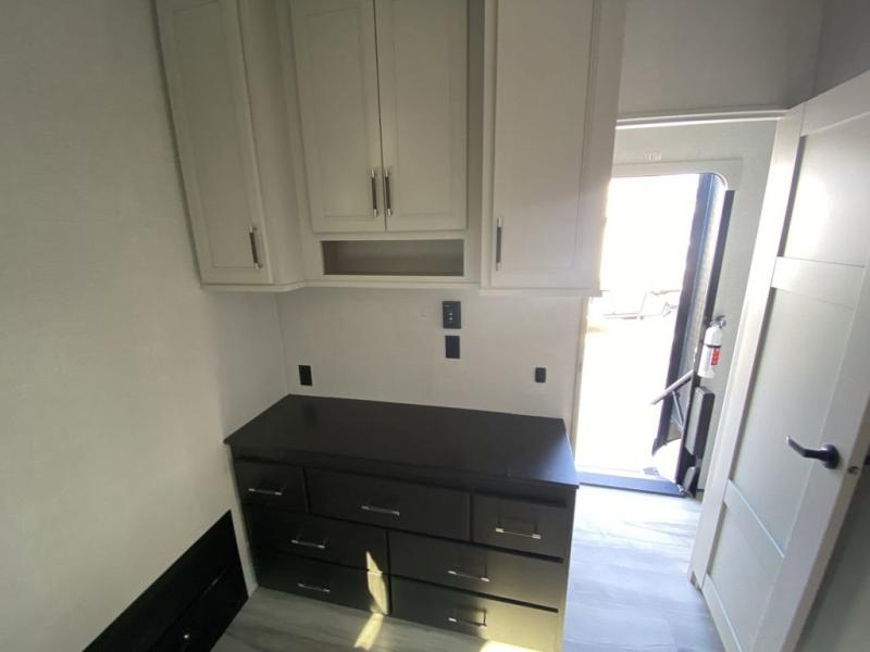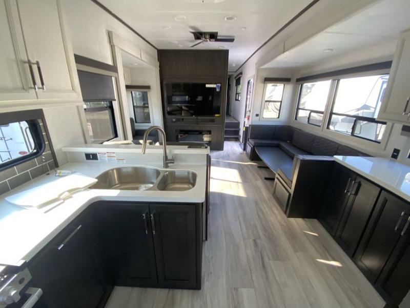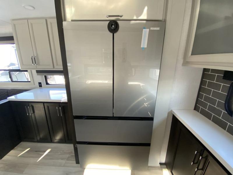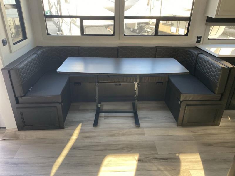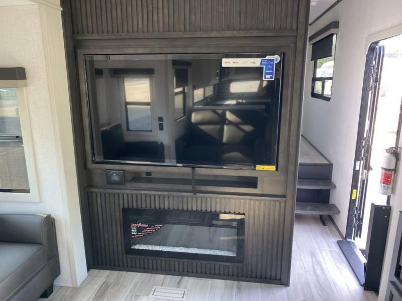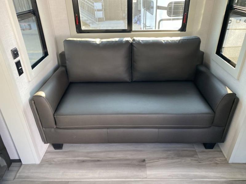 The whole gang will love camping in this fifth wheel since there is space for everyone! A front master bedroom includes a king bed slide out, master closet, and stackable washer and dryer prep if you choose to go full-time. Your guests or little ones will love the middle bunkhouse with a flip bunk above a hide-a-bed sofa, along with a pull-out table and storage space. Everyone can meet in the living area which features dual opposing slides for more space, theater seating, a sleeper sofa, and a U-shaped dinette, providing even more sleeping space. And check out the rear kitchen with its wrap-around counter space, Furrion appliances, and large pantry to keep snacks stocked!