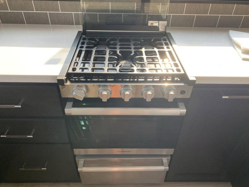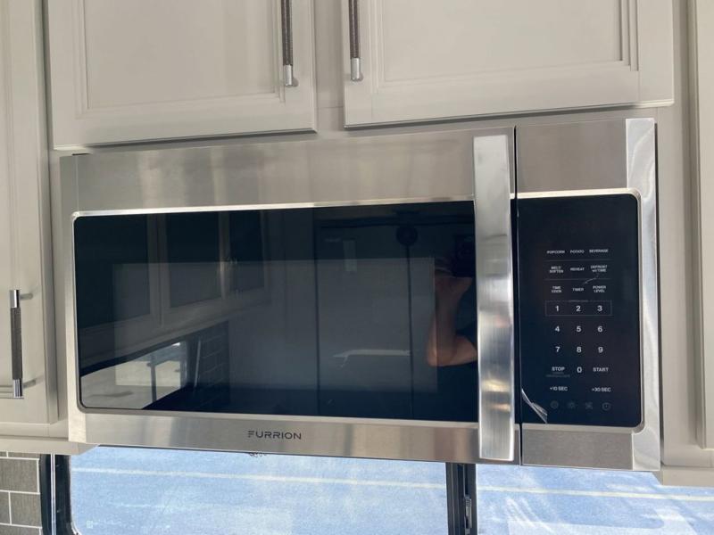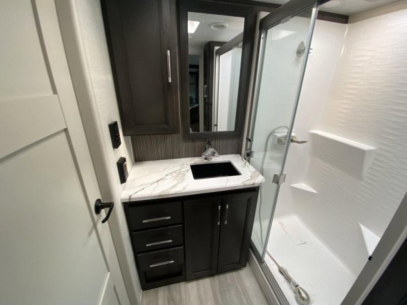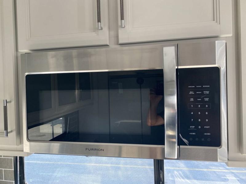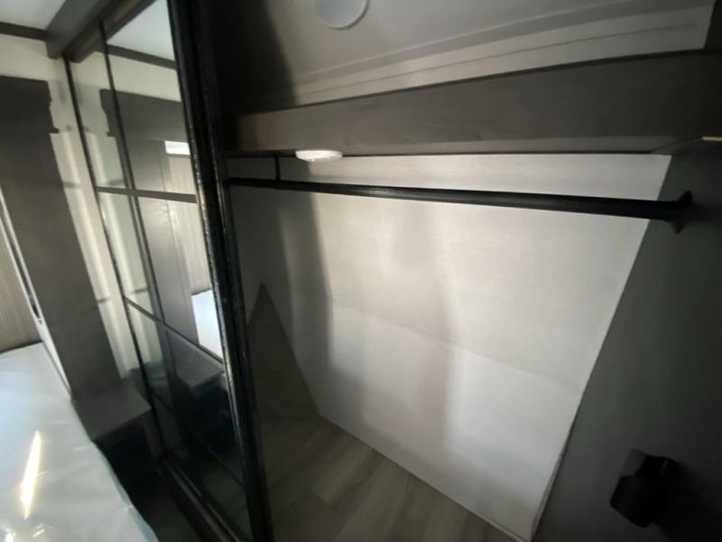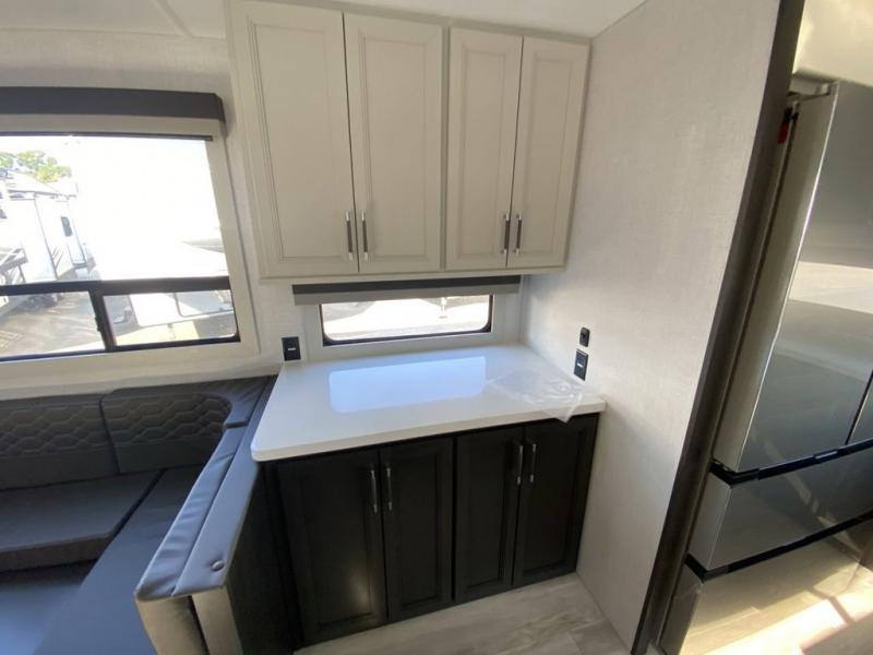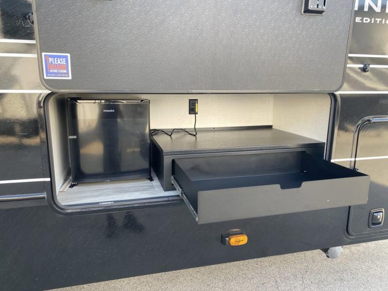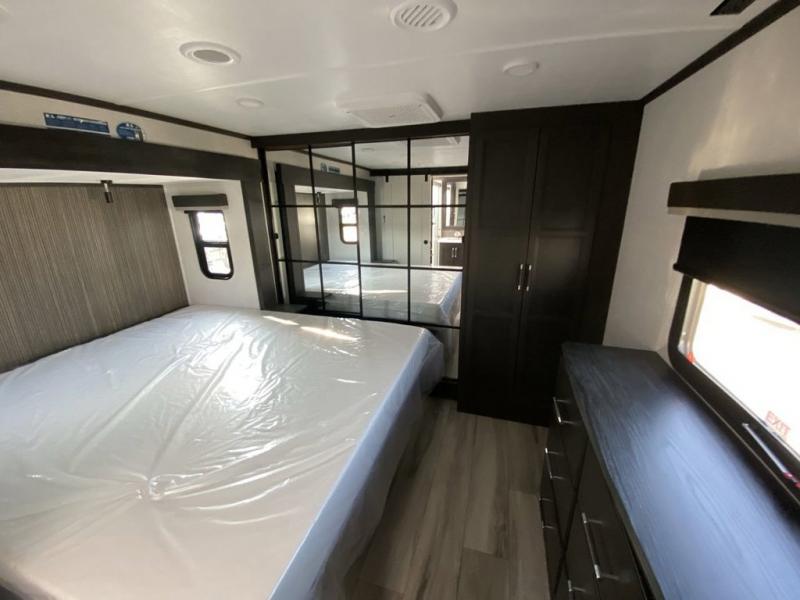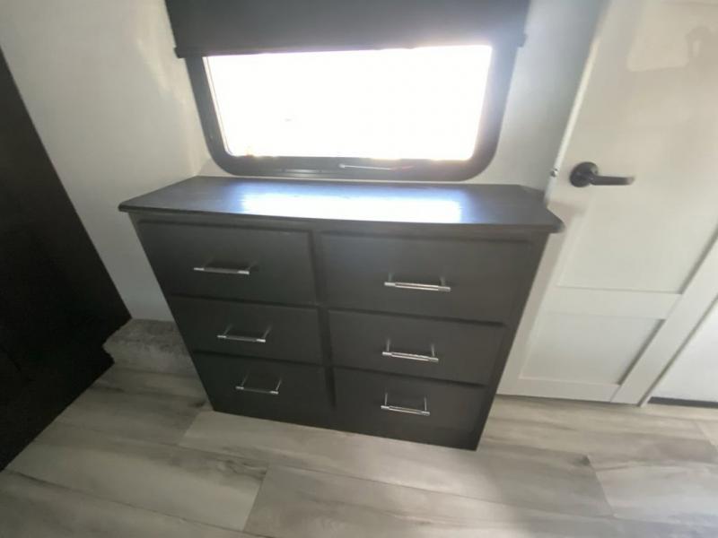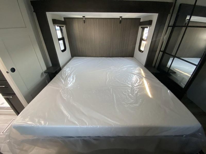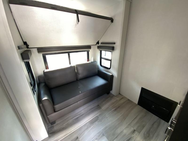 The whole gang will love camping in this fifth wheel since there is space for everyone! A front master bedroom includes a king bed slide out, master closet, and stackable washer and dryer prep if you choose to go full-time. Your guests or little ones will love the middle bunkhouse with a flip bunk above a hide-a-bed sofa, along with a pull-out table and storage space. Everyone can meet in the living area which features dual opposing slides for more space, theater seating, a sleeper sofa, and a U-shaped dinette, providing even more sleeping space. And check out the rear kitchen with its wrap-around counter space, Furrion appliances, and large pantry to keep snacks stocked!