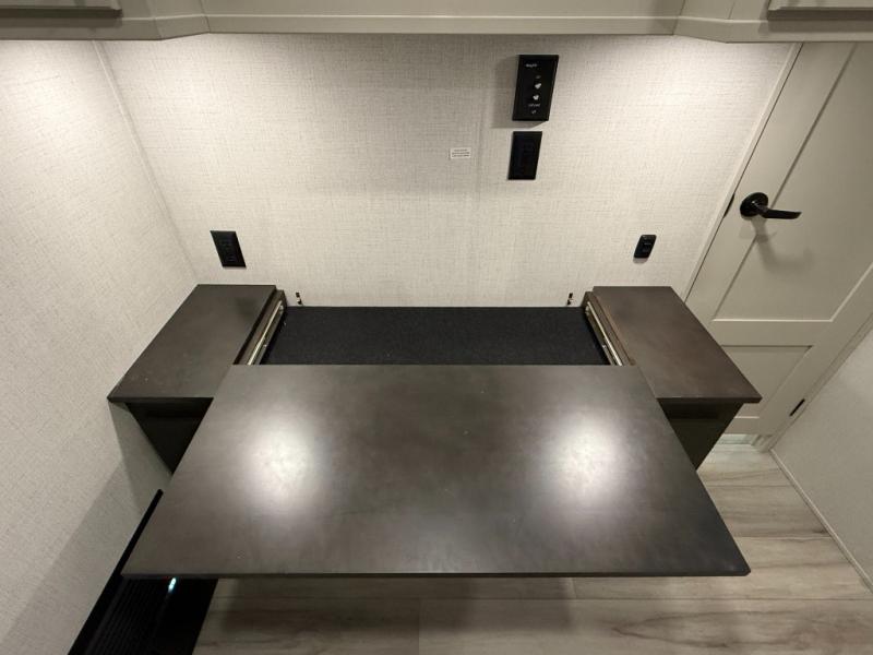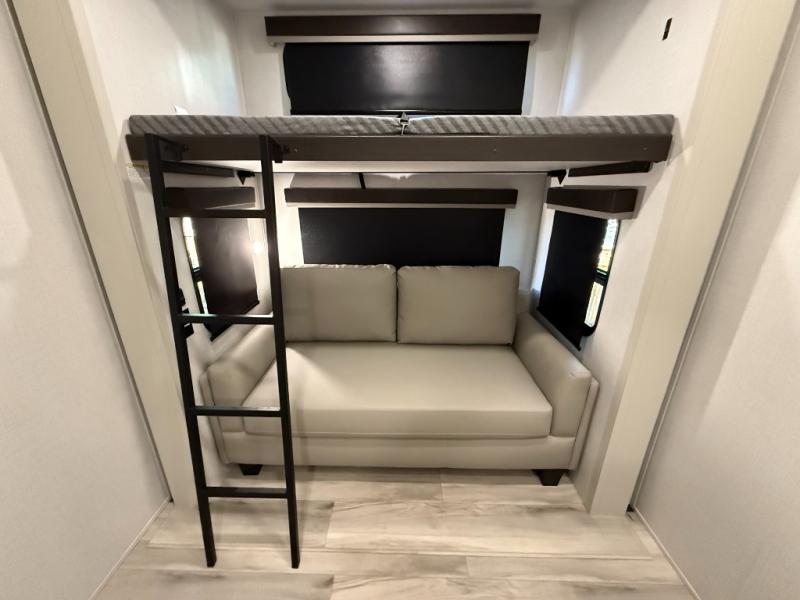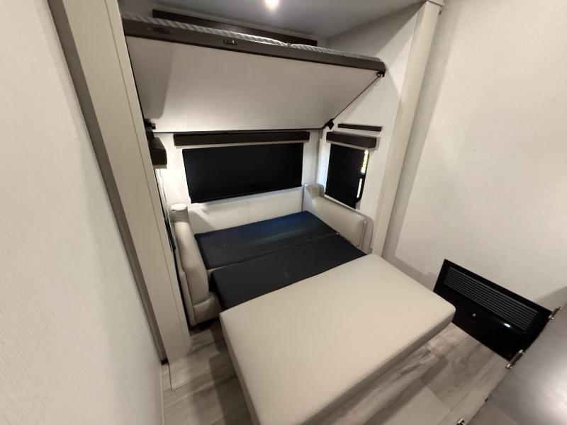 Mid-bunkhouse configuration: middle bunk room with flip bunk + hide-a-bed sofa + pull-out table/storage.