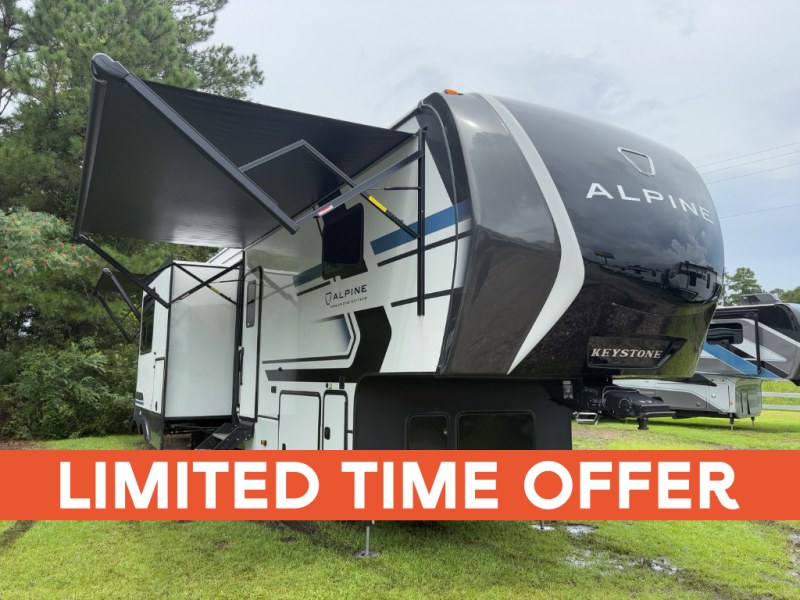 Experience premium fifth wheel living with the Keystone Alpine Avalanche Edition 380LT. This spacious model features four slide outs, two A/C units, SolarFlex Protect, and dual entry doors, providing comfort, convenience, and versatility for extended adventures or seasonal stays.