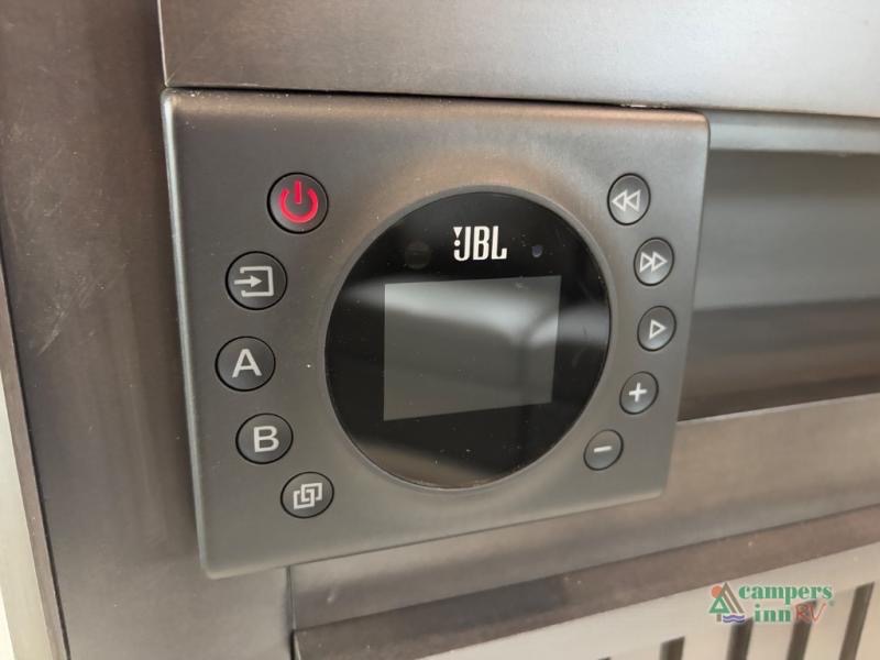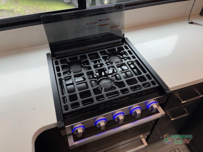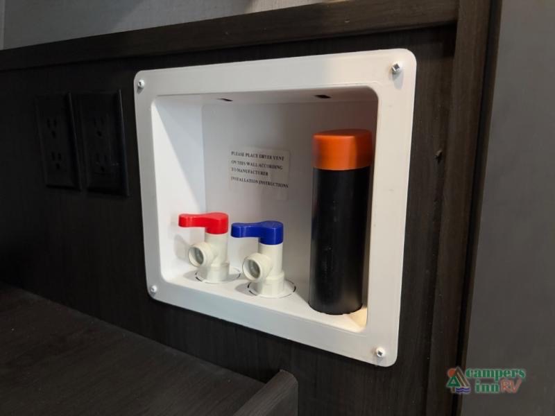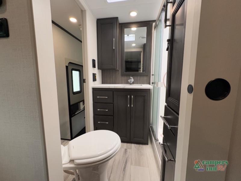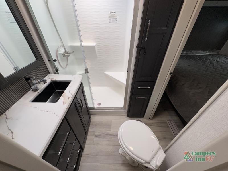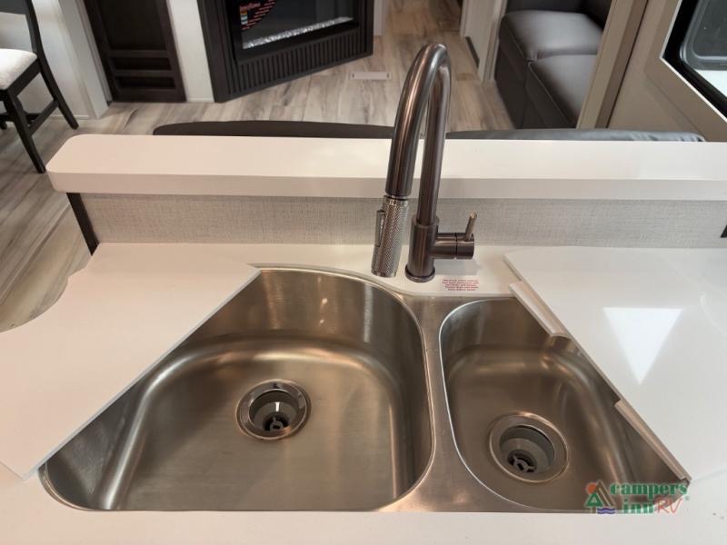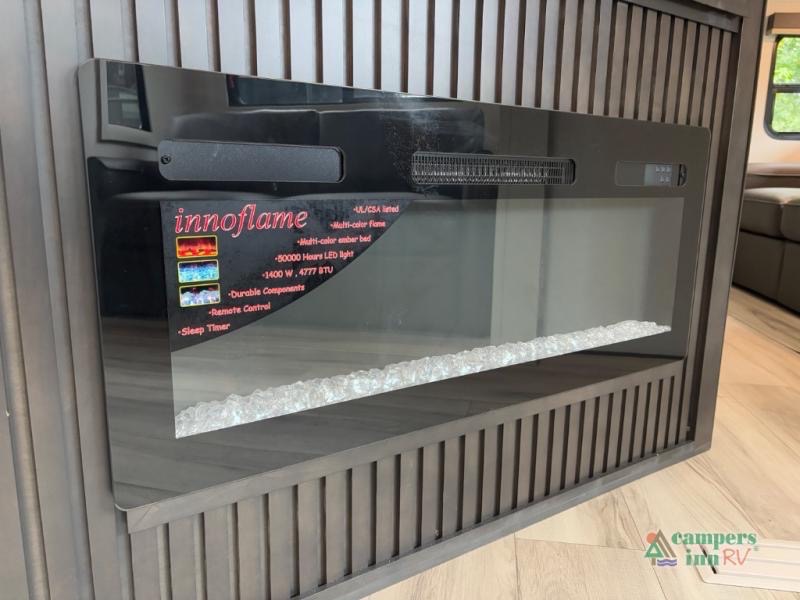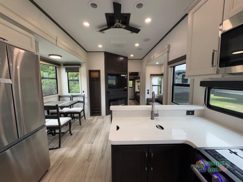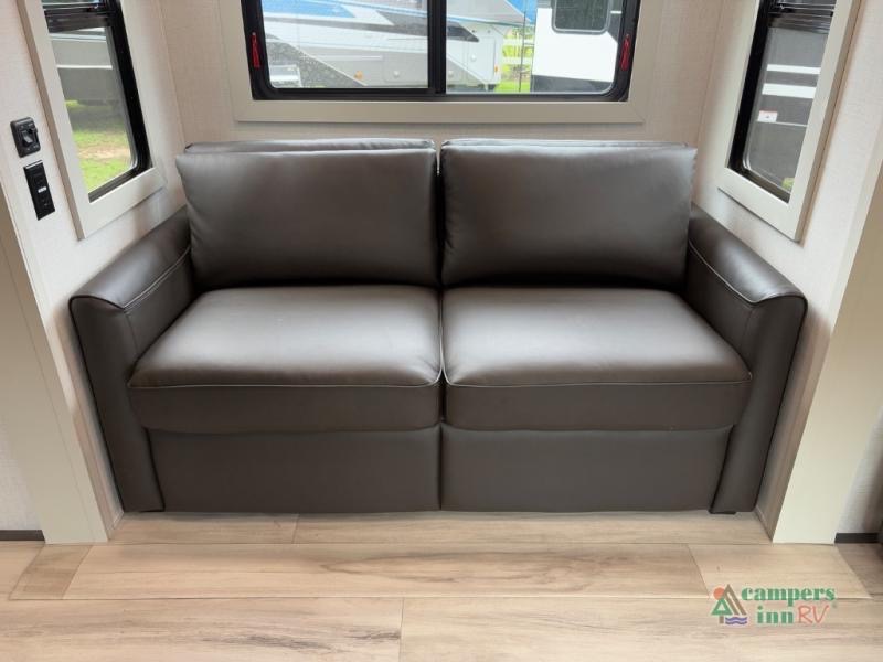 Are you looking for a spacious fifth wheel with space for you and your guests? Look no further than this four slide out unit with dual entry doors, a front master bedroom, and a rear bedroom/den with a loft! There is also a half bath here and a hide-a-bed sofa with storage underneath. You'll find the second hide-a-bed sofa in the living room, along with theater seating, a feature wall with a 50" TV, and a free-standing dinette with chairs where you can dine together. Furrion appliances in the kitchen let you create yummy meals each day, and there is a pantry and residential refrigerator to keep food stocked. Head to the front master bedroom where you can relax on the king bed slide out, store your clothes in the master closet, and easily use the dual entry bath. There is even stackable washer and dryer prep if you want the option to make laundry day easier!