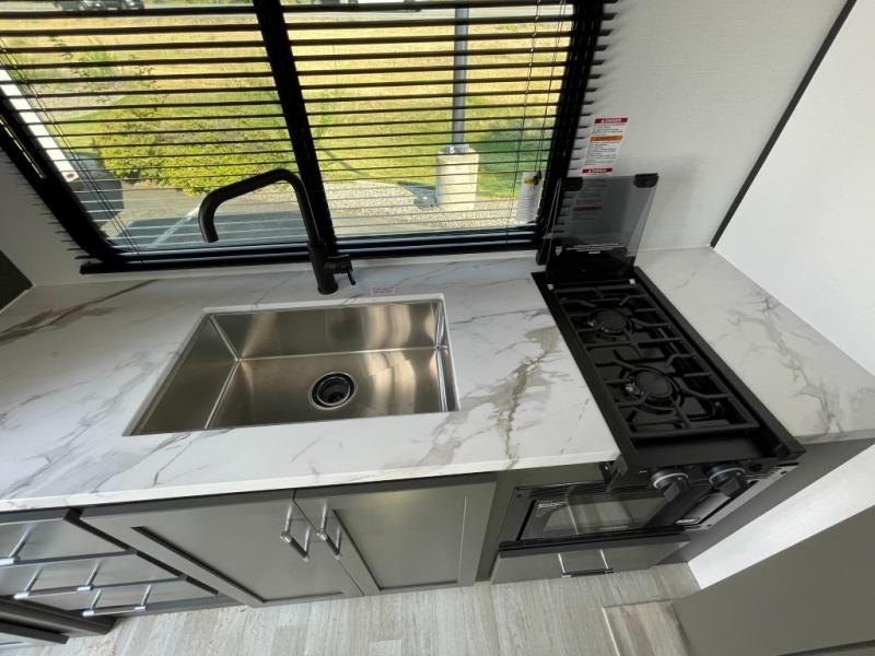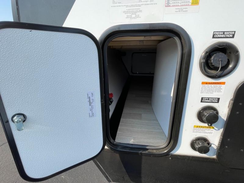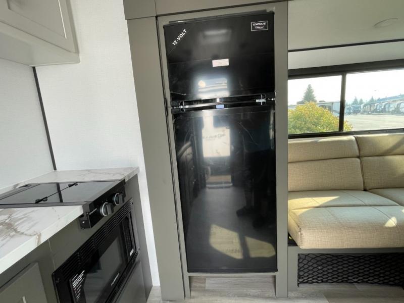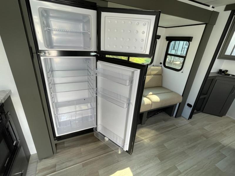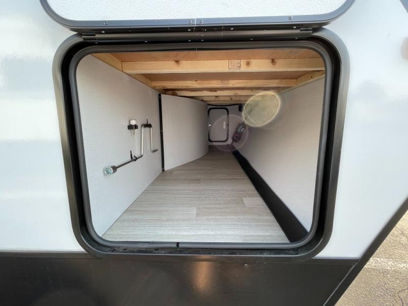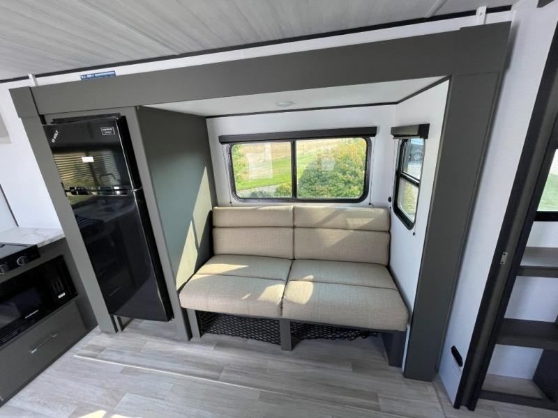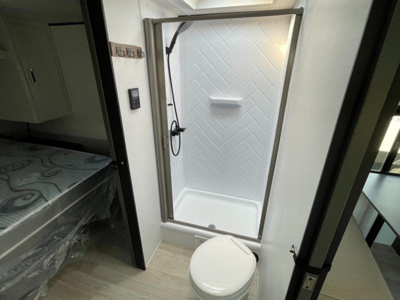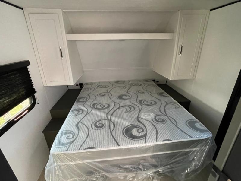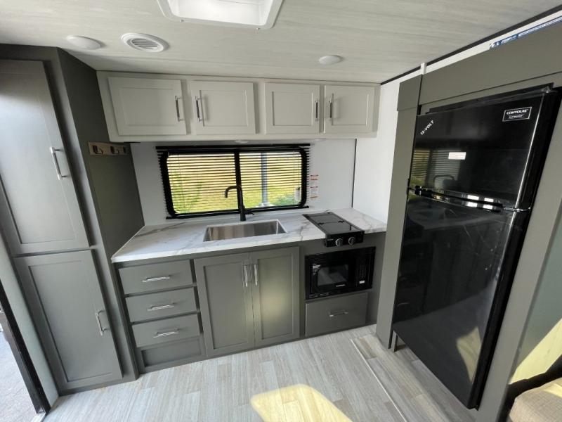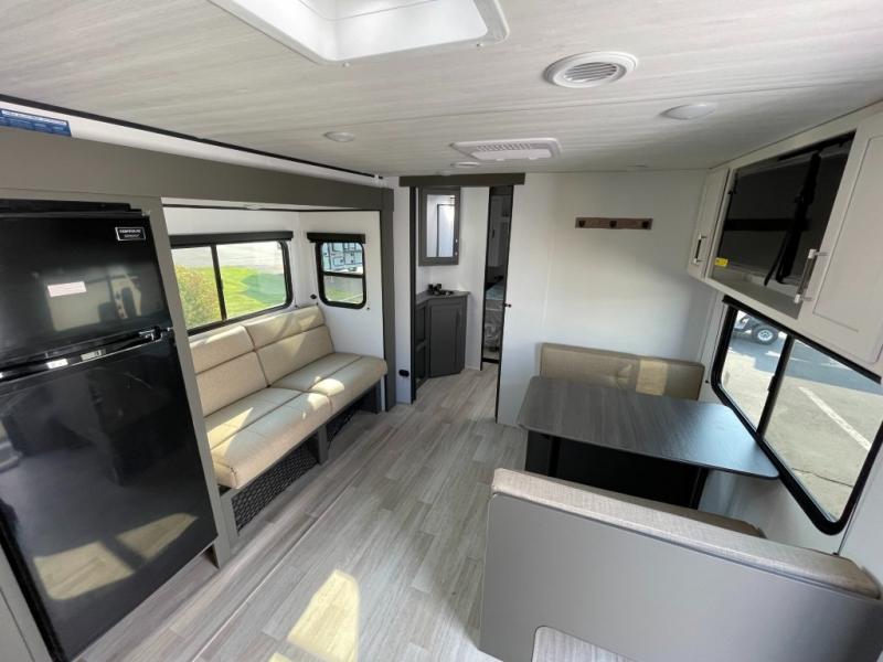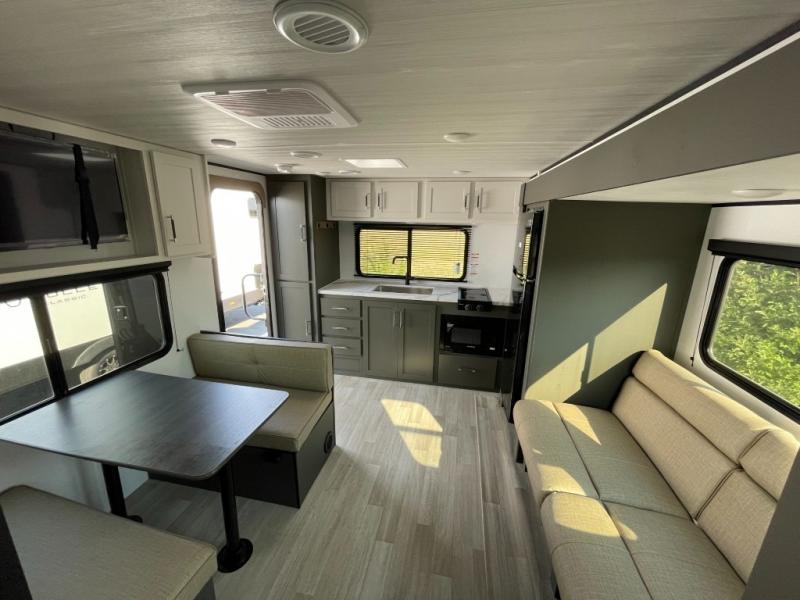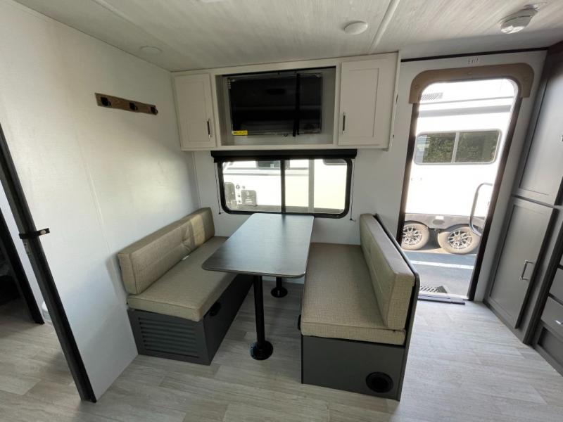 Perfect for road trips or camping excursions, this travel trailer is the safest bet! The rear kitchen is a highlight of the trailer, featuring a two-burner cooktop for preparing meals and a 12V refrigerator for keeping drinks and snacks fresh. Ample counter space and storage make meal prep a breeze. The booth dinette provides a cozy spot for meals and snacks, while the jackknife sofa offers a comfortable seating area that can be converted into a sleeping space. Enjoy your favorite shows on TV. In the heart of this RV, the walk-through bathroom is conveniently located and equipped with everything you need for a comfortable stay. And after a long day of adventures, sleep in the plush queen-sized bed and store all your personal items in the wardrobes and nightstands provided.