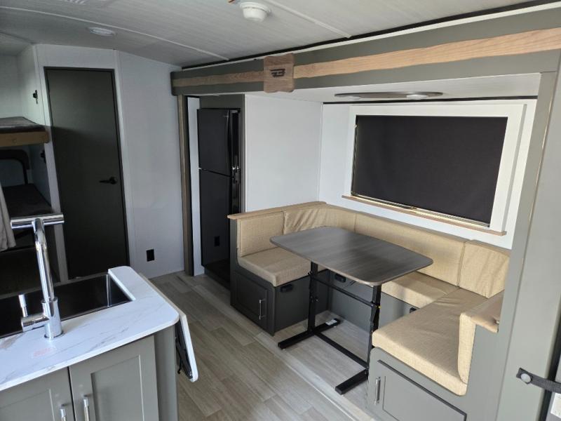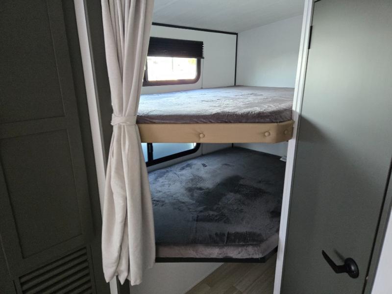 You can easily sleep eight in this travel trailer thanks to the 51" x 74" double-size bunks, the U-shaped Do-More dinette table, and the queen bed in the front bedroom. Whip up your best meals on the three burner cooktop, or use the microwave oven. You can dine around the dinette, or take your plate outdoors to sit under the 15' awning, plus there is an outdoor kitchen with a griddle, mini fridge and shelf!