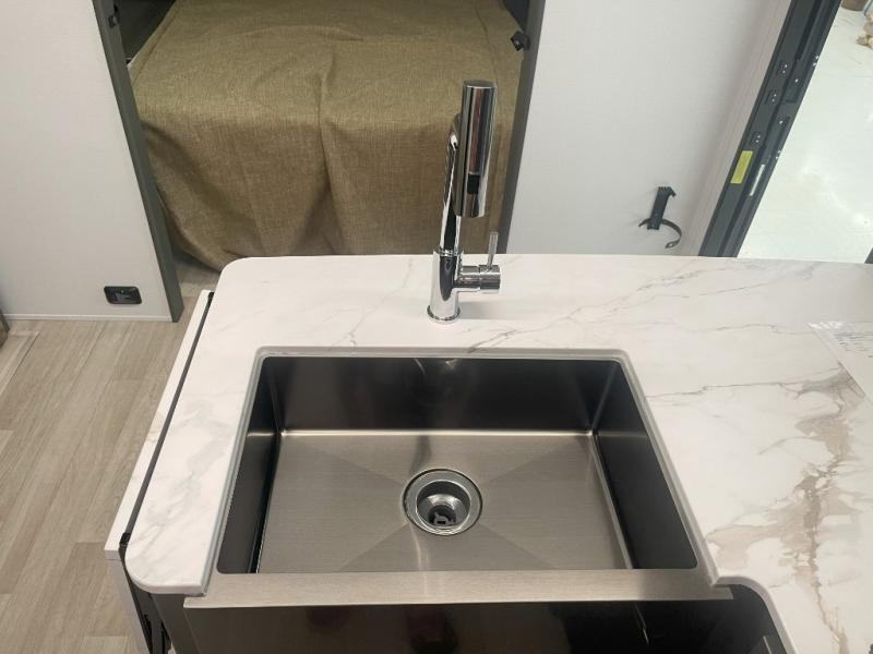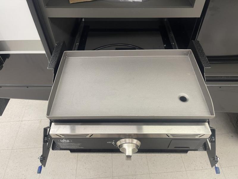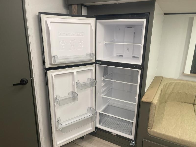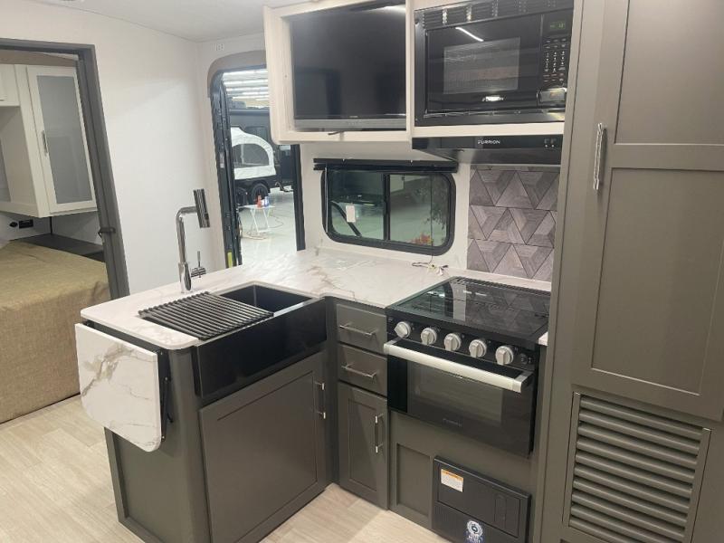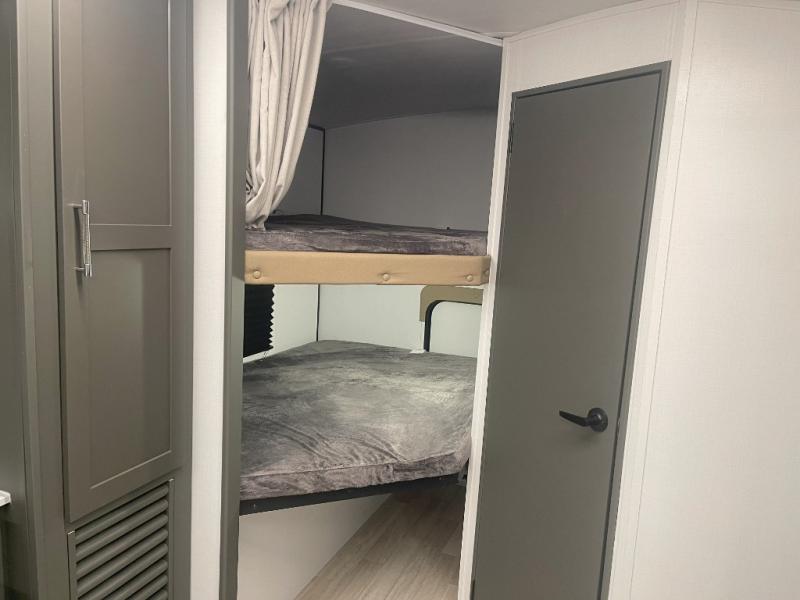 You can easily sleep eight in this travel trailer thanks to the 51" x 74" double-size bunks, the U-shaped Do-More dinette table, and the queen bed in the front bedroom. Whip up your best meals on the three burner cooktop, or use the microwave oven. You can dine around the dinette, or take your plate outdoors to sit under the 15' awning, plus there is an outdoor kitchen with a griddle, mini fridge and shelf!