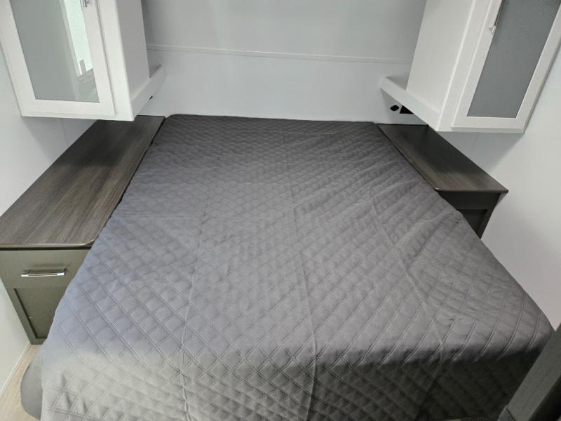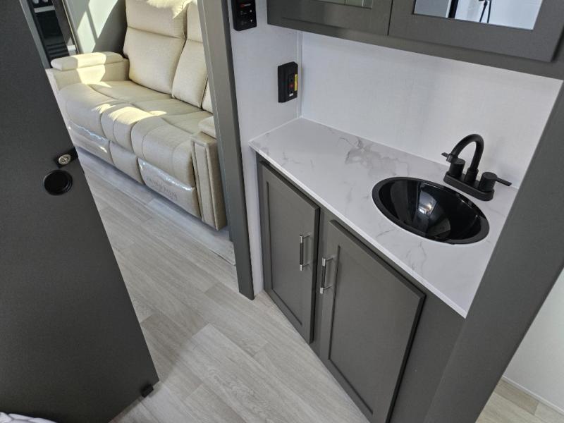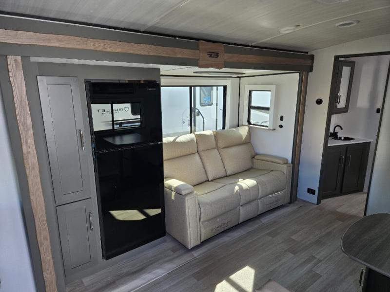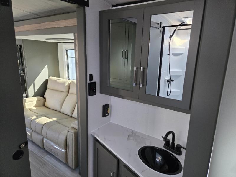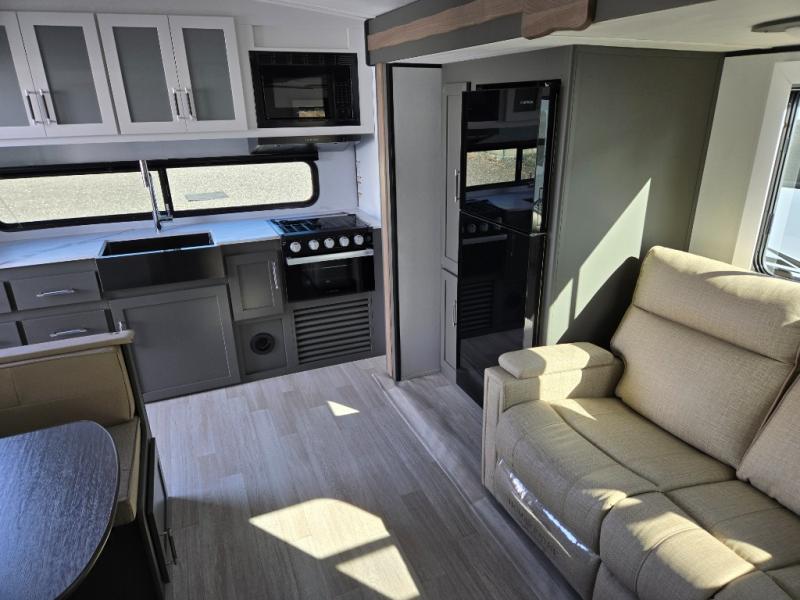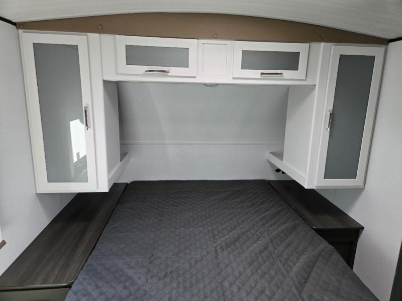 One step inside this dual entry travel trailer and you'll be sold! The rear kitchen features ample counter space to prep meals, and the do-more dinette table provides a place to dine together. There is also an outdoor kitchen with a griddle and mini fridge plus a 19' awning if you want to cook and eat outdoors. Two pantries and a 12V refrigerator will let you keep food stocked, and the tri-fold sofa slide provides sleeping space for guests. A walk-thru bath will create a front master bedroom you are sure to love, complete with a queen bed plus dual nightstands and dual wardrobes to keep everything tidy!