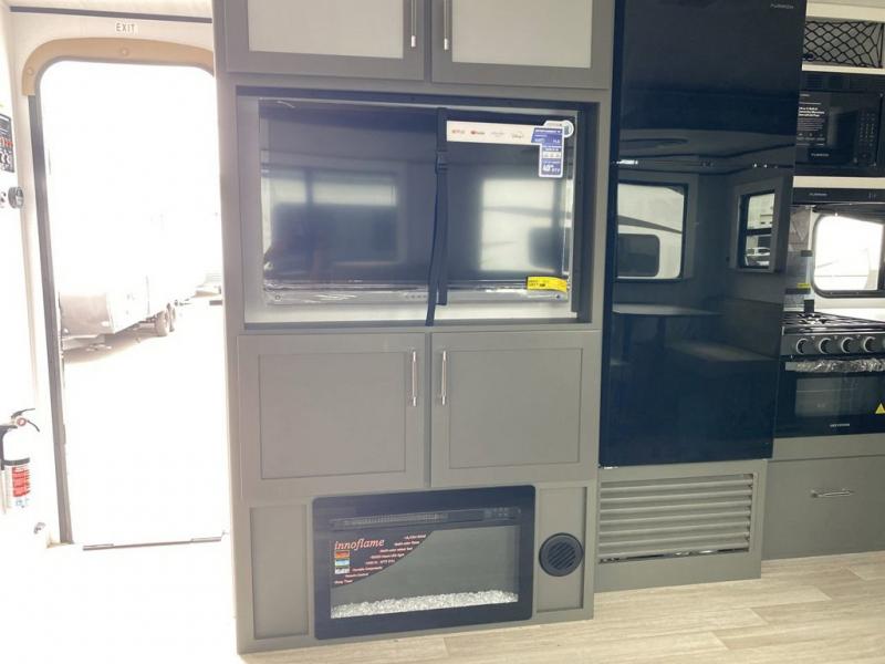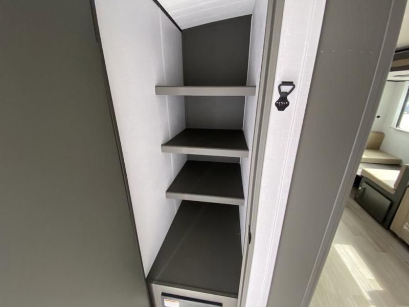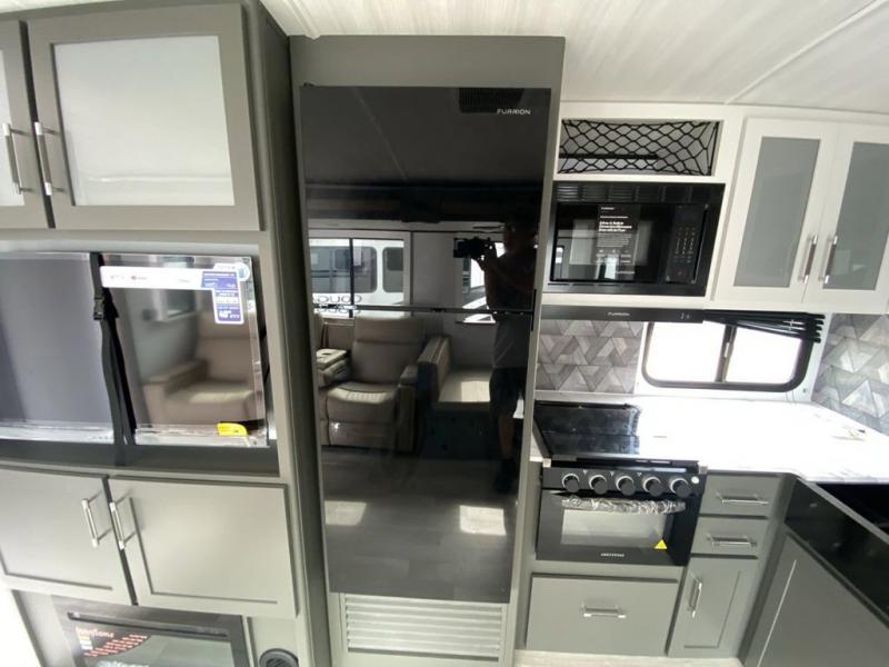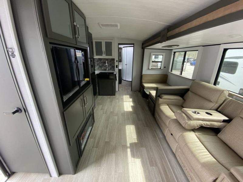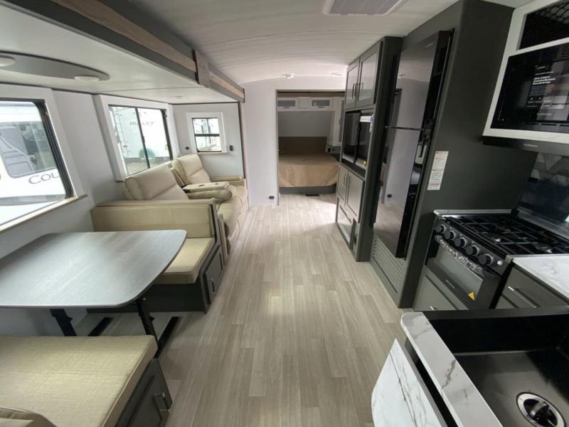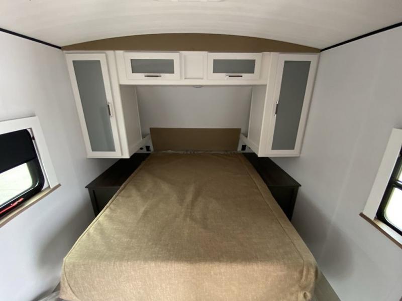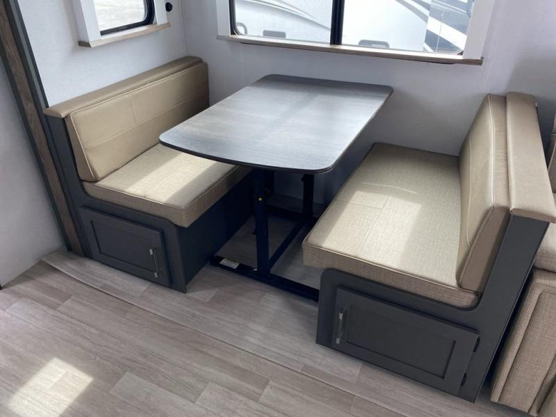 Enjoy camping with your family in this travel trailer that is perfect for a couple or a family of four. You will appreciate the private bedroom with wide entry including space saving sliding doors. The bedroom features a queen bed and wardrobes on either side to keep your clothes tidy. There is also a large pass-thru storage compartment beneath the front bedroom for your outdoor gear and more. A large slide features a Do-More dinette and 68" tri-fold sofa that is great for relaxing during the day, and can easily be transformed for more sleeping space at night. Or, you could opt. for the free standing dinette with chairs if you do not prefer booth style seating and/or do not need the added option of more sleeping space. A large rear bath features a radius shower and linen storage, plus a vanity with sink and toilet. And, the chef can choose to cook inside or outside with the outdoor kitchen that includes a Capital grill, 4.4 cu. ft. refrigerator as well as a sink all tucked under the 21' awning.