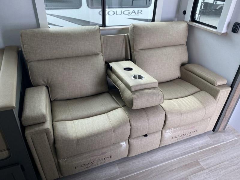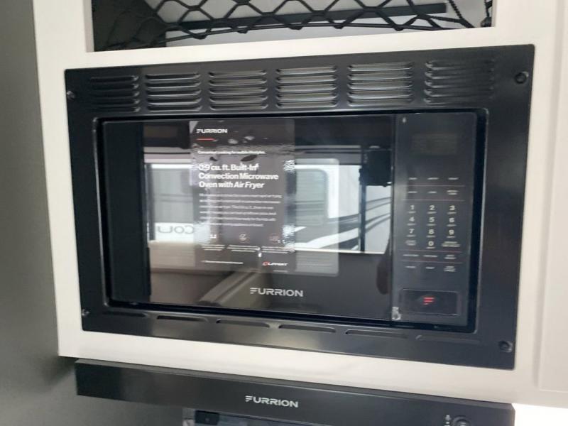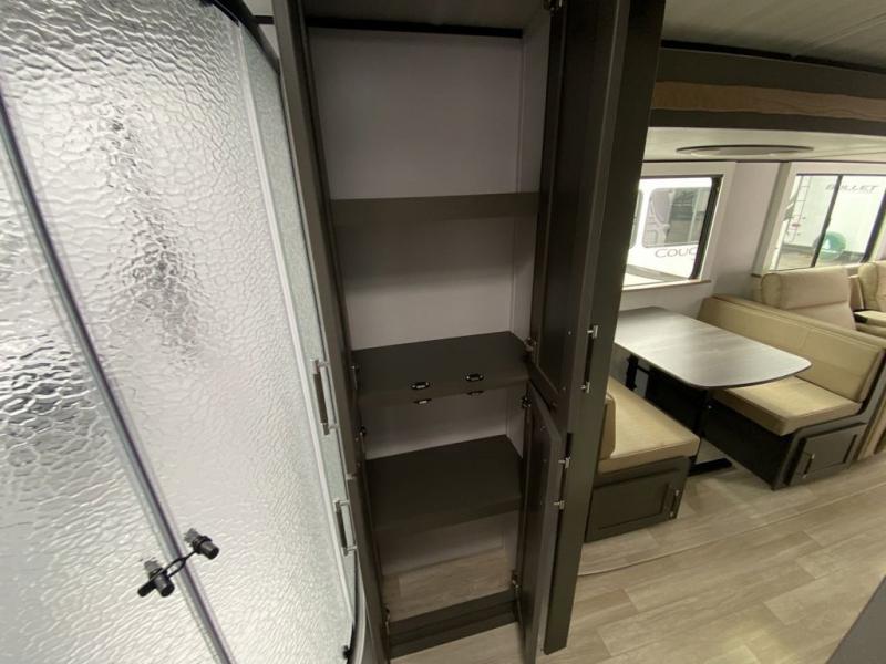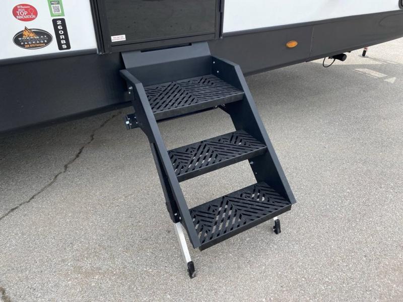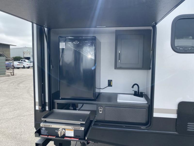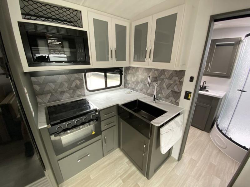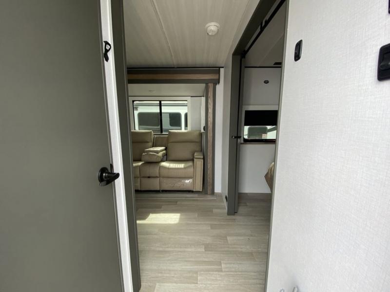 Enjoy camping with your family in this travel trailer that is perfect for a couple or a family of four. You will appreciate the private bedroom with wide entry including space saving sliding doors. The bedroom features a queen bed and wardrobes on either side to keep your clothes tidy. There is also a large pass-thru storage compartment beneath the front bedroom for your outdoor gear and more. A large slide features a Do-More dinette and 68" tri-fold sofa that is great for relaxing during the day, and can easily be transformed for more sleeping space at night. Or, you could opt. for the free standing dinette with chairs if you do not prefer booth style seating and/or do not need the added option of more sleeping space. A large rear bath features a radius shower and linen storage, plus a vanity with sink and toilet. And, the chef can choose to cook inside or outside with the outdoor kitchen that includes a Capital grill, 4.4 cu. ft. refrigerator as well as a sink all tucked under the 21' awning.