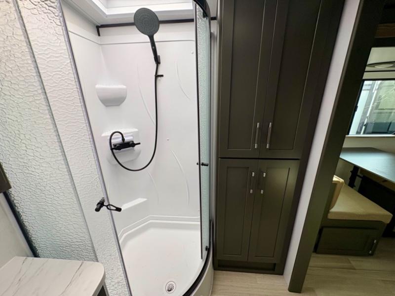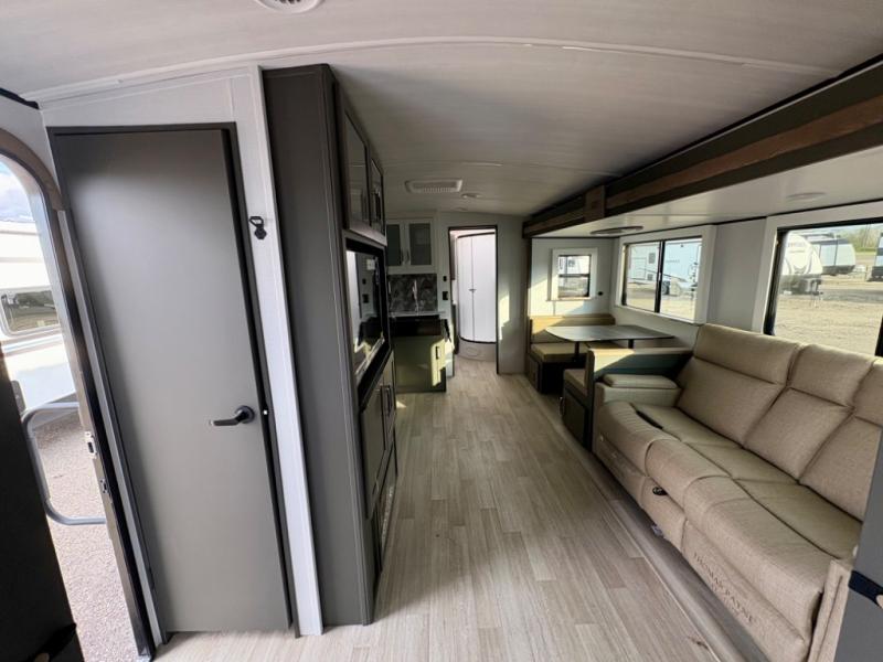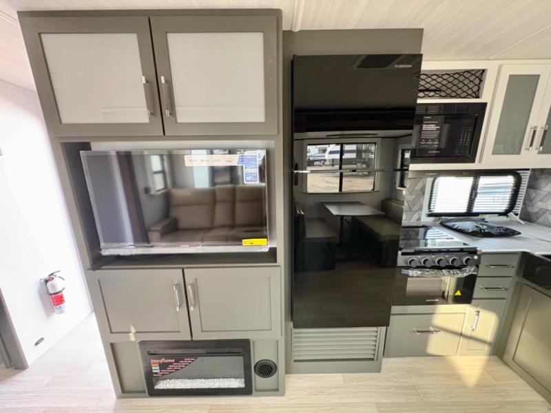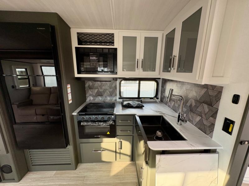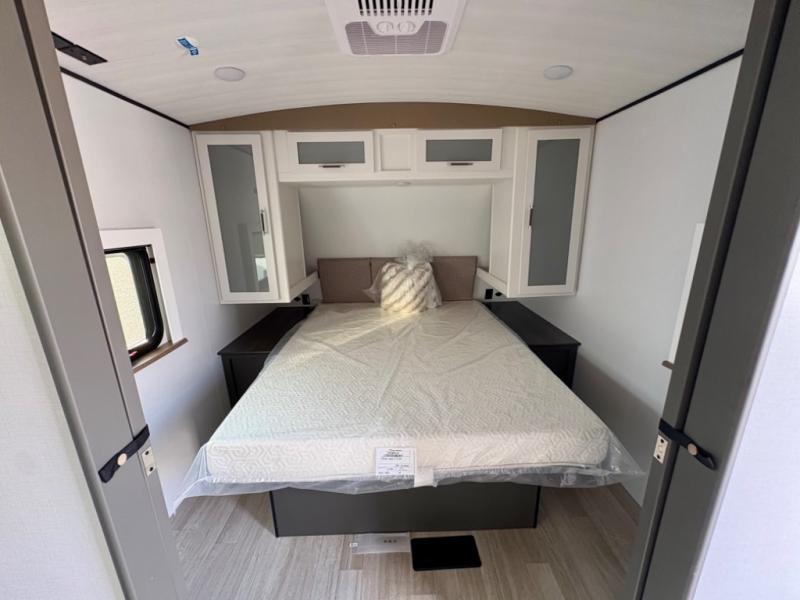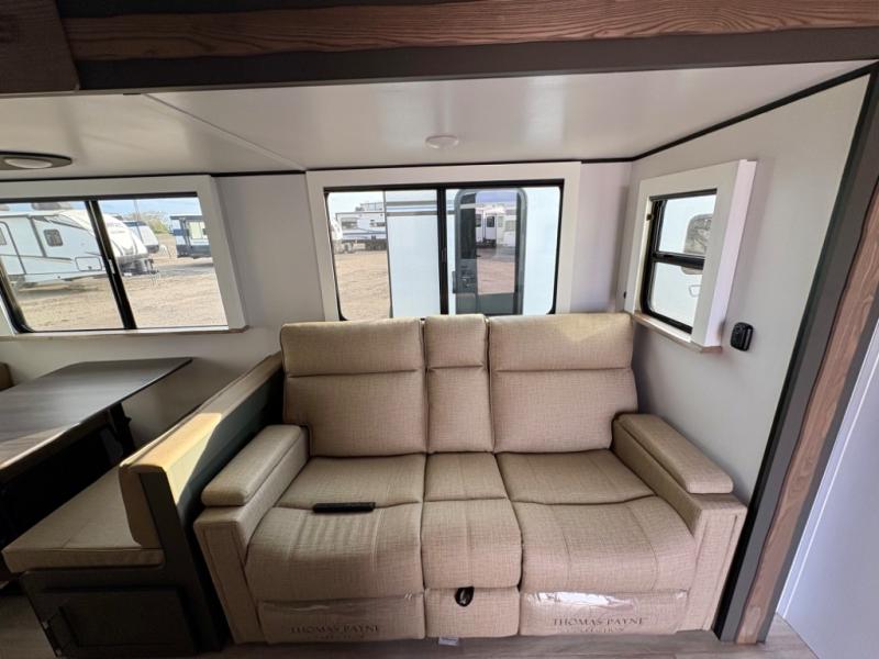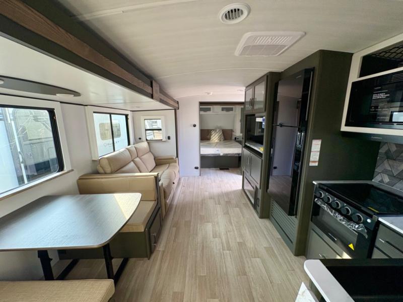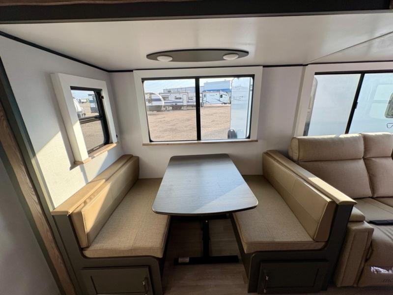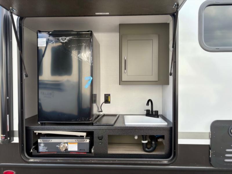 Enjoy camping with your family in this travel trailer that is perfect for a couple or a family of four. You will appreciate the private bedroom with wide entry including space saving sliding doors. The bedroom features a queen bed and wardrobes on either side to keep your clothes tidy. A large slide features a Do-More dinette and tri-fold sofa that is great for relaxing during the day, and can easily be transformed for more sleeping space at night. Or, you could opt. for the free standing dinette with chairs if you do not prefer booth style seating and/or do not need the added option of more sleeping space. A large rear bath features a radius shower and linen storage, plus a vanity with sink and toilet. And, the chef can choose to cook inside or outside with the outdoor kitchen that includes a griddle, small refrigerator as well as a sink all tucked under the patio awning.