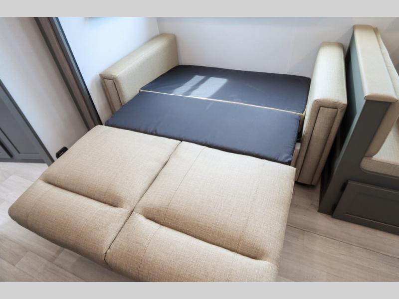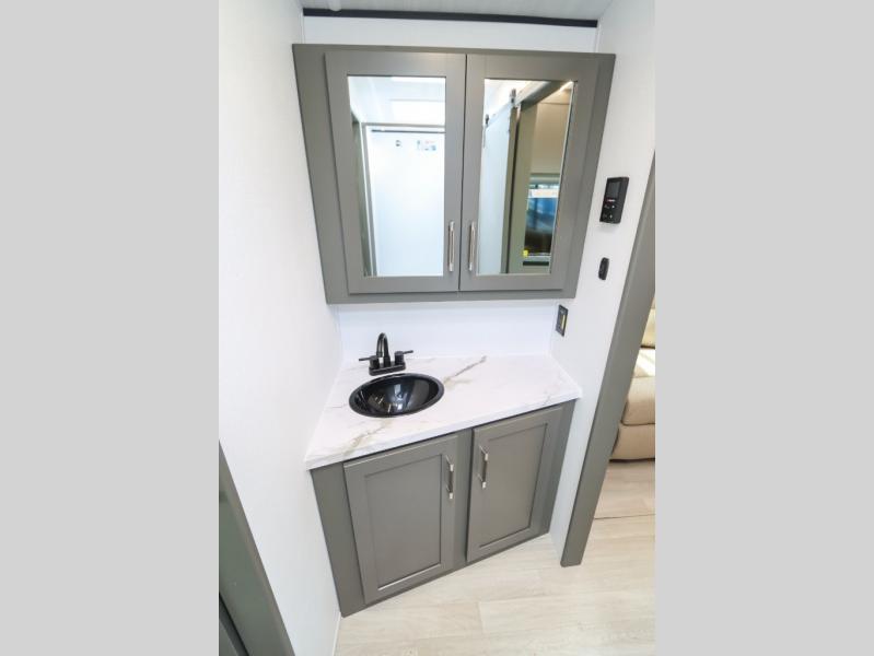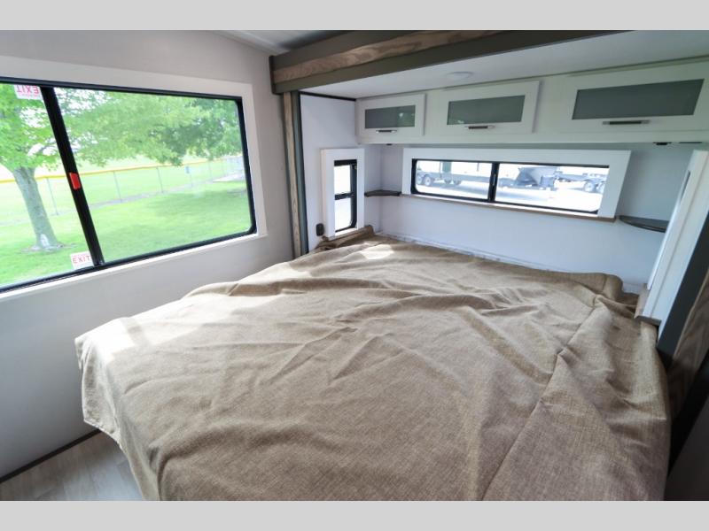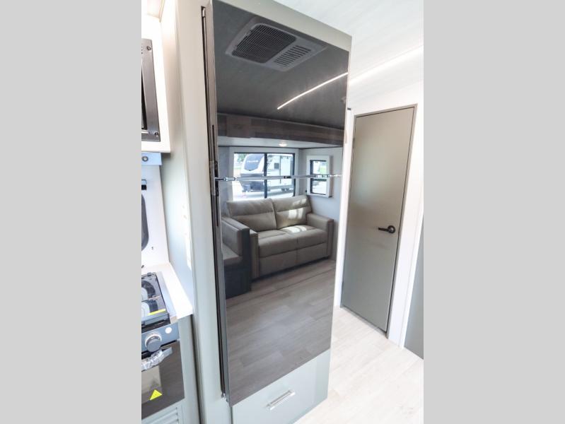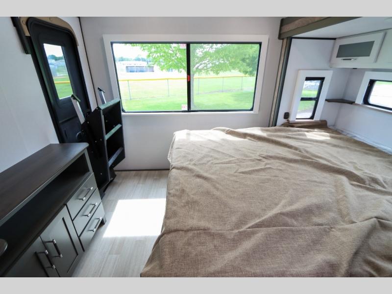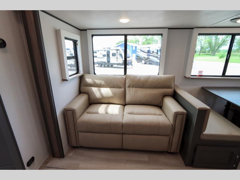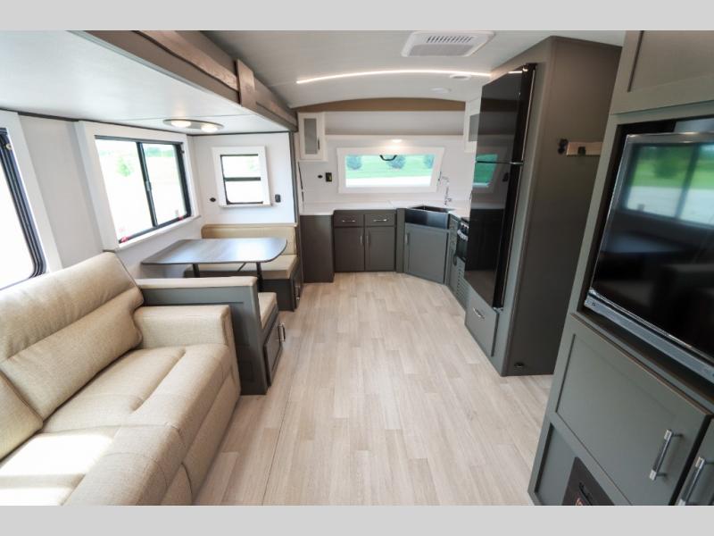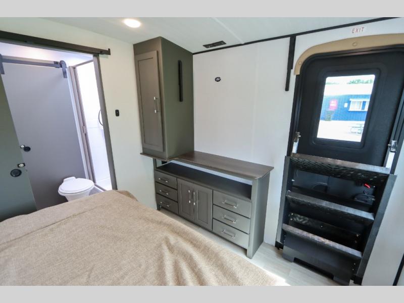 It won't be hard to feel right at home in this dual entry, front kitchen travel trailer! You will be impressed by the amount of counter space you have, along with a two kitchen pantries, a three burner range, and a 10 cu. ft. refrigerator. A Do-More dinette table and tri-fold sofa sit within a slide for more space, and the entertainment center with a fireplace is in great viewing for movie night. This model includes a dual entry bath with quick and easy access into the rear master bedroom, complete with a king bed slide out and a large wardrobe!