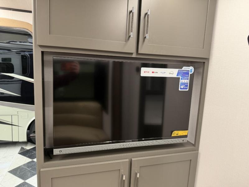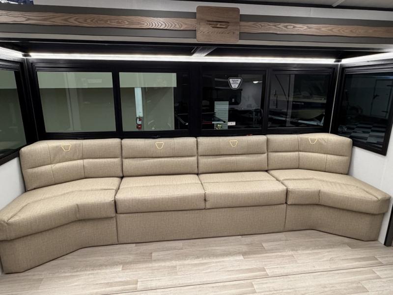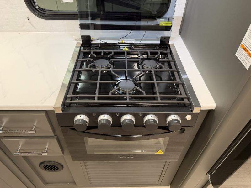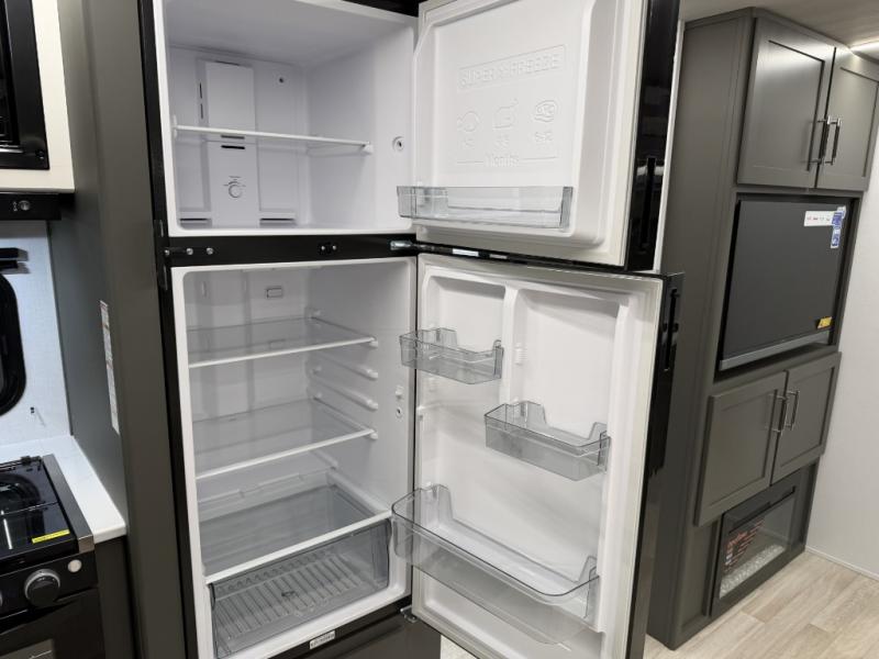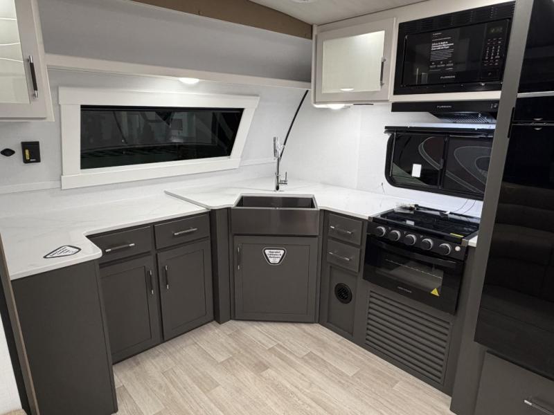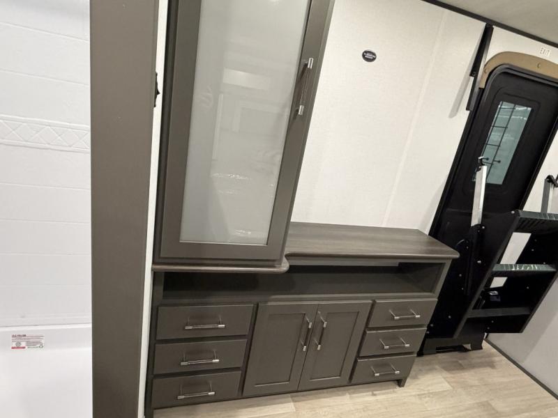 It won't be hard to feel right at home in this dual entry, front kitchen travel trailer! You will be impressed by the generous amount of solid surface countertops, along with an entryway pantry, a three burner range, and a 10 cu. ft. refrigerator. A Do-More dinette table and tri-fold sofa sit within a slide for more space, and the entertainment center with a fireplace is in great viewing for movie night. A walk-thru bath leads to the rear master bedroom, complete with a king bed slide, hanging storage, a wardrobe, and a dresser for ample storage space