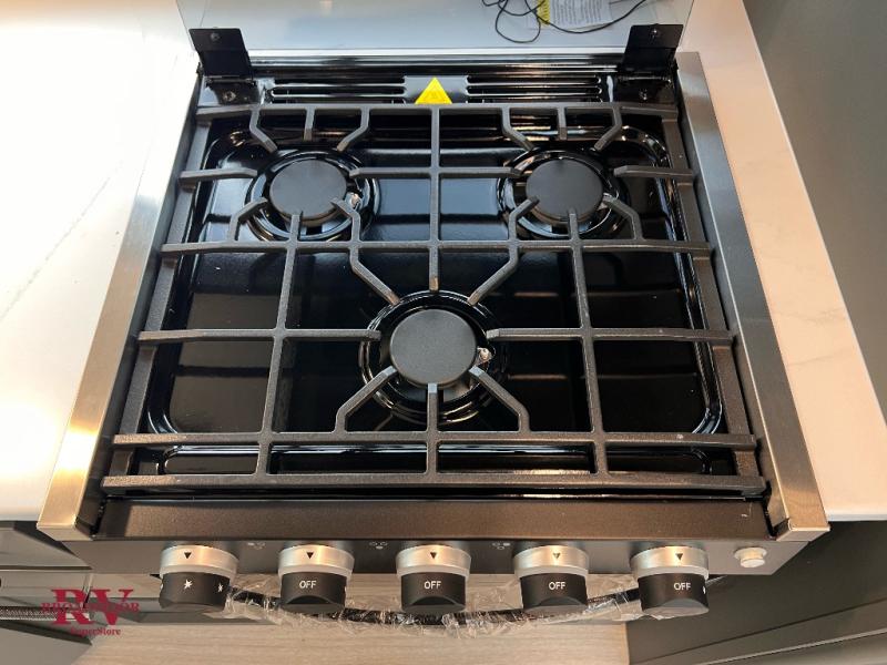 It won't be hard to feel right at home in this dual entry, front kitchen travel trailer! You will be impressed by the generous amount of solid surface countertops, along with an entryway pantry, a three burner range, and a 10 cu. ft. refrigerator. A Do-More dinette table and tri-fold sofa sit within a slide for more space, and the entertainment center with a fireplace is in great viewing for movie night. A walk-thru bath leads to the rear master bedroom, complete with a king bed slide, hanging storage, a wardrobe, and a dresser for ample storage space