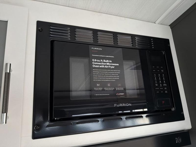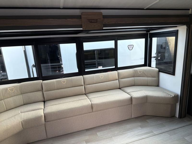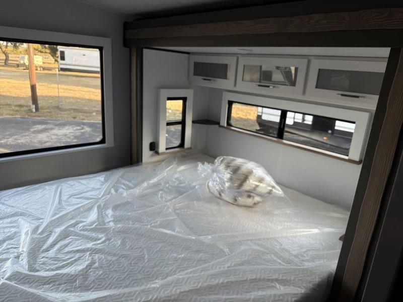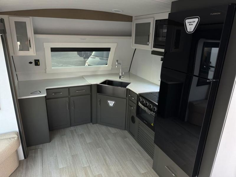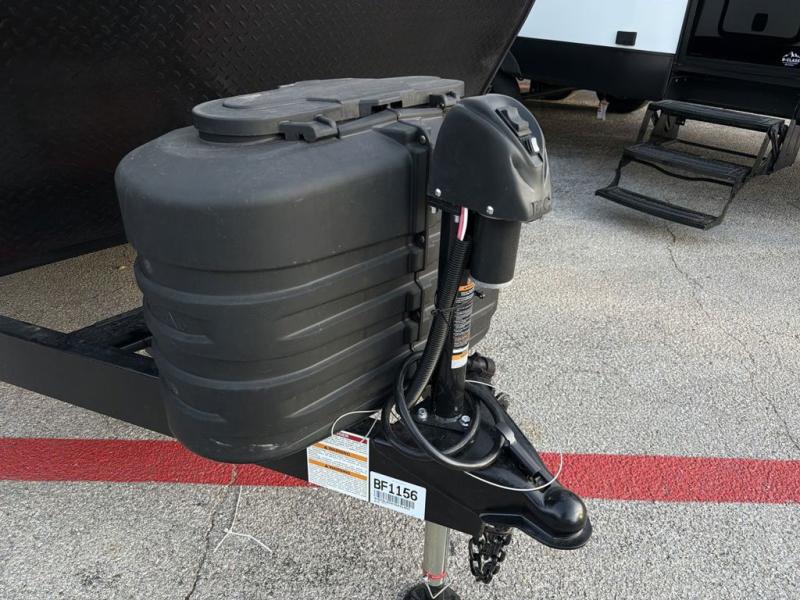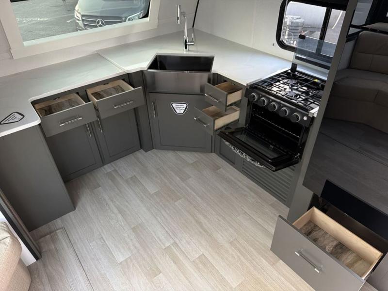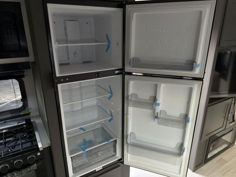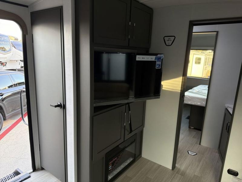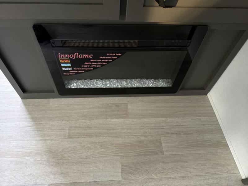 It won't be hard to feel right at home in this dual entry, front kitchen travel trailer! You will be impressed by the generous amount of solid surface countertops, along with an entryway pantry, a three burner range, and a 10 cu. ft. refrigerator. A Do-More dinette table and tri-fold sofa sit within a slide for more space, and the entertainment center with a fireplace is in great viewing for movie night. A walk-thru bath leads to the rear master bedroom, complete with a king bed slide, hanging storage, a wardrobe, and a dresser for ample storage space