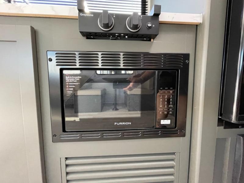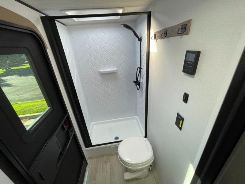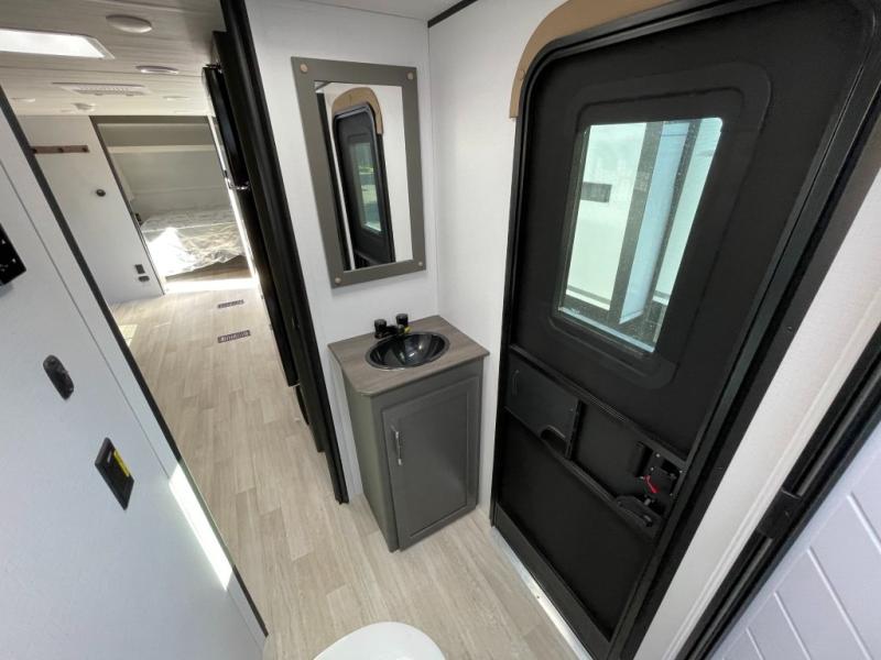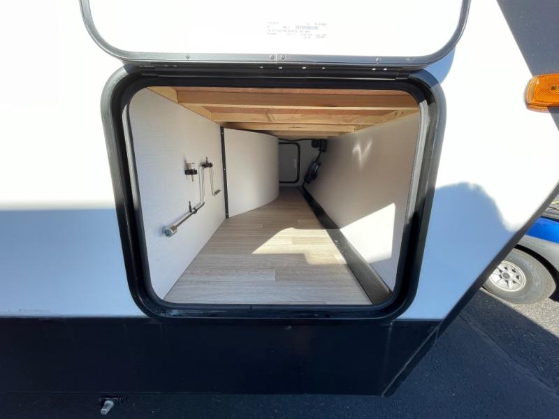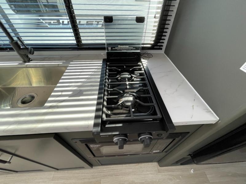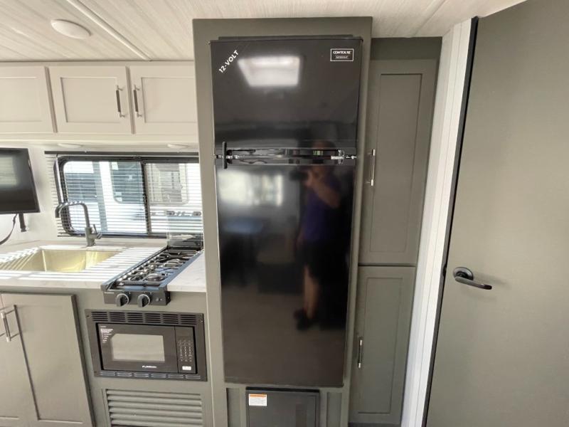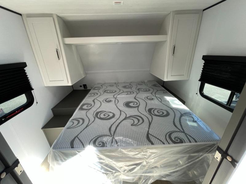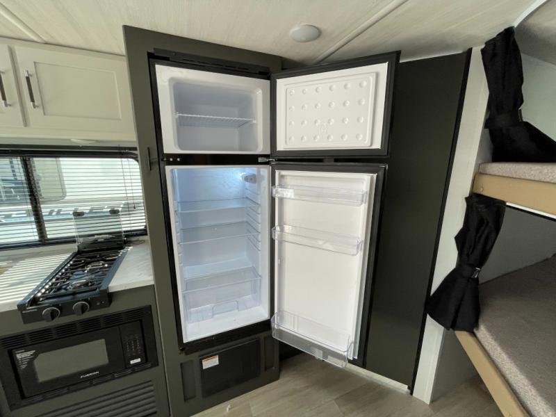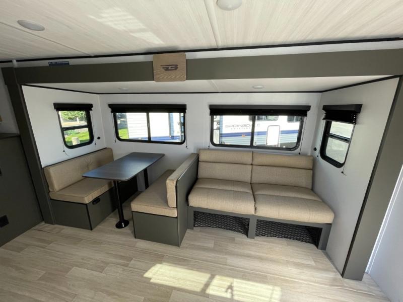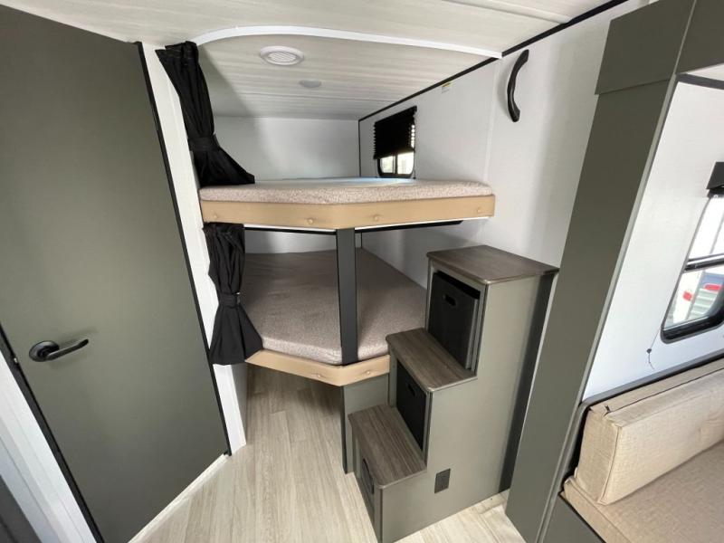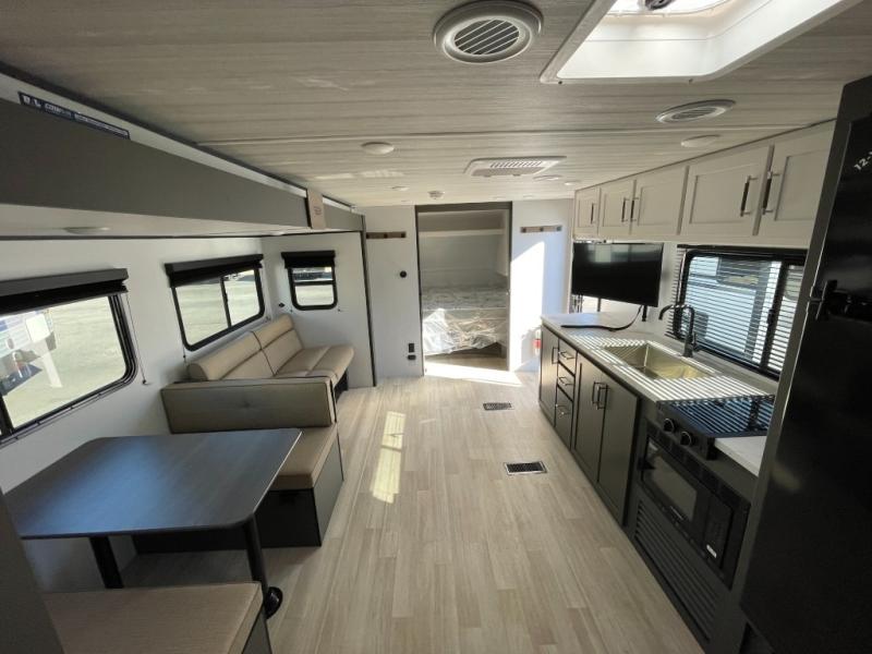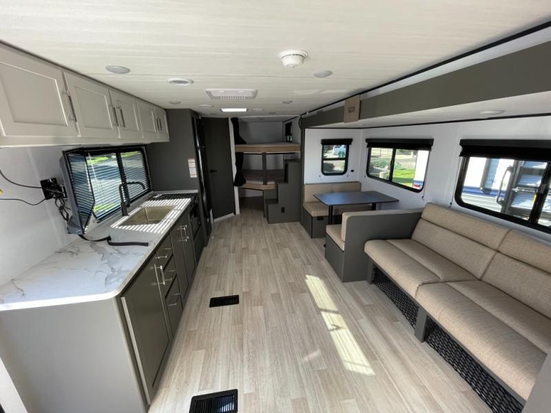 This travel trailer is designed for discerning families who crave adventure! The double-sized bunks provides a snug and inviting sleeping spot for kids, while the immaculately appointed full bathroom is thoughtfully designed for a refreshing stay. The kitchen is equipped with a generous pantry for storing gourmet ingredients, a high-performance refrigerator for keeping drinks and meals perfectly chilled, a rapid-cooking microwave, and a precision-crafted two-burner cooktop for preparing exquisite meals. Expansive overhead cabinets provide ample storage for fine china and cookware. The stylish booth dinette provides an intimate and convivial spot for meals and snacks, while the plush jackknife sofa offers a comfortable seating area that can be converted into a luxurious sleeping space. And after a long day in the woods, rest in the private front bedroom featuring a sumptuous queen-sized bed with a convenient nightstand and spacious dual wardrobes on each side.