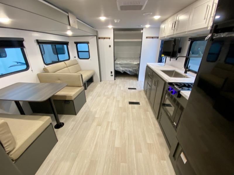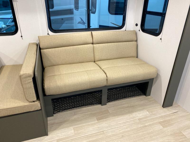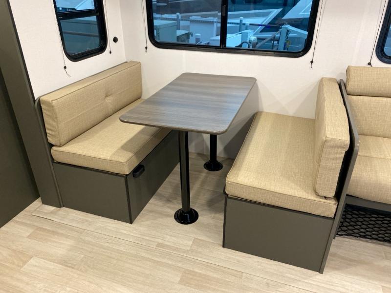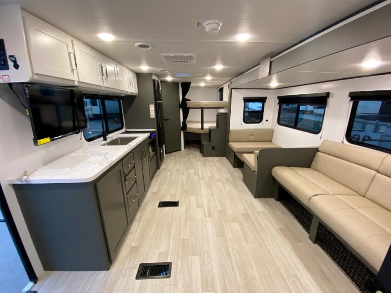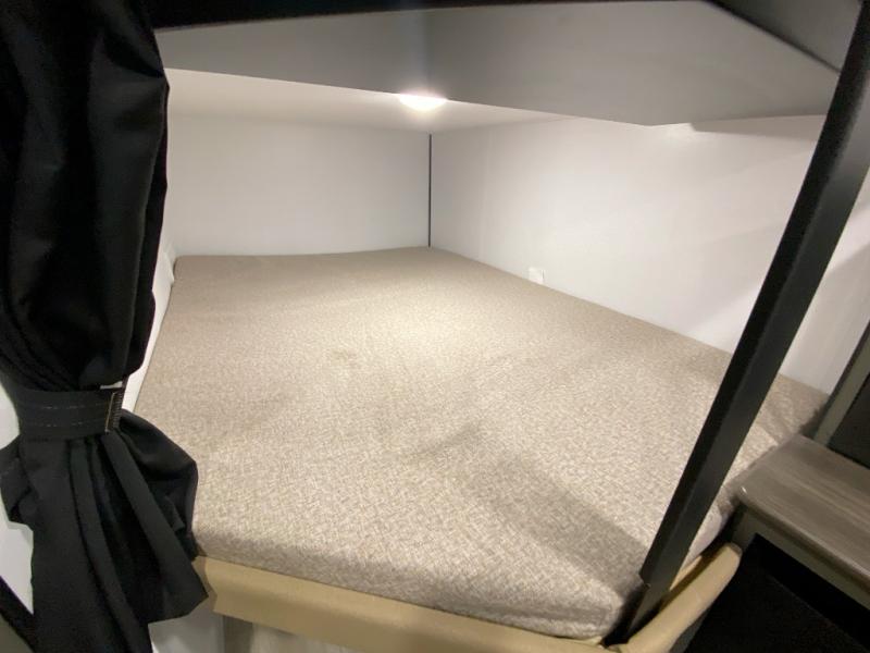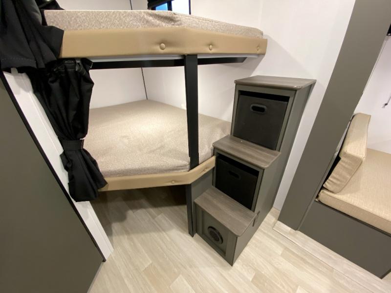 This travel trailer is designed for discerning families who crave adventure! The double-sized bunks provides a snug and inviting sleeping spot for kids, while the immaculately appointed full bathroom is thoughtfully designed for a refreshing stay. The kitchen is equipped with a generous pantry for storing gourmet ingredients, a high-performance refrigerator for keeping drinks and meals perfectly chilled, a rapid-cooking microwave, and a precision-crafted two-burner cooktop for preparing exquisite meals. Expansive overhead cabinets provide ample storage for fine china and cookware. The stylish booth dinette provides an intimate and convivial spot for meals and snacks, while the plush jackknife sofa offers a comfortable seating area that can be converted into a luxurious sleeping space. And after a long day in the woods, rest in the private front bedroom featuring a sumptuous queen-sized bed with a convenient nightstand and spacious dual wardrobes on each side.