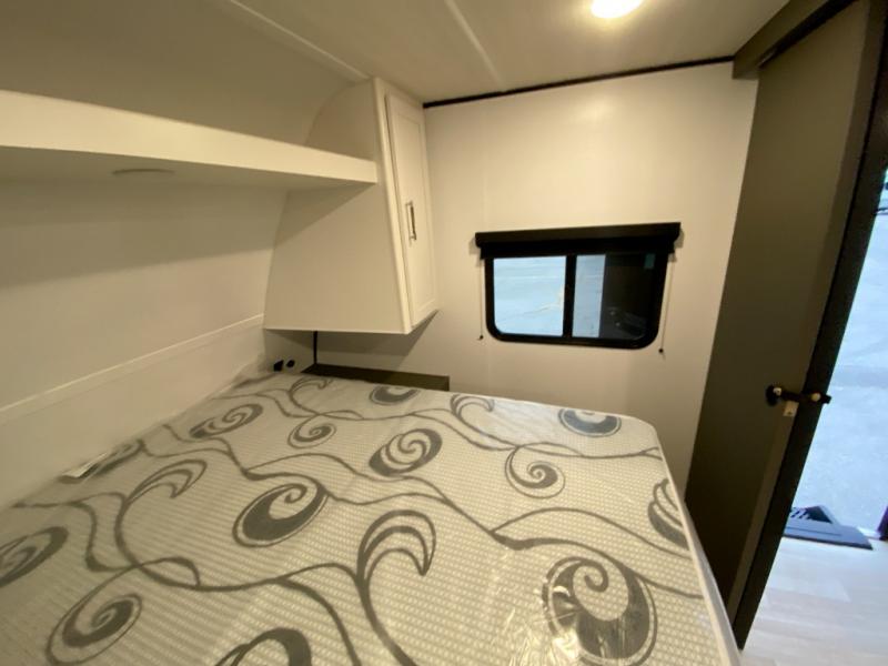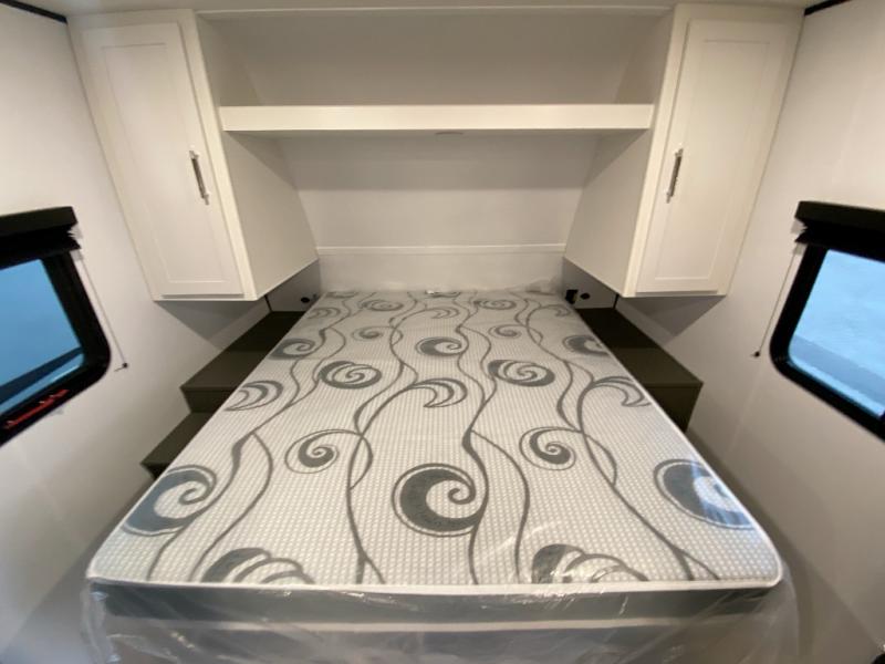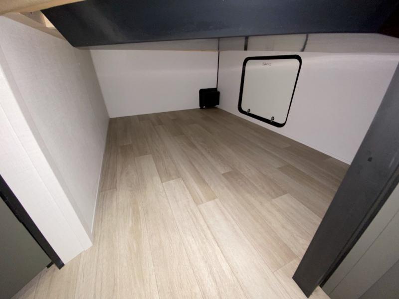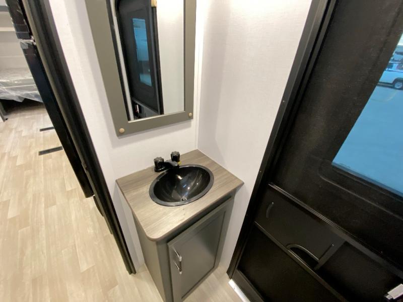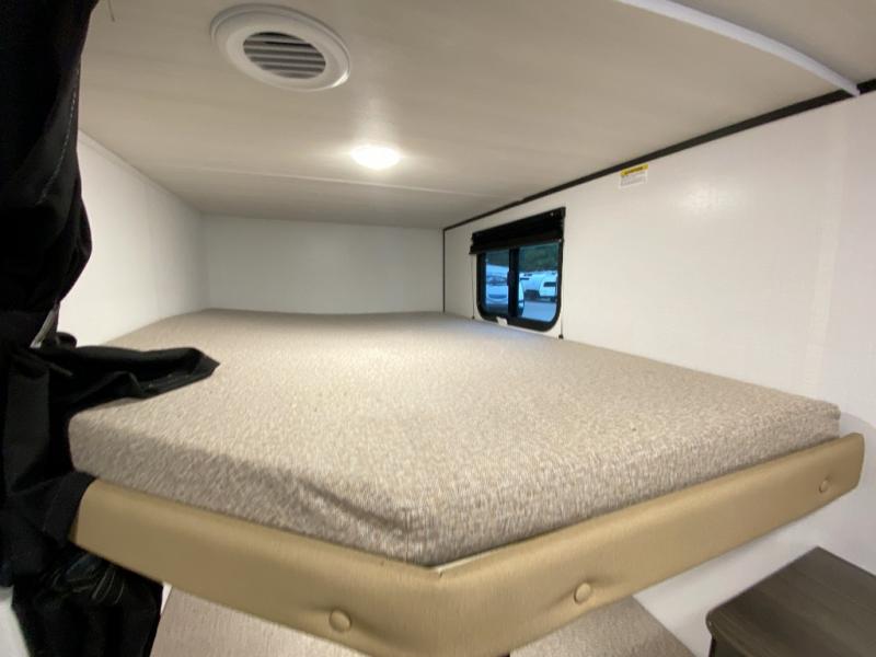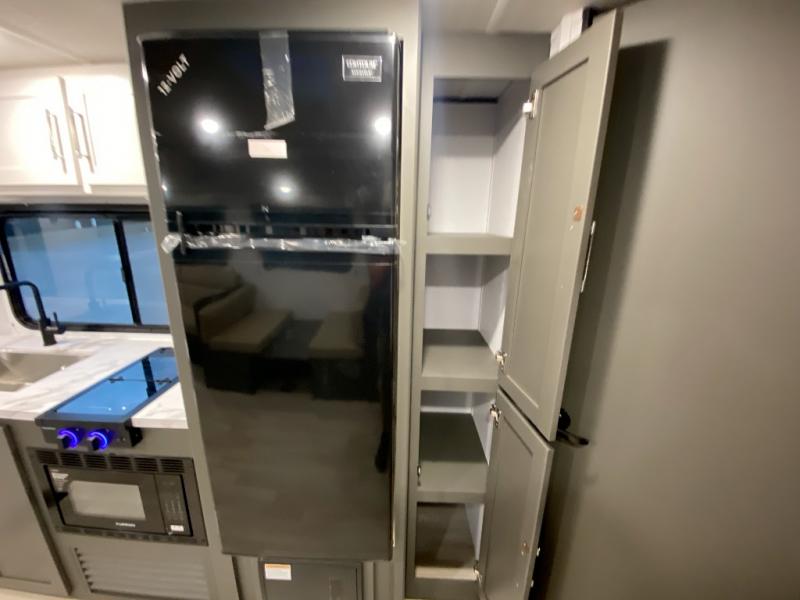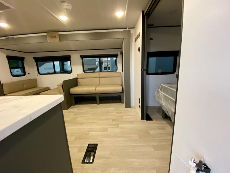 This travel trailer is designed for discerning families who crave adventure! The double-sized bunks provides a snug and inviting sleeping spot for kids, while the immaculately appointed full bathroom is thoughtfully designed for a refreshing stay. The kitchen is equipped with a generous pantry for storing gourmet ingredients, a high-performance refrigerator for keeping drinks and meals perfectly chilled, a rapid-cooking microwave, and a precision-crafted two-burner cooktop for preparing exquisite meals. Expansive overhead cabinets provide ample storage for fine china and cookware. The stylish booth dinette provides an intimate and convivial spot for meals and snacks, while the plush jackknife sofa offers a comfortable seating area that can be converted into a luxurious sleeping space. And after a long day in the woods, rest in the private front bedroom featuring a sumptuous queen-sized bed with a convenient nightstand and spacious dual wardrobes on each side.