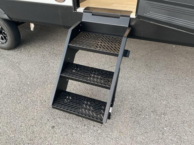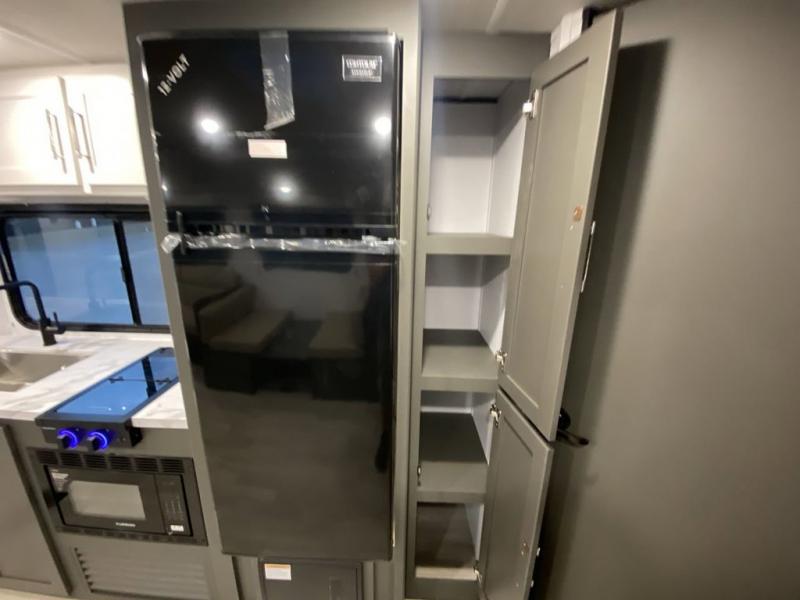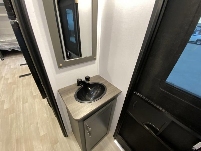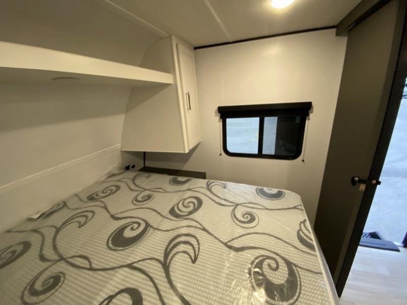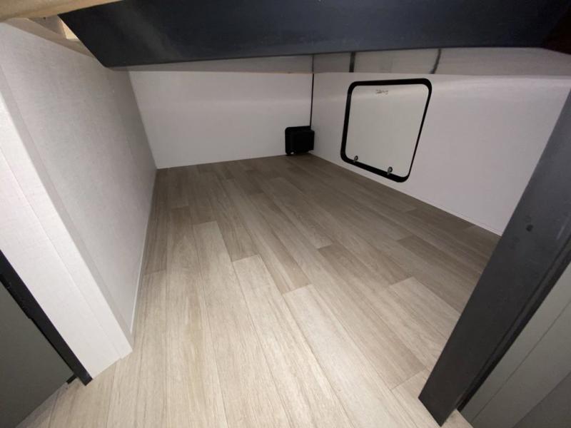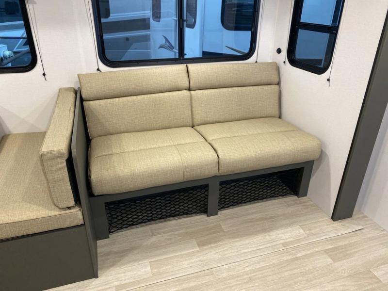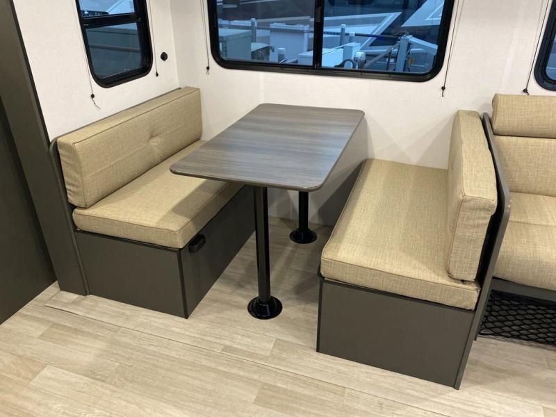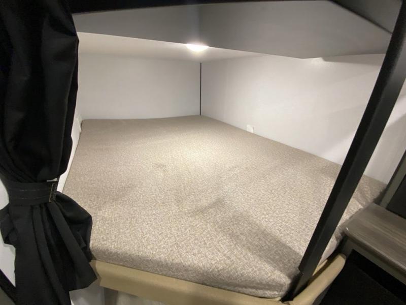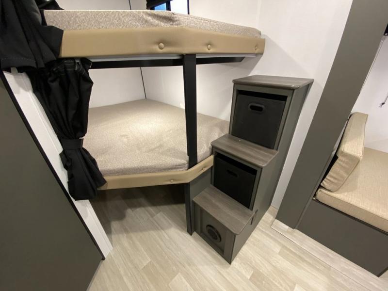 This travel trailer is designed for discerning families who crave adventure! The double-sized bunks provides a snug and inviting sleeping spot for kids, while the immaculately appointed full bathroom is thoughtfully designed for a refreshing stay. The kitchen is equipped with a generous pantry for storing gourmet ingredients, a high-performance refrigerator for keeping drinks and meals perfectly chilled, a rapid-cooking microwave, and a precision-crafted two-burner cooktop for preparing exquisite meals. Expansive overhead cabinets provide ample storage for fine china and cookware. The stylish booth dinette provides an intimate and convivial spot for meals and snacks, while the plush jackknife sofa offers a comfortable seating area that can be converted into a luxurious sleeping space. And after a long day in the woods, rest in the private front bedroom featuring a sumptuous queen-sized bed with a convenient nightstand and spacious dual wardrobes on each side.