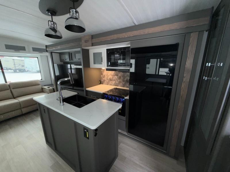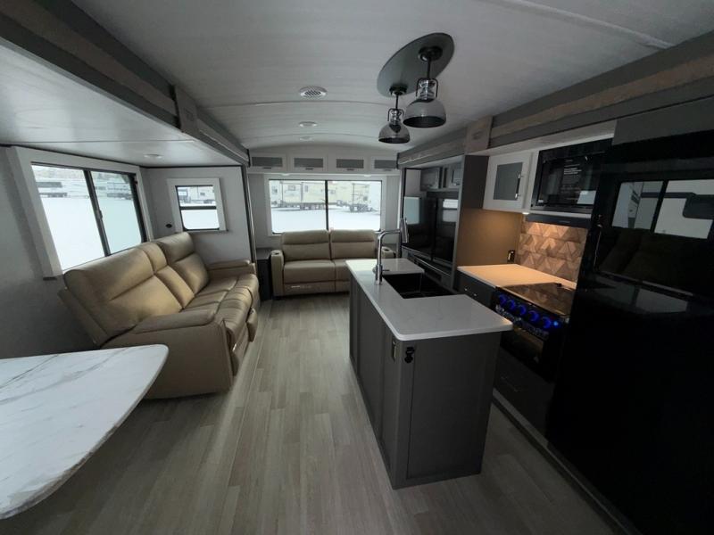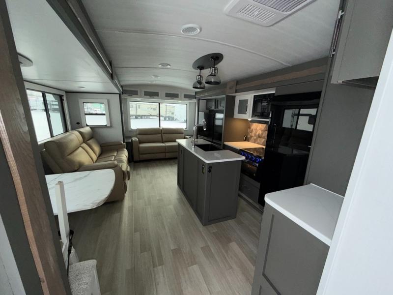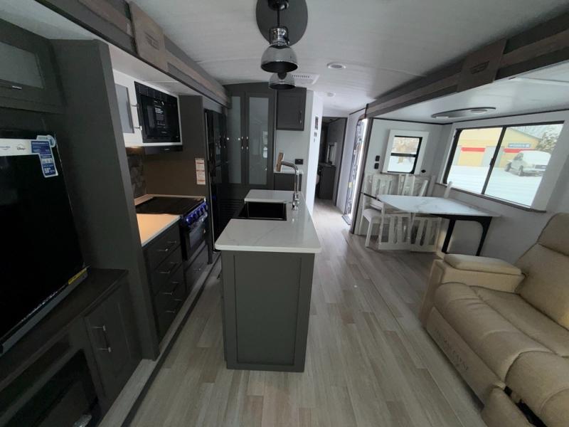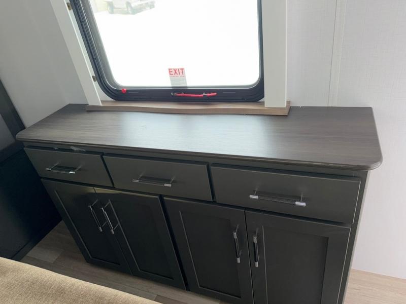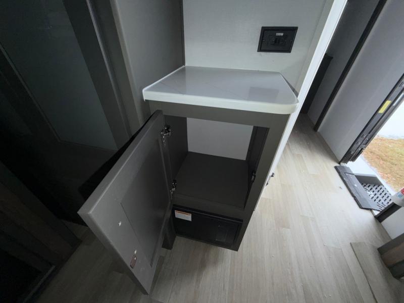 You'll be camping in style with this trailer in tow. You will wake up each morning on a king bed slide out, and there is a closet up front to easily get dressed. A wardrobe with TV prep is also found in the bedroom, along with washer/dryer prep to make wash day easier than ever. If you had guests stay over, they'll be waking up on the tri-fold sofa in the rear living area. Once everyone is ready for the day, you can make breakfast on the three burner cooktop or in the microwave oven, and there is a 10 cu. ft. refrigerator where milk and eggs can go back in. This Bullet kitchen also includes a kitchen island, a pantry, plus a hutch for ample storage space!