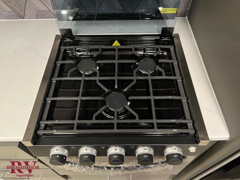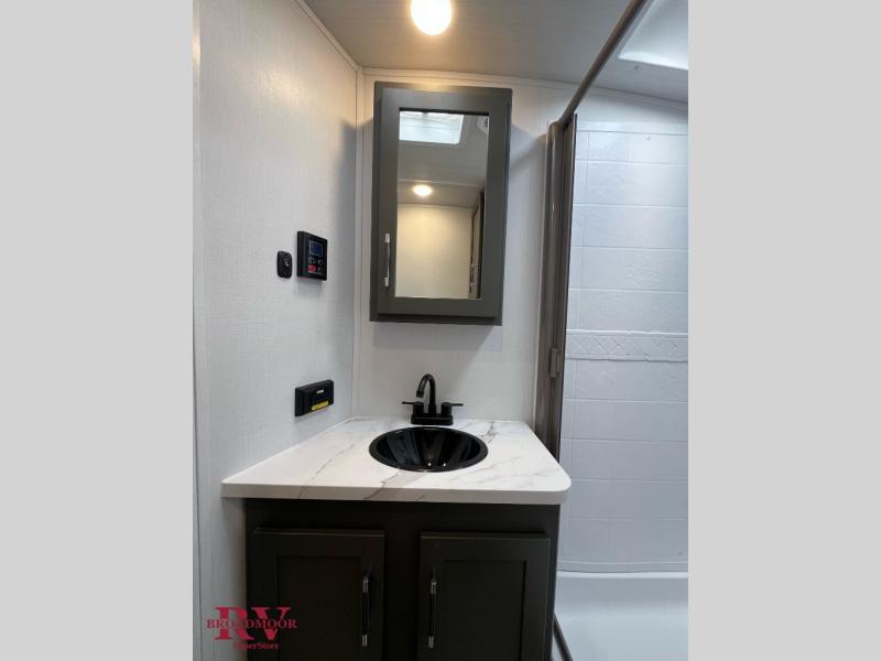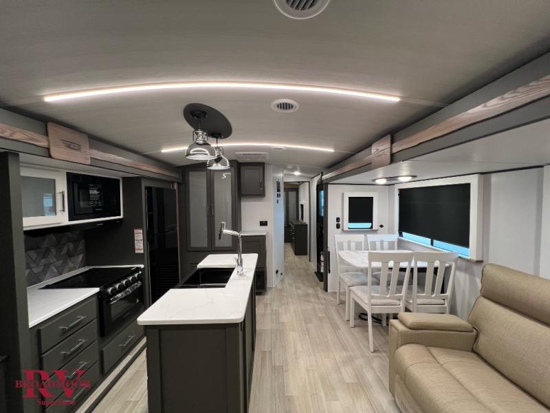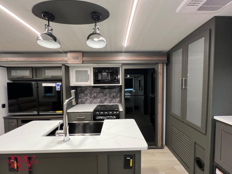 You'll be camping in style with this trailer in tow. You will wake up each morning on a king bed slide out, and there is a closet up front to easily get dressed. A wardrobe with TV prep is also found in the bedroom, along with washer/dryer prep to make wash day easier than ever. If you had guests stay over, they'll be waking up on the tri-fold sofa in the rear living area. Once everyone is ready for the day, you can make breakfast on the three burner cooktop or in the microwave oven, and there is a 10 cu. ft. refrigerator where milk and eggs can go back in. This Bullet kitchen also includes a kitchen island, a pantry, plus a hutch for ample storage space!