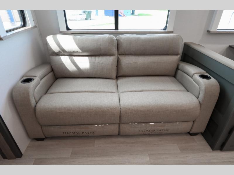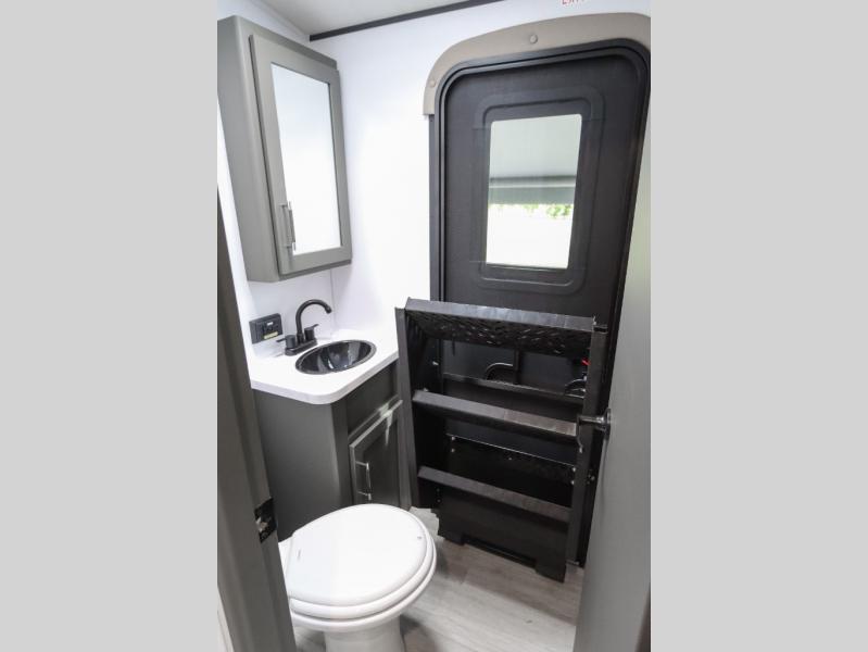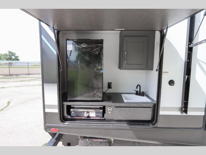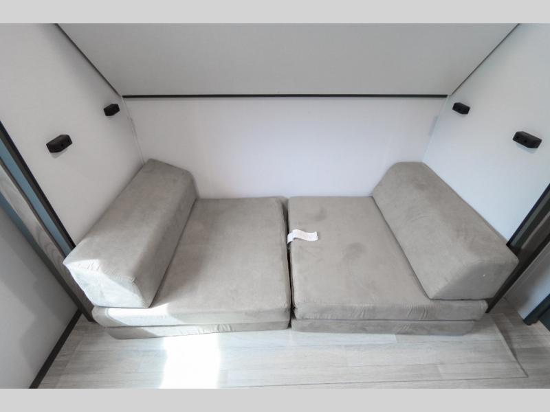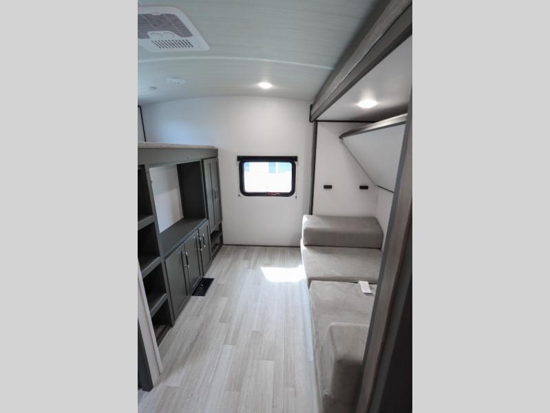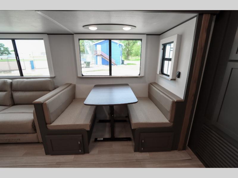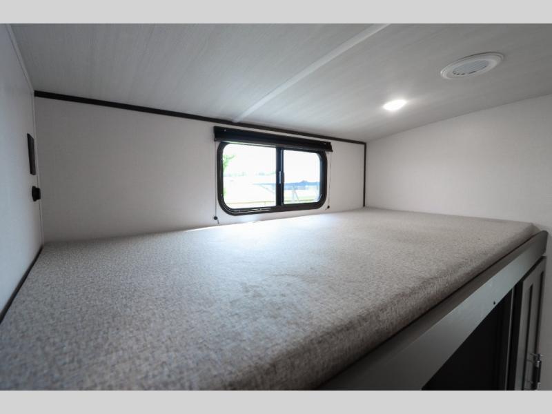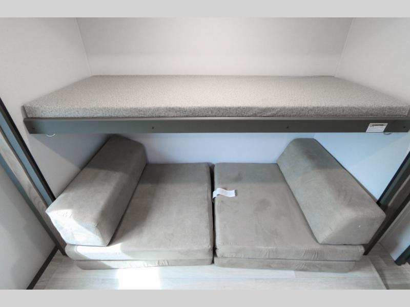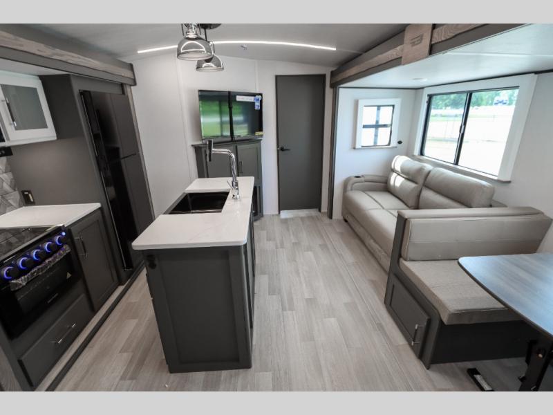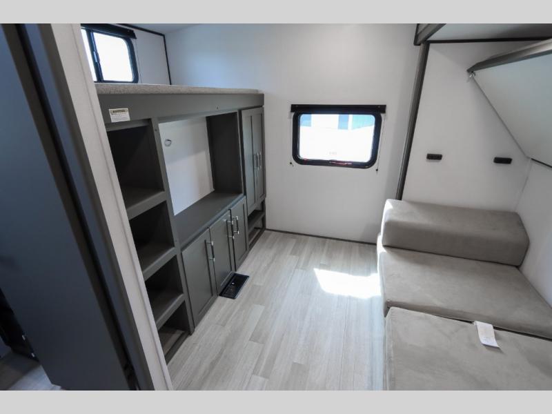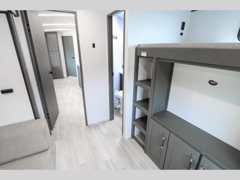 This travel trailer is one the whole gang will love! There is a rear private bunkhouse suite for your guests or the kids, plus a front master bedroom for you. The bunkhouse includes a tri-fold sofa with a flip-up bunk across from a second bunk, plus there is a half bath with its own exterior entry door! The full walk-through bath leads into the front bedroom where you'll find a queen bed, dual wardrobes and a laundry chute so you can throw clothes directly into the pass-through. A super slide in the combined living area and kitchen will provide ample space to move about, and you will find comfy seating on the tri-fold sofa and Do-More dinette table. There is even a fireplace and an entertainment center!