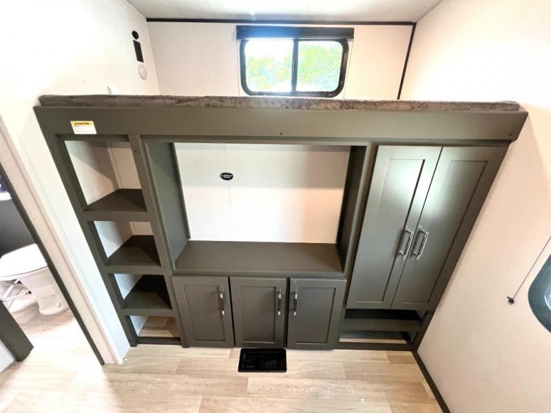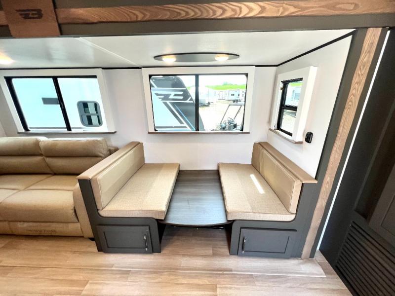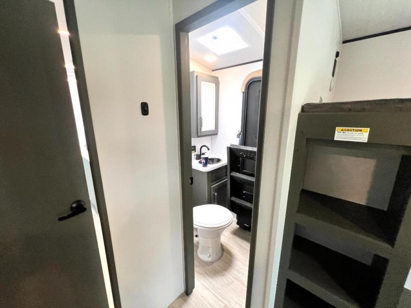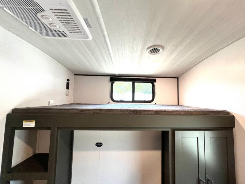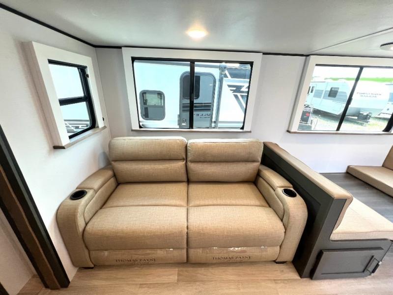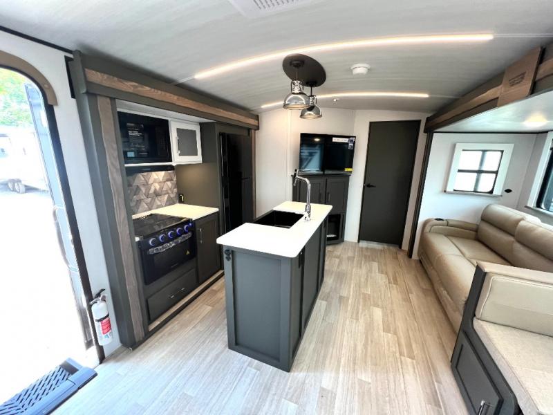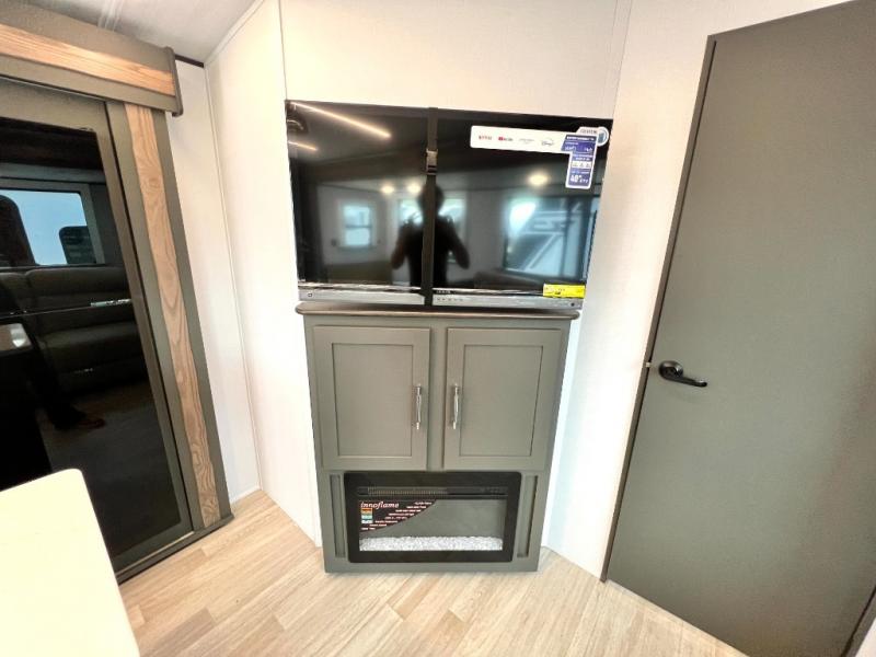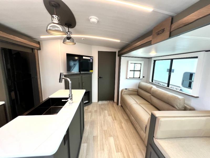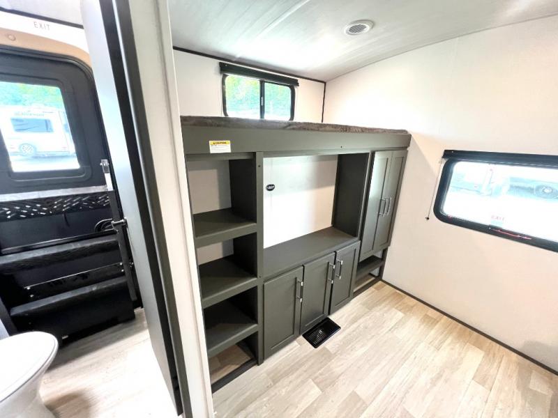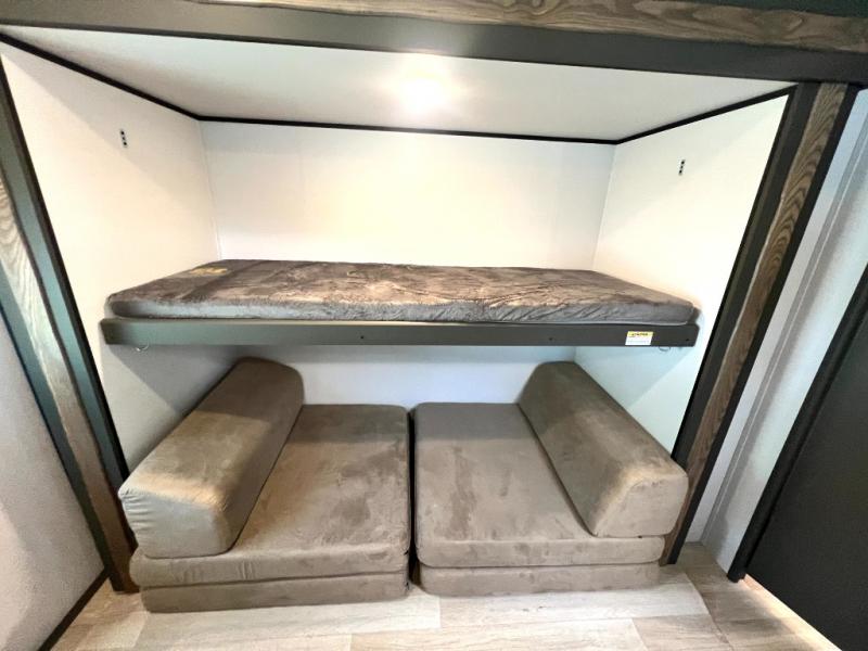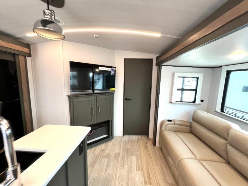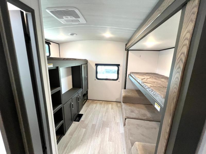 This travel trailer is one the whole gang will love! There is a rear private bunkhouse suite for your guests or the kids, plus a front master bedroom for you. The bunkhouse includes a tri-fold sofa with a flip-up bunk across from a second bunk, plus there is a half bath with its own exterior entry door! The full walk-through bath leads into the front bedroom where you'll find a queen bed and dual wardrobes to keep your room tidy. Dual opposing slides in the combined living area and kitchen will provide ample space to move about, and you will find comfy seating on the tri-fold sofa and Do-More dinette table. There is even a fireplace and an entertainment center!