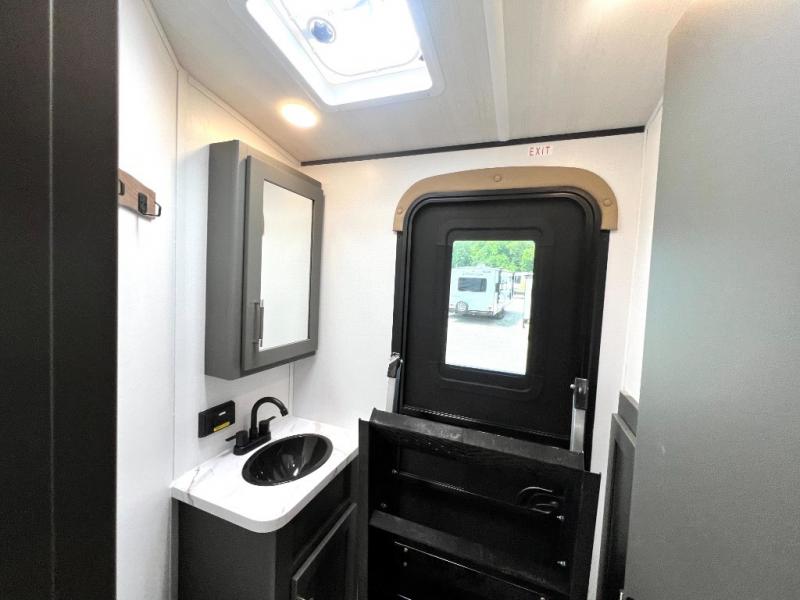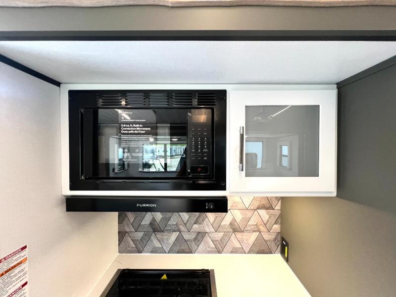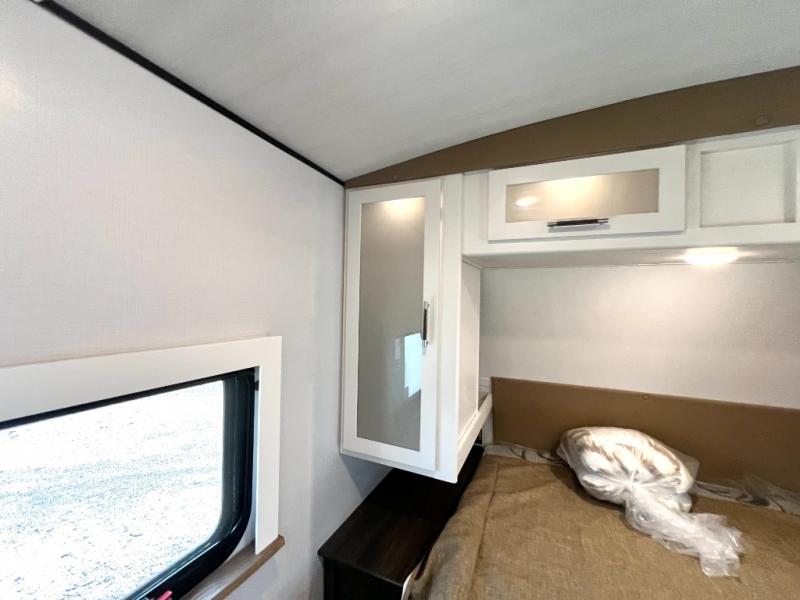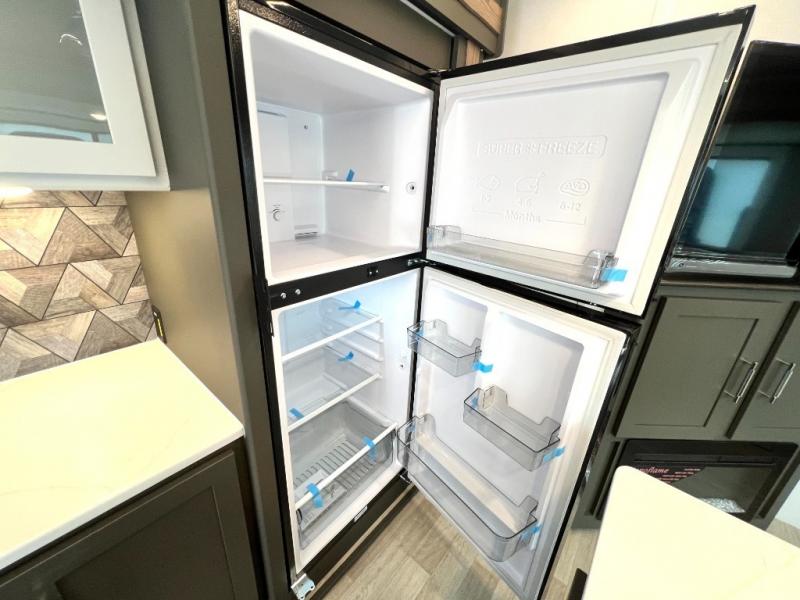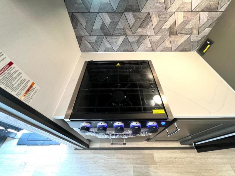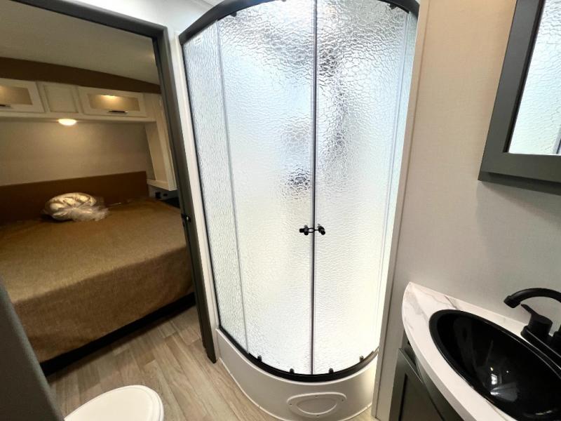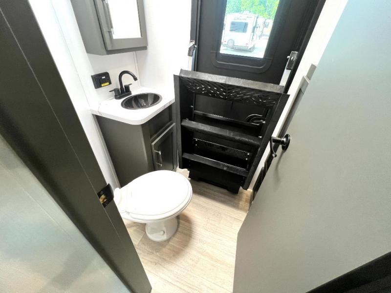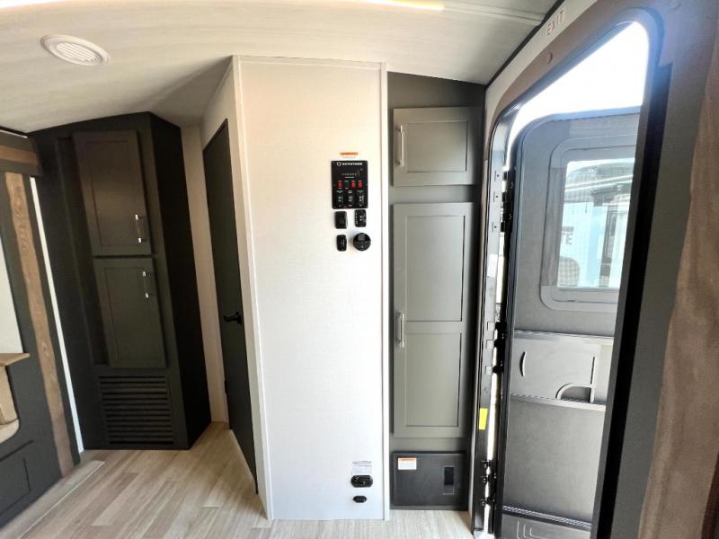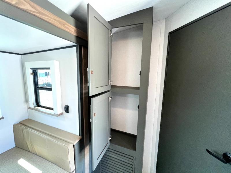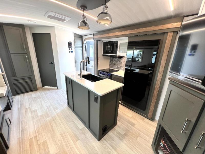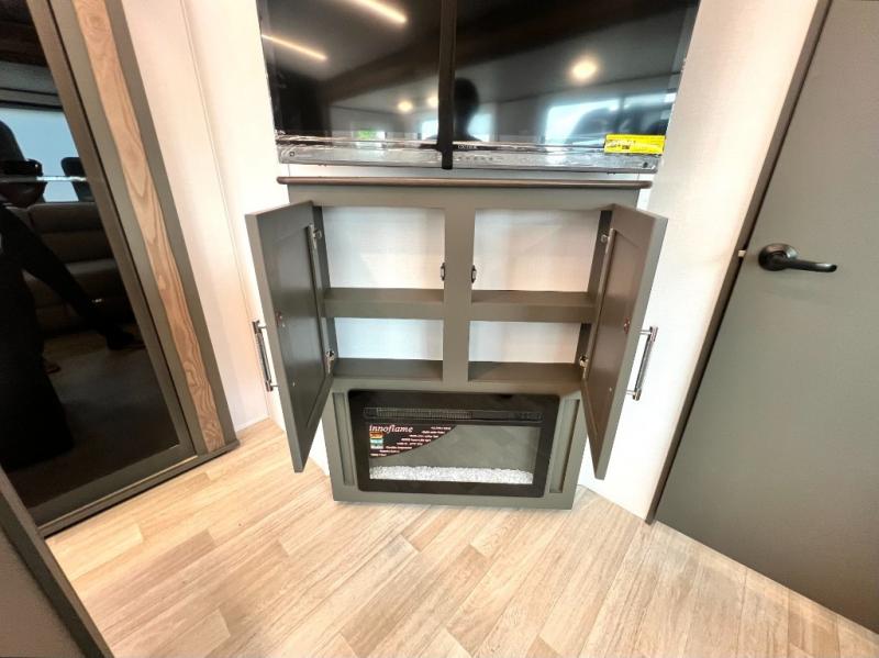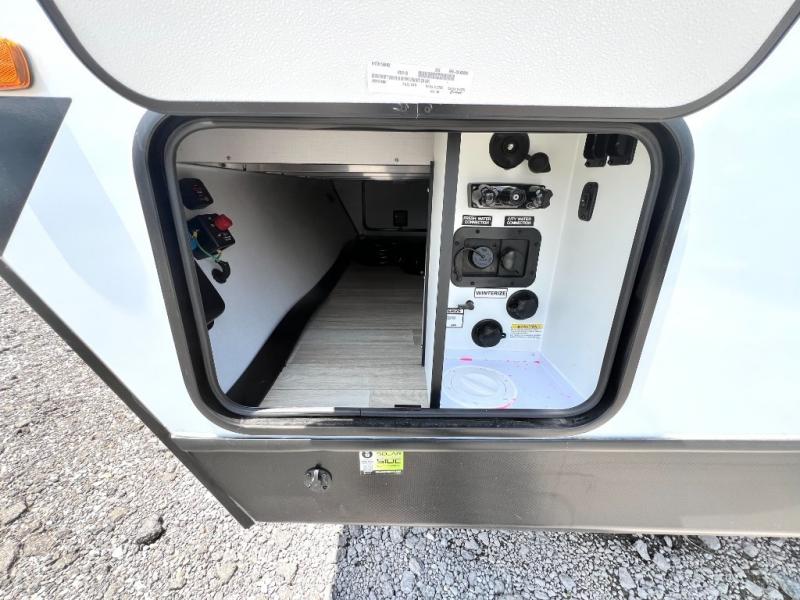 This travel trailer is one the whole gang will love! There is a rear private bunkhouse suite for your guests or the kids, plus a front master bedroom for you. The bunkhouse includes a tri-fold sofa with a flip-up bunk across from a second bunk, plus there is a half bath with its own exterior entry door! The full walk-through bath leads into the front bedroom where you'll find a queen bed and dual wardrobes to keep your room tidy. Dual opposing slides in the combined living area and kitchen will provide ample space to move about, and you will find comfy seating on the tri-fold sofa and Do-More dinette table. There is even a fireplace and an entertainment center!