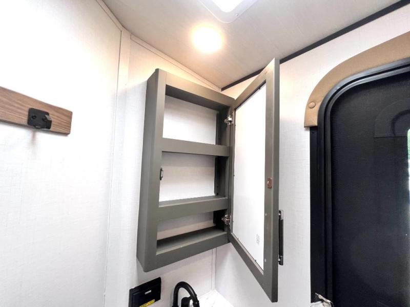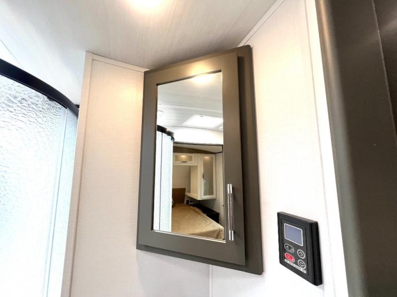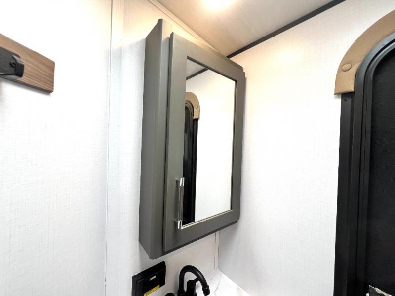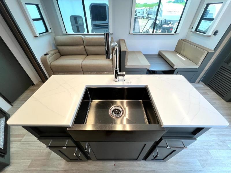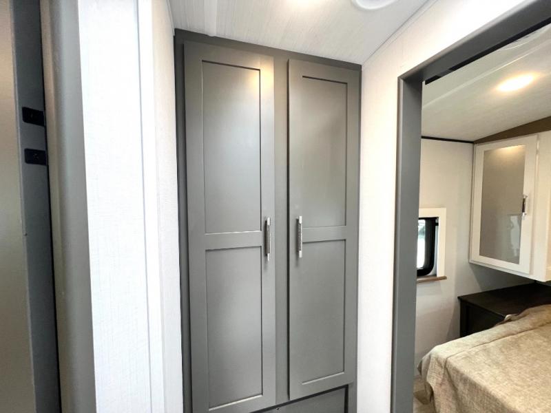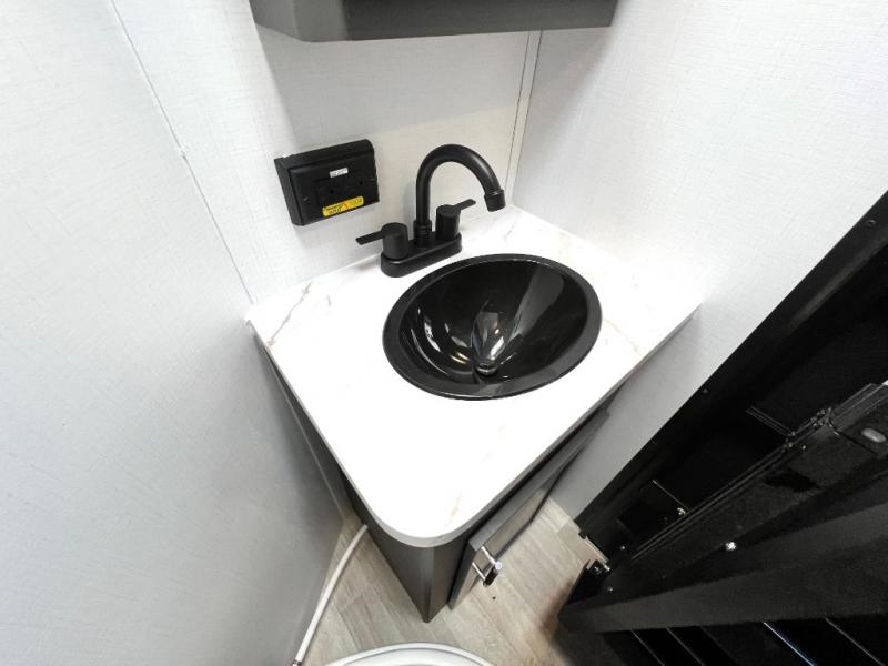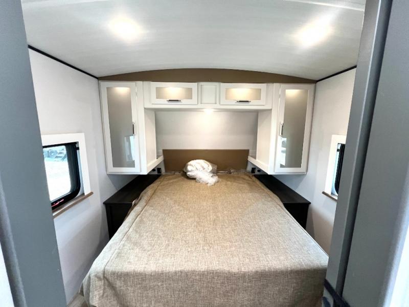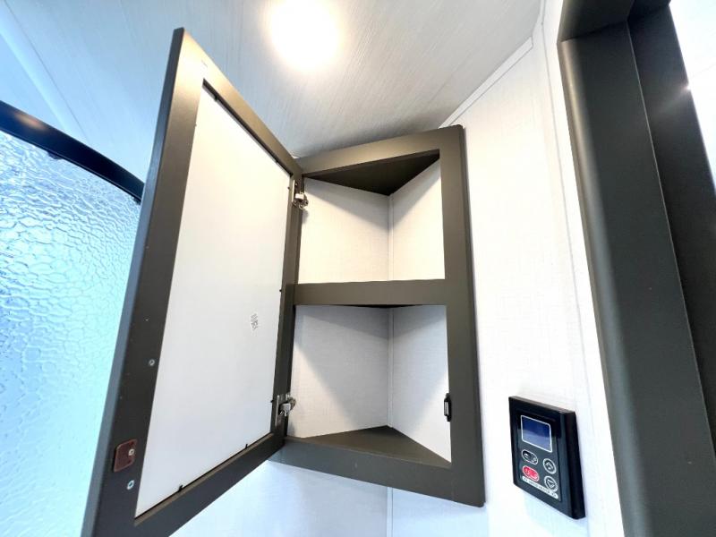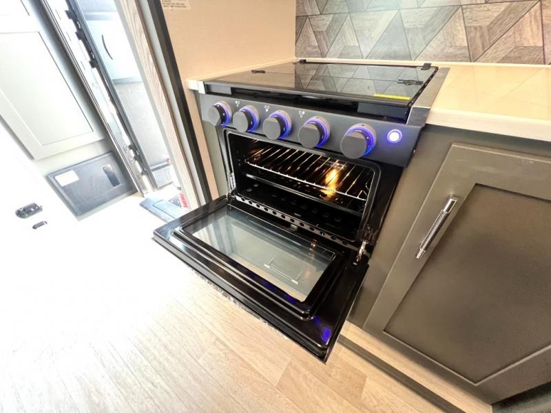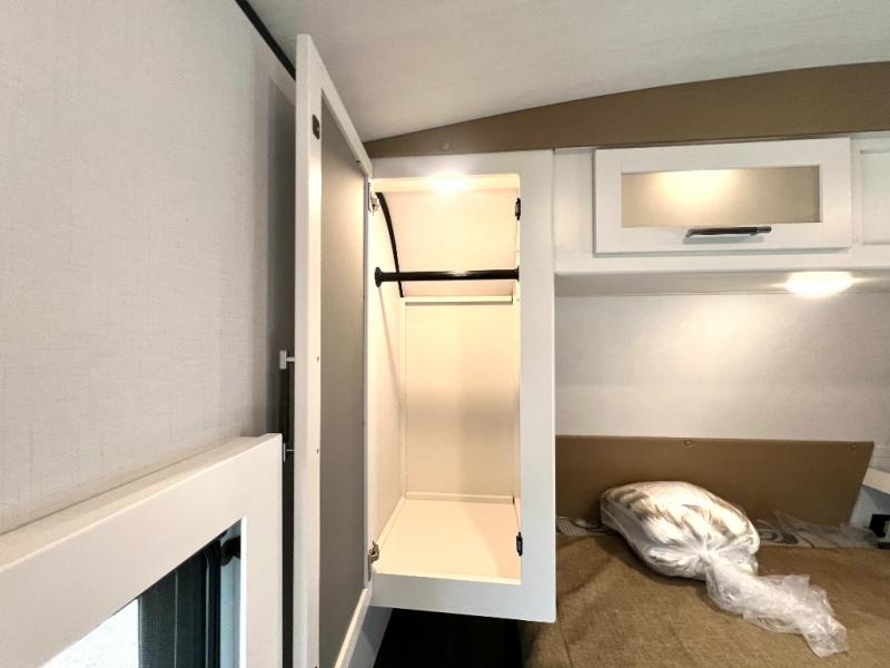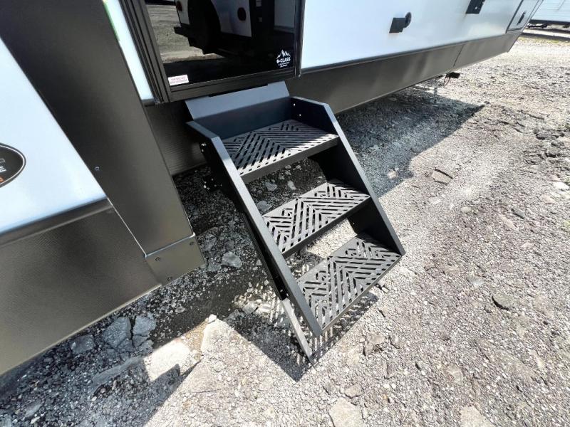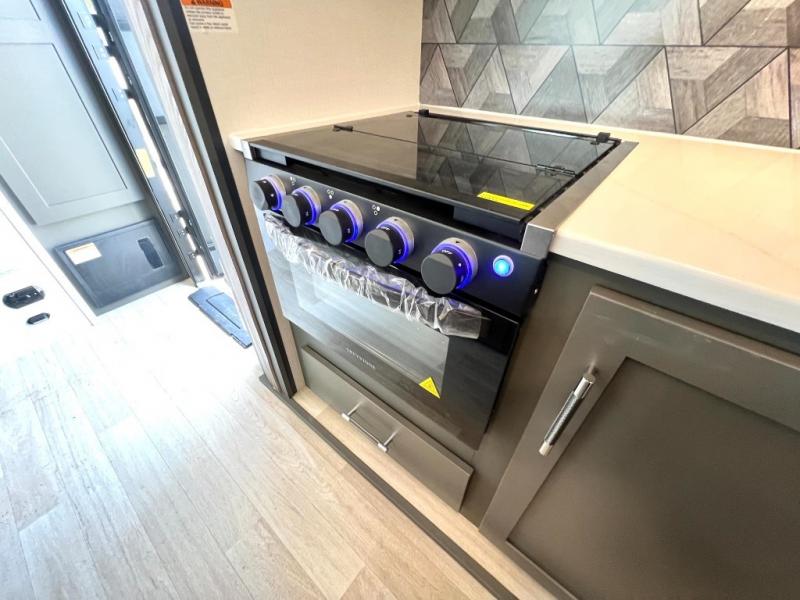 This travel trailer is one the whole gang will love! There is a rear private bunkhouse suite for your guests or the kids, plus a front master bedroom for you. The bunkhouse includes a tri-fold sofa with a flip-up bunk across from a second bunk, plus there is a half bath with its own exterior entry door! The full walk-through bath leads into the front bedroom where you'll find a queen bed and dual wardrobes to keep your room tidy. Dual opposing slides in the combined living area and kitchen will provide ample space to move about, and you will find comfy seating on the tri-fold sofa and Do-More dinette table. There is even a fireplace and an entertainment center!
