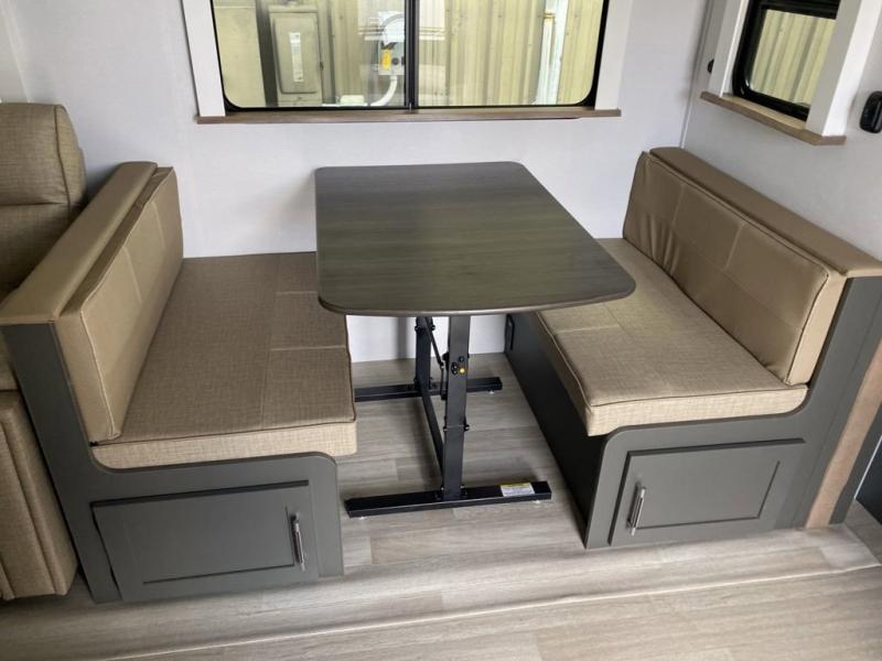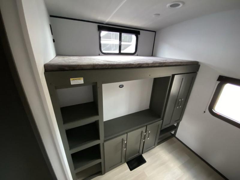 This travel trailer is one the whole gang will love! There is a rear private bunkhouse suite for your guests or the kids, plus a front master bedroom for you. The bunkhouse includes a tri-fold sofa with a flip-up bunk across from a second bunk, plus there is a half bath with its own exterior entry door! The full walk-through bath leads into the front bedroom where you'll find a queen bed and dual wardrobes to keep your room tidy. Dual opposing slides in the combined living area and kitchen will provide ample space to move about, and you will find comfy seating on the tri-fold sofa and Do-More dinette table. There is even a fireplace and an entertainment center!