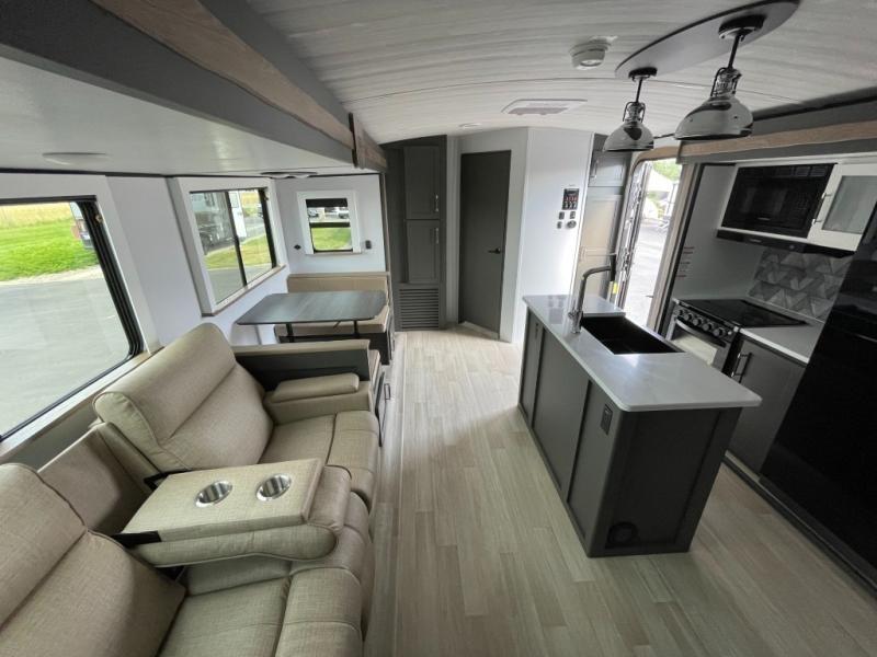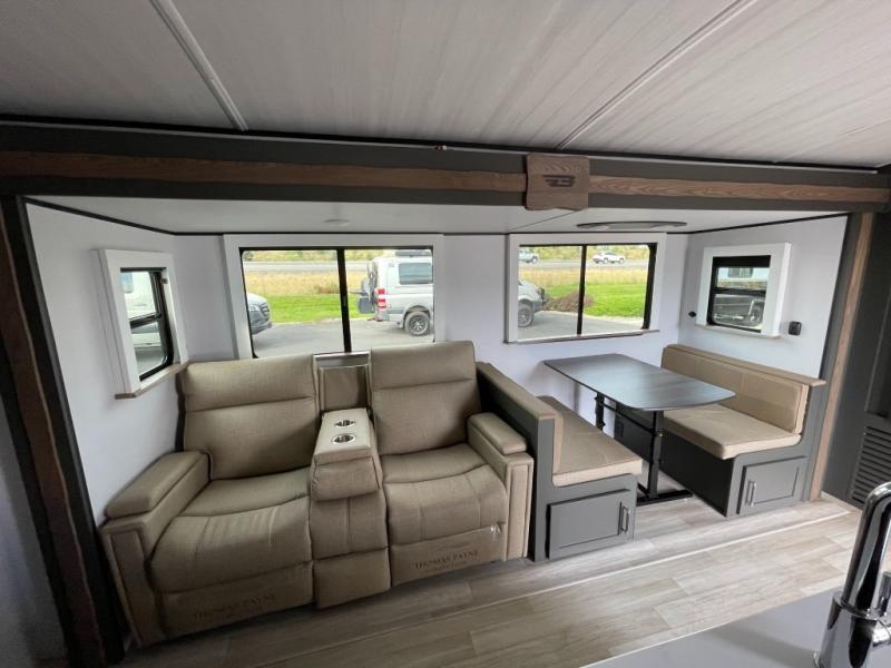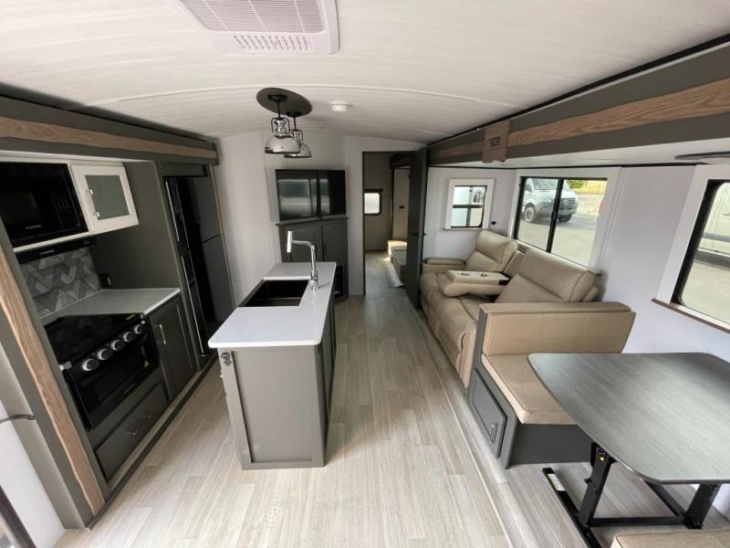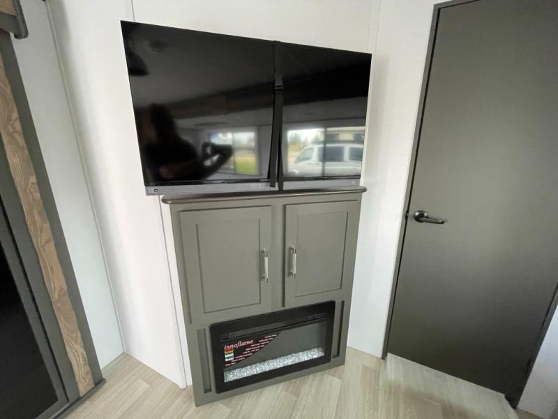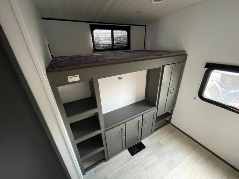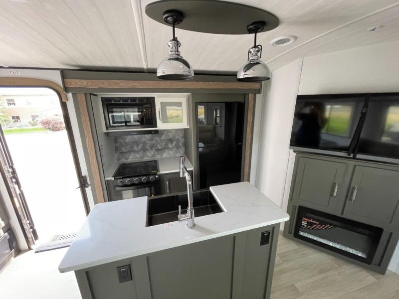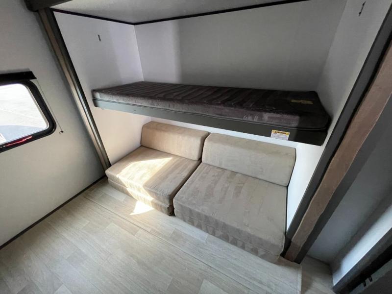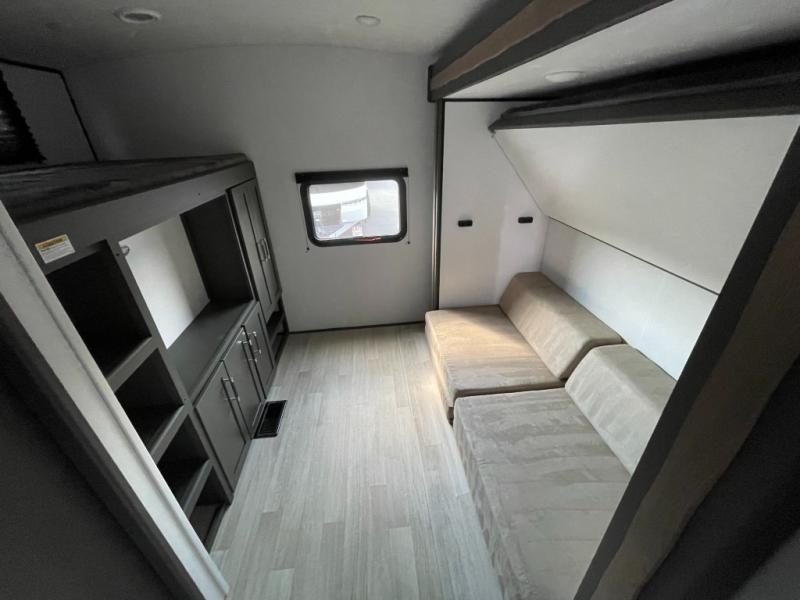 This travel trailer is one the whole gang will love! There is a rear private bunkhouse suite for your guests or the kids, plus a front master bedroom for you. The bunkhouse includes a tri-fold sofa with a flip-up bunk across from a second bunk, plus there is a half bath with its own exterior entry door! The full walk-through bath leads into the front bedroom where you'll find a queen bed and dual wardrobes to keep your room tidy. Dual opposing slides in the combined living area and kitchen will provide ample space to move about, and you will find comfy seating on the tri-fold sofa and Do-More dinette table. There is even a fireplace and an entertainment center!
