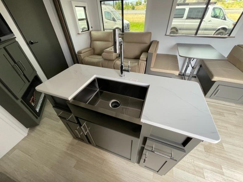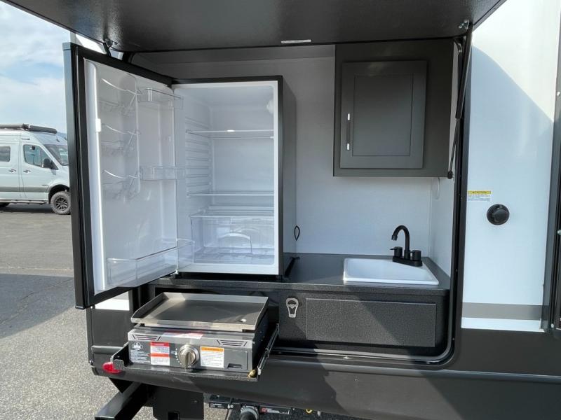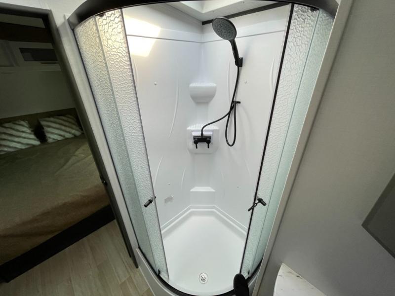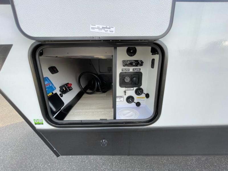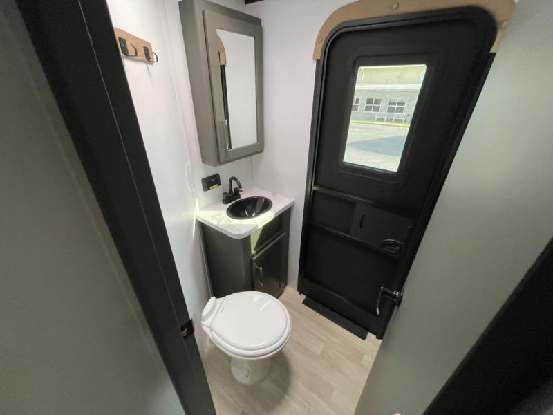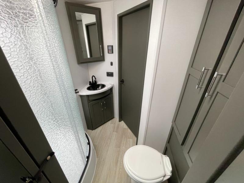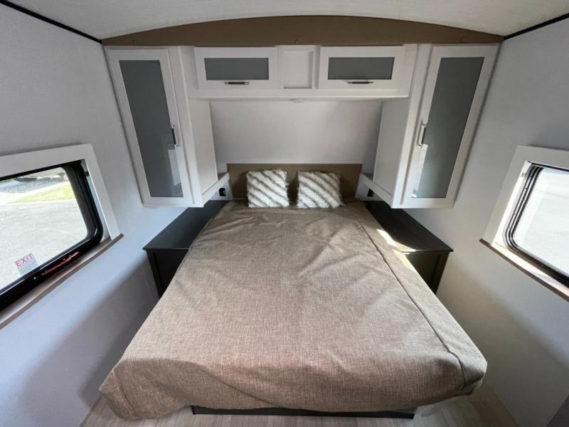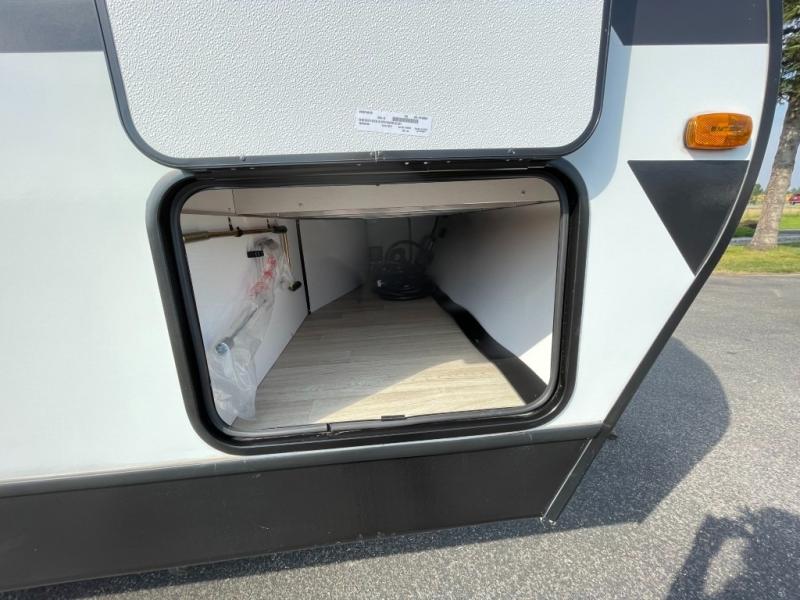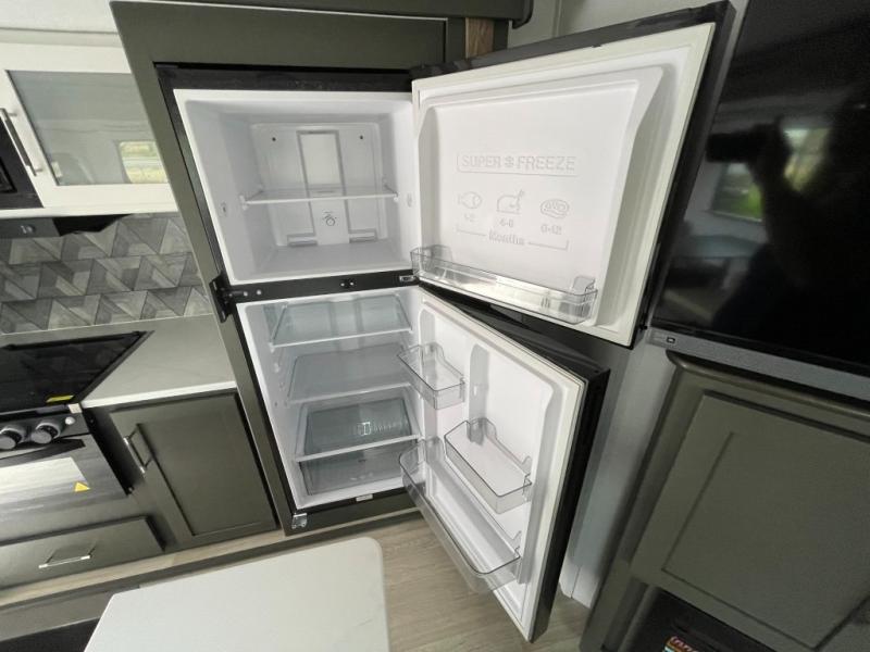 This travel trailer is one the whole gang will love! There is a rear private bunkhouse suite for your guests or the kids, plus a front master bedroom for you. The bunkhouse includes a tri-fold sofa with a flip-up bunk across from a second bunk, plus there is a half bath with its own exterior entry door! The full walk-through bath leads into the front bedroom where you'll find a queen bed and dual wardrobes to keep your room tidy. Dual opposing slides in the combined living area and kitchen will provide ample space to move about, and you will find comfy seating on the tri-fold sofa and Do-More dinette table. There is even a fireplace and an entertainment center!