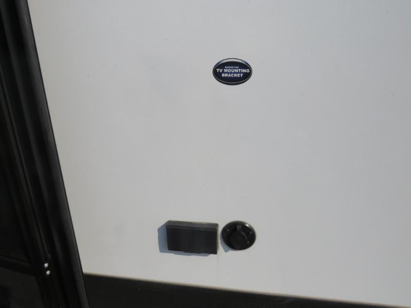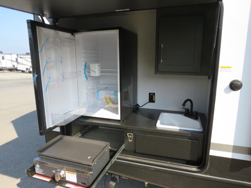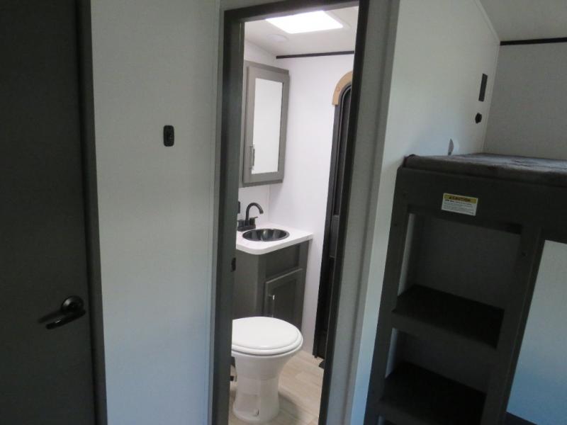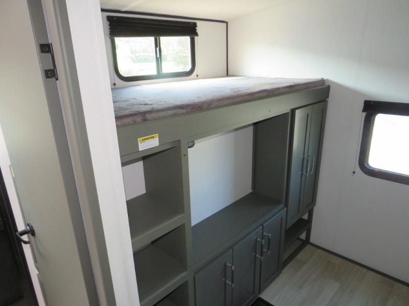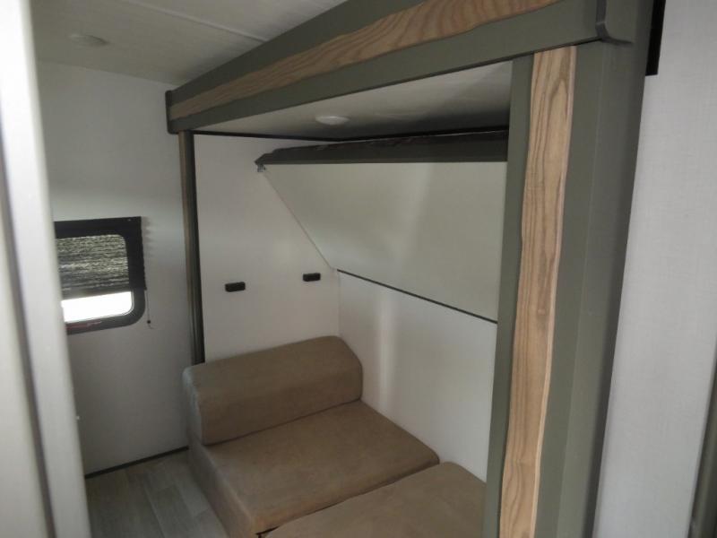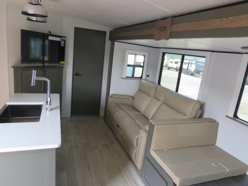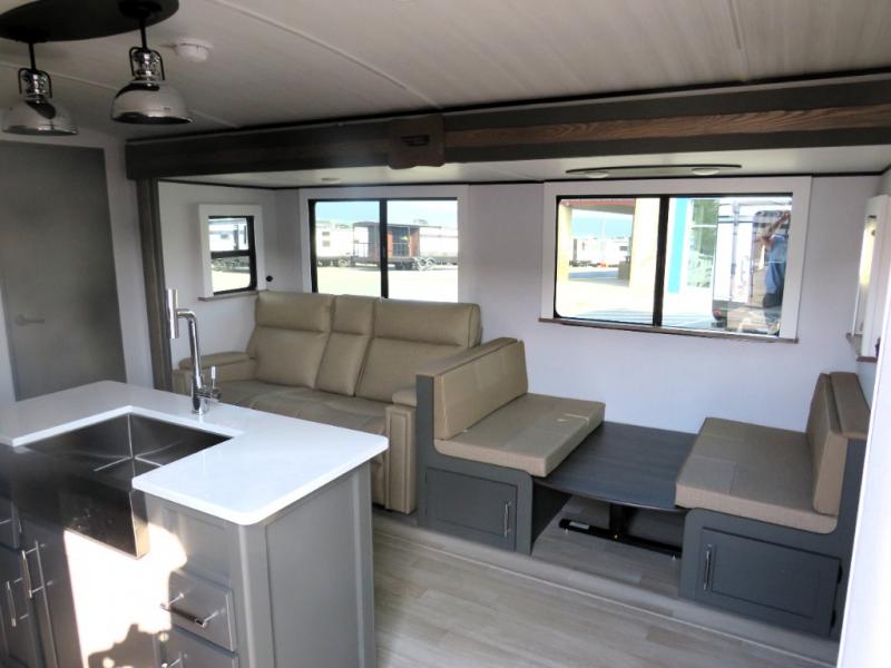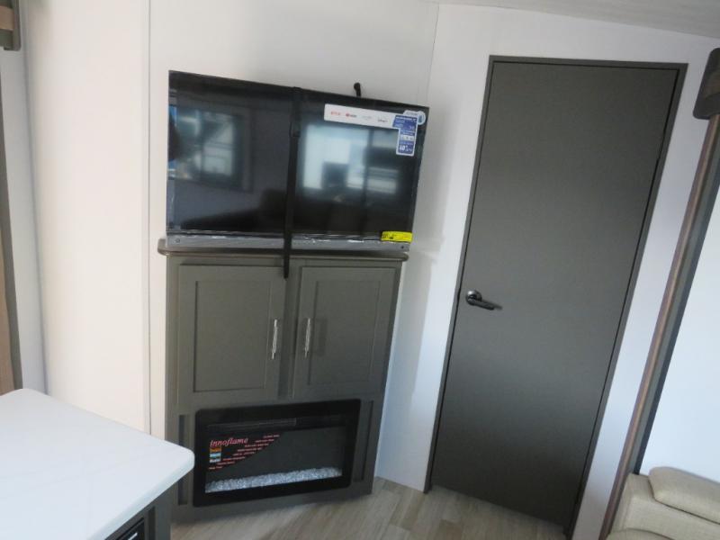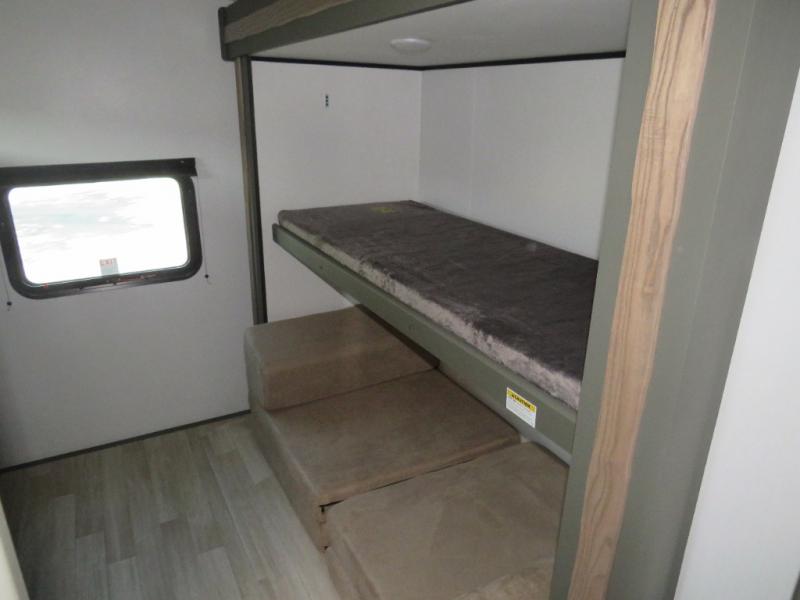 This travel trailer is one the whole gang will love! There is a rear private bunkhouse suite for your guests or the kids, plus a front master bedroom for you. The bunkhouse includes a tri-fold sofa with a flip-up bunk across from a second bunk, plus there is a half bath with its own exterior entry door! The full walk-through bath leads into the front bedroom where you'll find a queen bed and dual wardrobes to keep your room tidy. Dual opposing slides in the combined living area and kitchen will provide ample space to move about, and you will find comfy seating on the tri-fold sofa and Do-More dinette table. There is even a fireplace and an entertainment center!