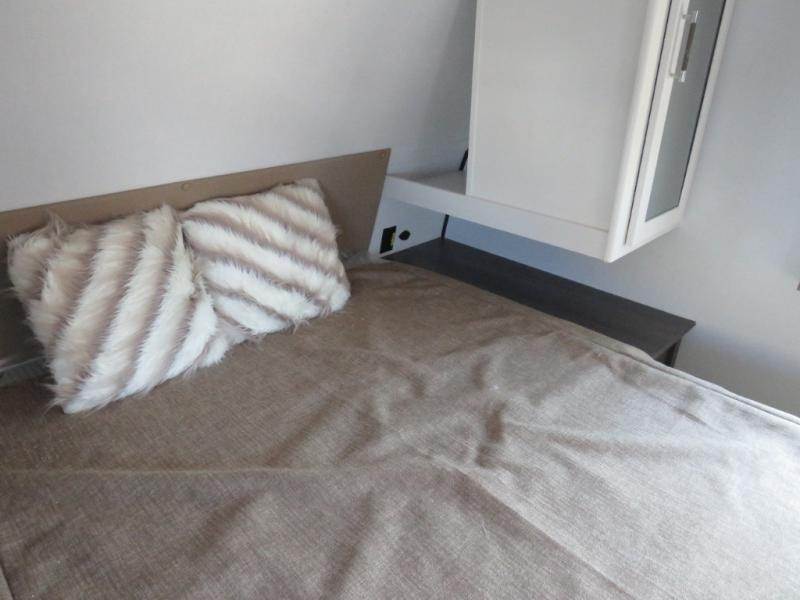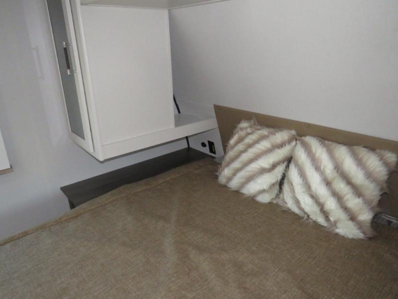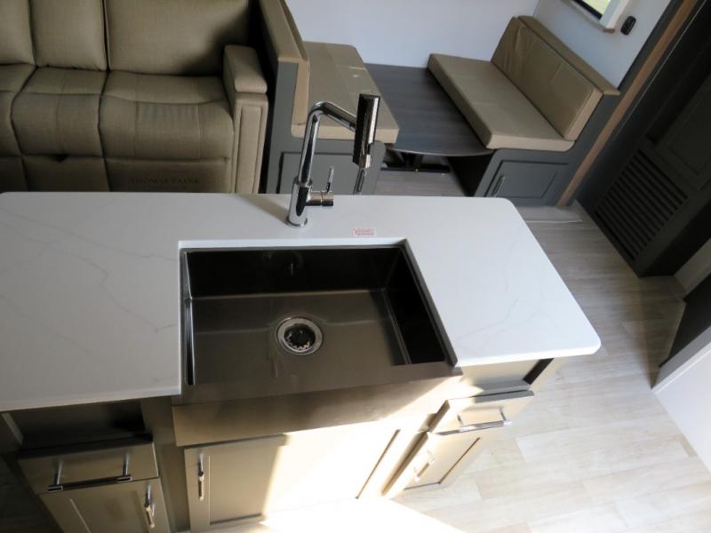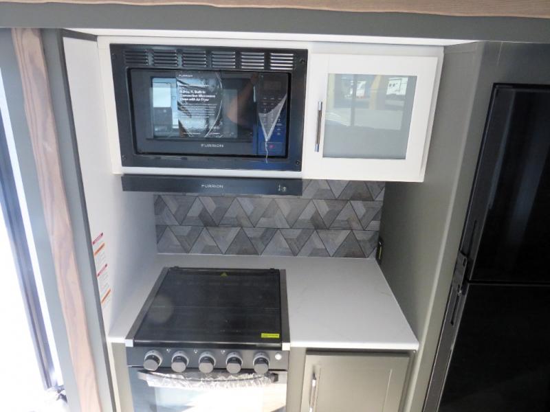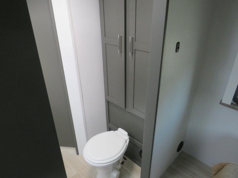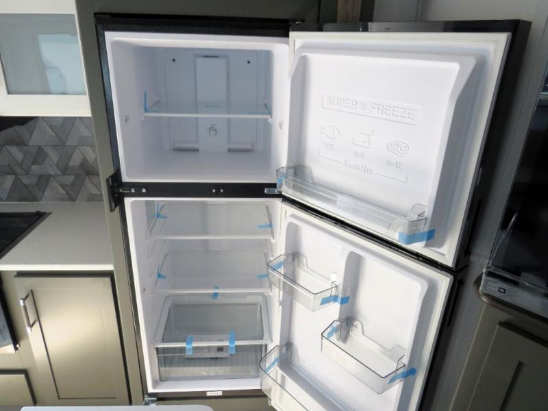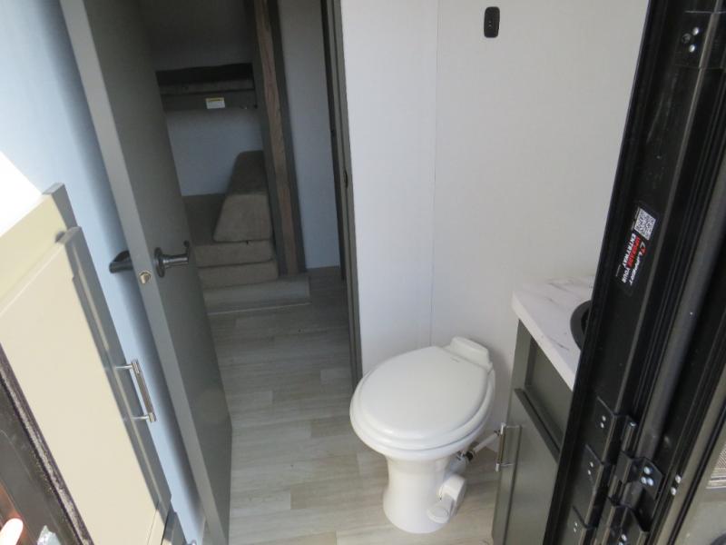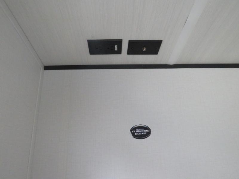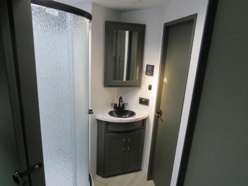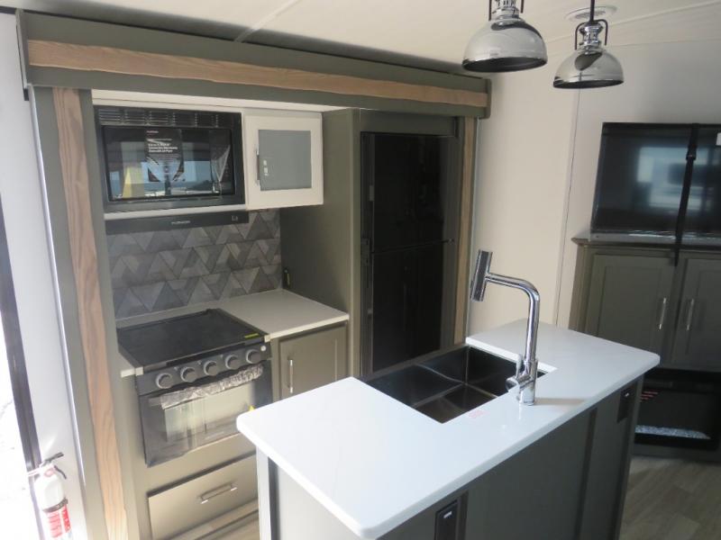 This travel trailer is one the whole gang will love! There is a rear private bunkhouse suite for your guests or the kids, plus a front master bedroom for you. The bunkhouse includes a tri-fold sofa with a flip-up bunk across from a second bunk, plus there is a half bath with its own exterior entry door! The full walk-through bath leads into the front bedroom where you'll find a queen bed and dual wardrobes to keep your room tidy. Dual opposing slides in the combined living area and kitchen will provide ample space to move about, and you will find comfy seating on the tri-fold sofa and Do-More dinette table. There is even a fireplace and an entertainment center!