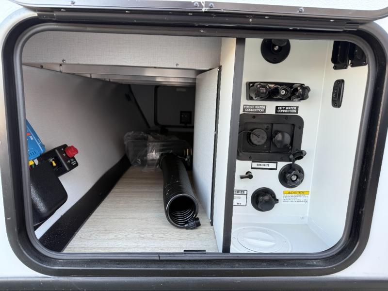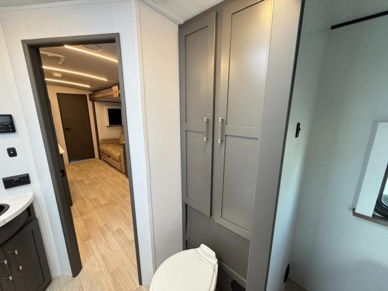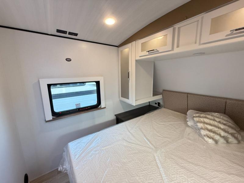 This travel trailer is one the whole gang will love! There is a rear private bunkhouse suite for your guests or the kids, plus a front master bedroom for you. The bunkhouse includes a tri-fold sofa with a flip-up bunk across from a second bunk, plus there is a half bath with its own exterior entry door! The full walk-through bath leads into the front bedroom where you'll find a queen bed and dual wardrobes to keep your room tidy. Dual opposing slides in the combined living area and kitchen will provide ample space to move about, and you will find comfy seating on the tri-fold sofa and Do-More dinette table. There is even a fireplace and an entertainment center!